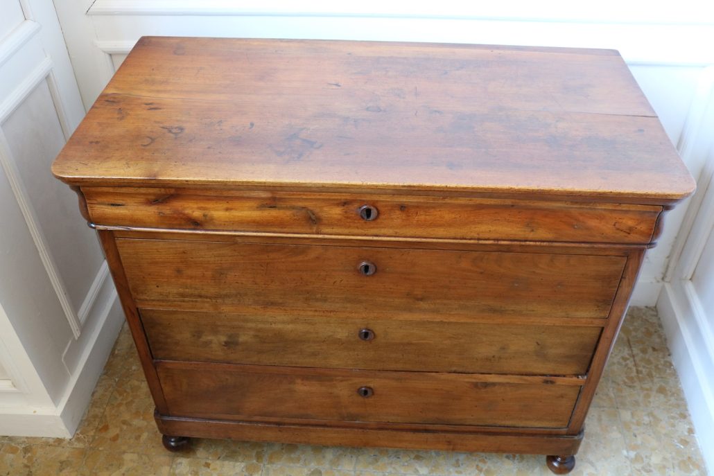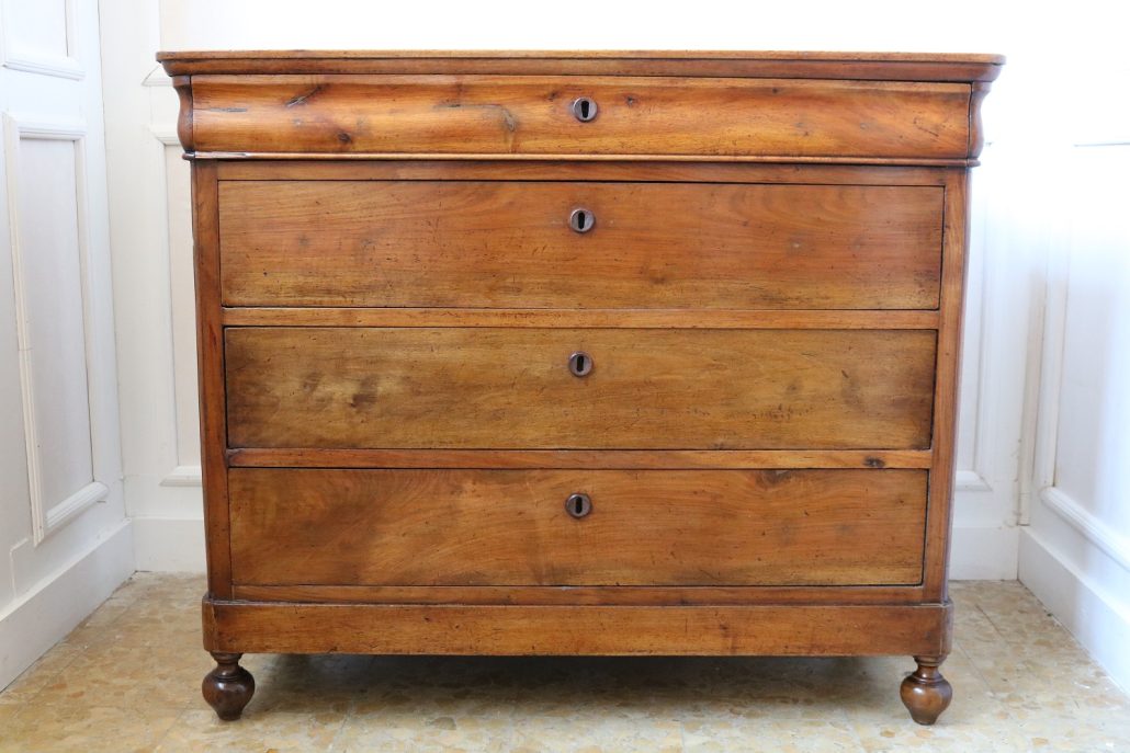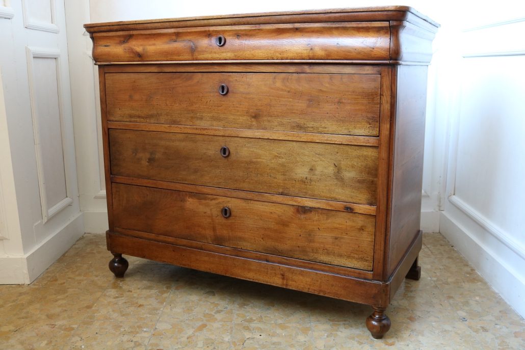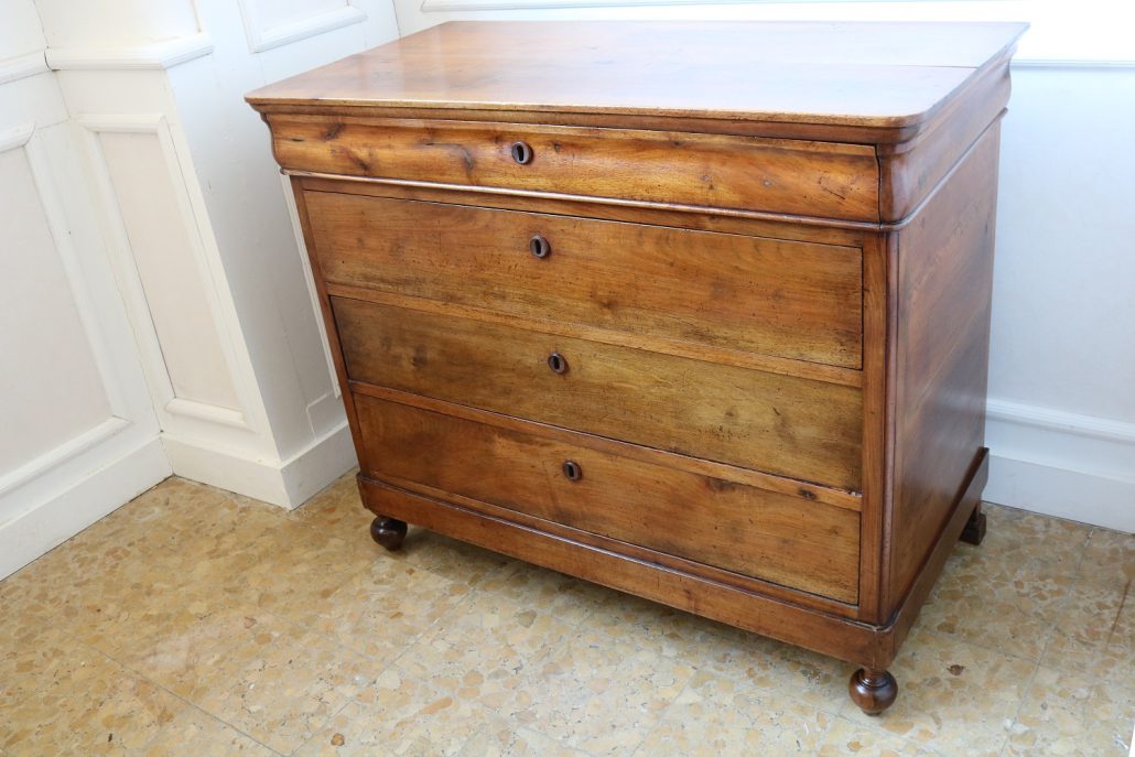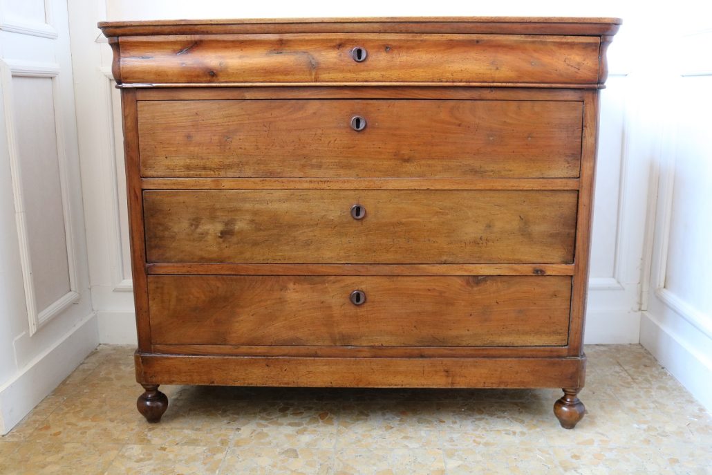 Cassettone Luigi Filippo in noce. Quattro cassetti, muniti di serratura, di cui uno più piccolo, sotto piano, con la tipica sagoma a tulipano che corre anche lungo i fianchi. Piedi a bulbo e fascia liscia nella parte inferiore. Il mobile si caratterizza per linee morbide e delicate, la mancanza di spigoli pone in risalto una ricercata armonia di disegno, mentre la decorazione minima enfatizza la bella essenza di noce dal colore mielato. Di pregiata fattura, con sezioni piuttosto importanti, questo arredo risulta massiccio e solido, ma leggero e delicato al tempo stesso.