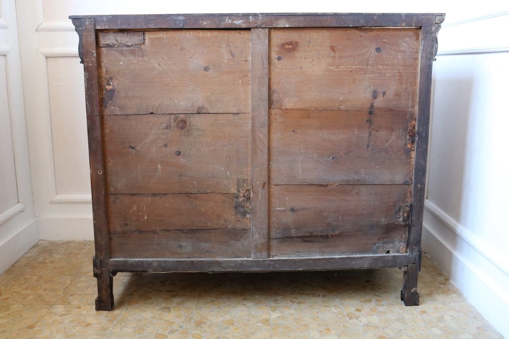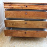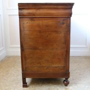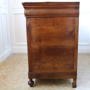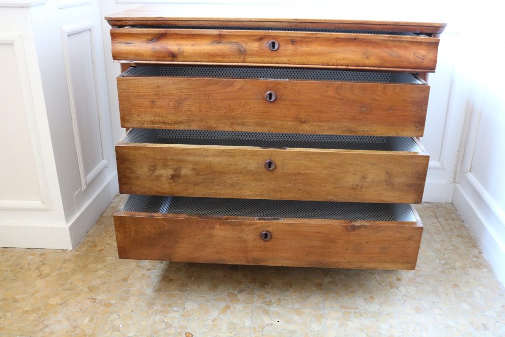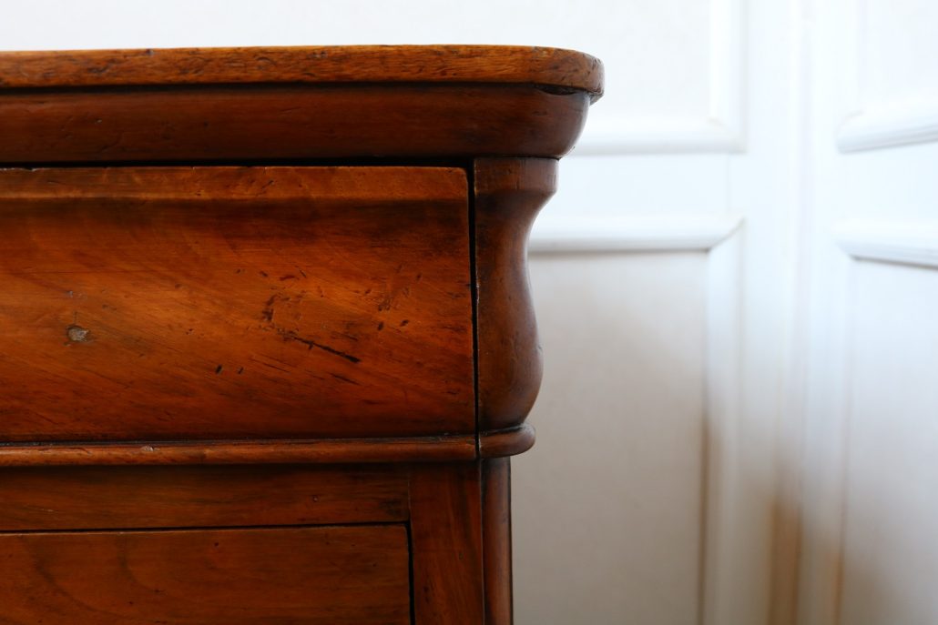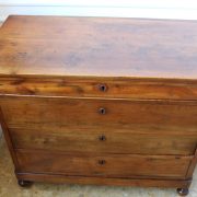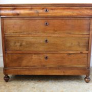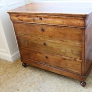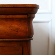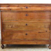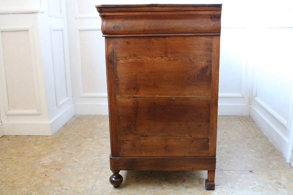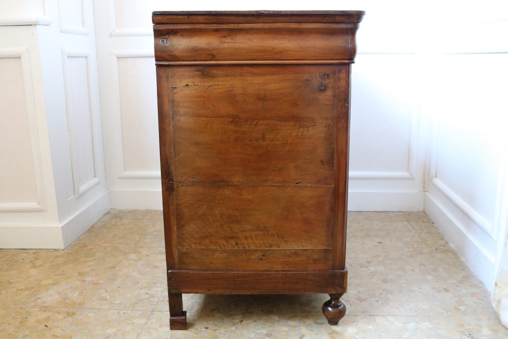 Cassettone Luigi Filippo in noce. Quattro cassetti, muniti di serratura, di cui uno più piccolo, sotto piano, con la tipica sagoma a tulipano che corre anche lungo i fianchi. Piedi a bulbo e fascia liscia nella parte inferiore. Il mobile si caratterizza per linee morbide e delicate, la mancanza di spigoli pone in risalto una ricercata armonia di disegno, mentre la decorazione minima enfatizza la bella essenza di noce dal colore mielato. Di pregiata fattura, con sezioni piuttosto importanti, questo arredo risulta massiccio e solido, ma leggero e delicato al tempo stesso.