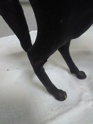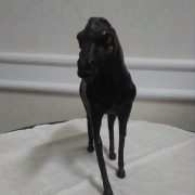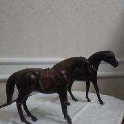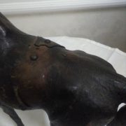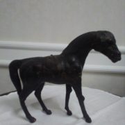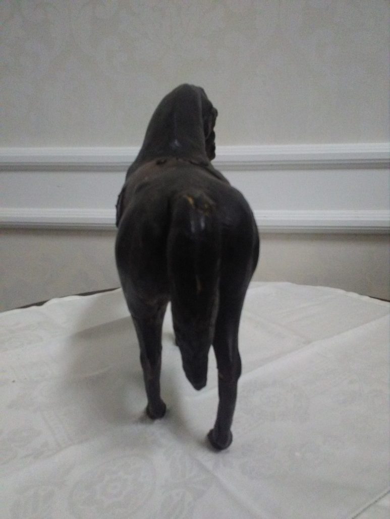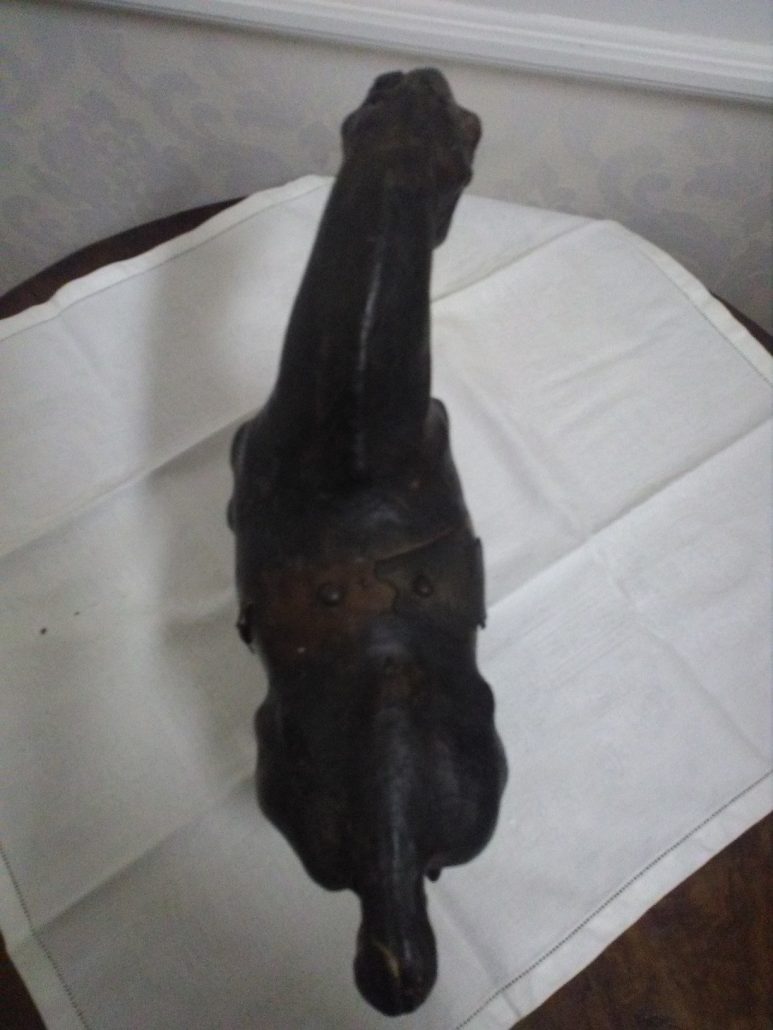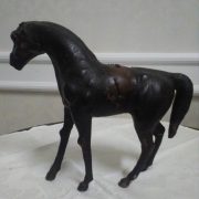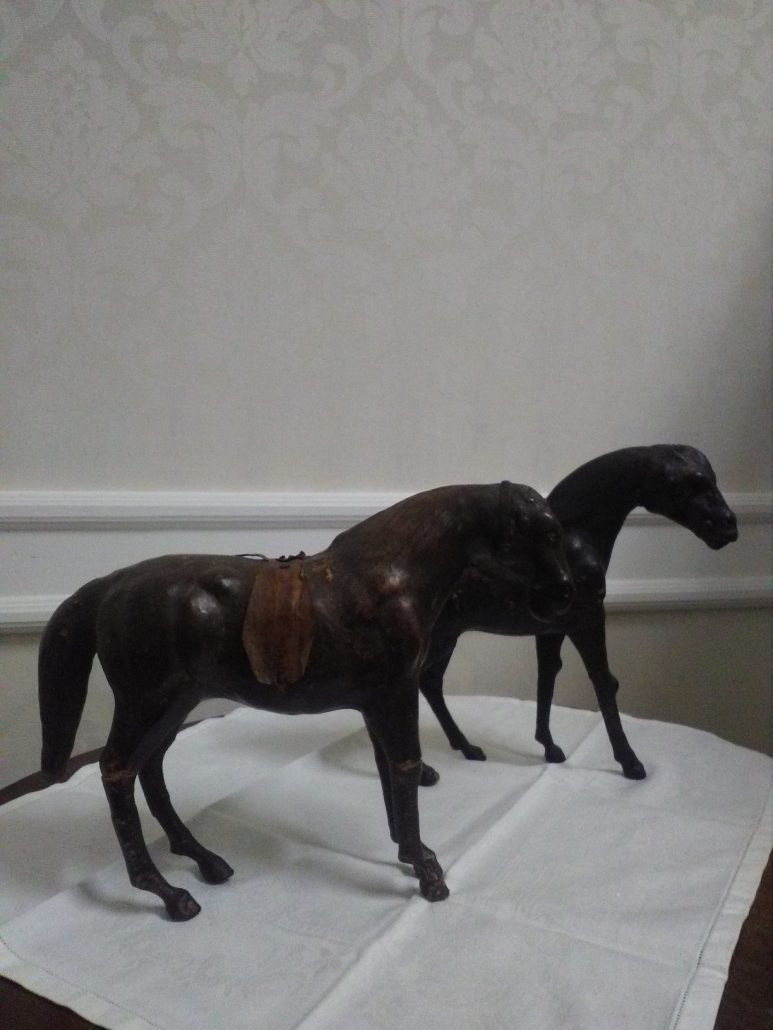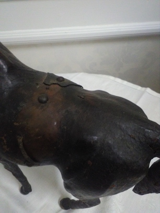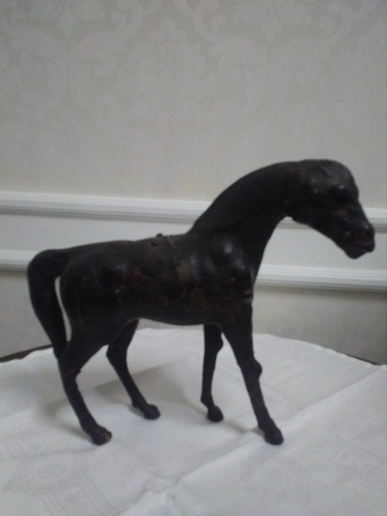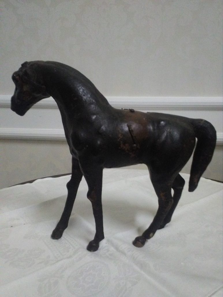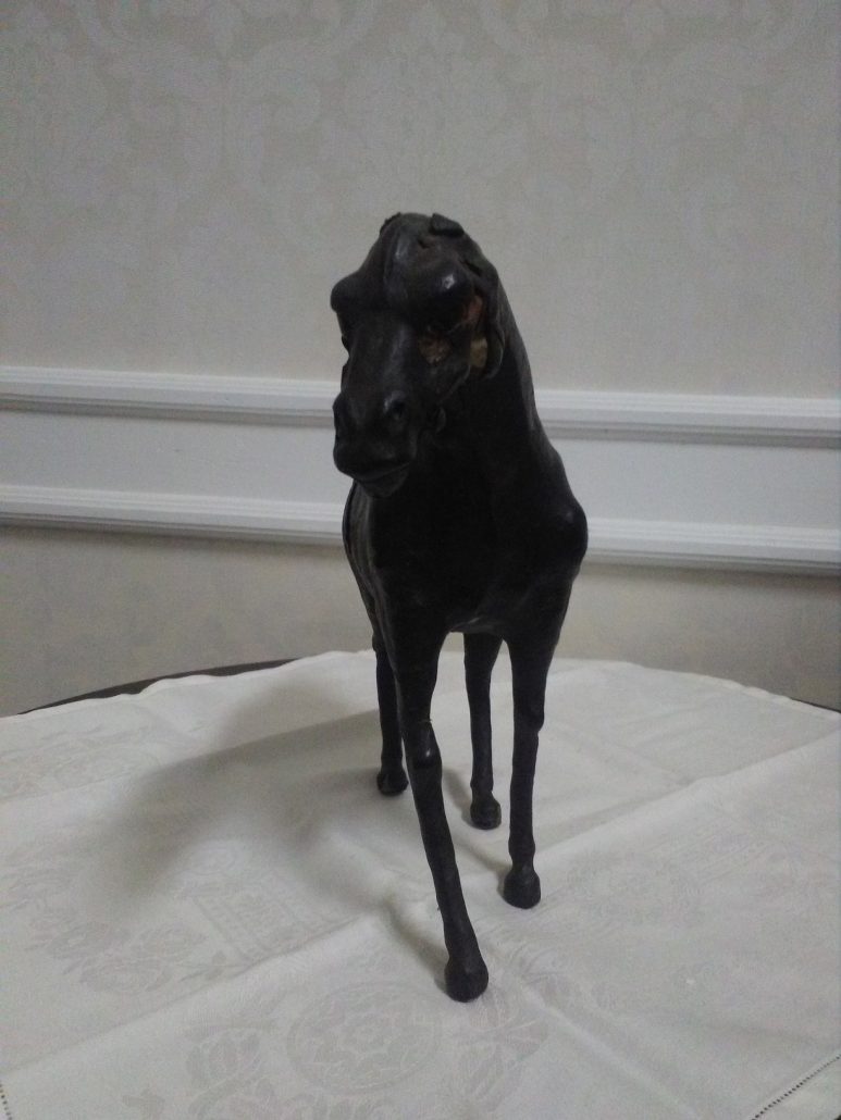 Cavallino giocattolo. Balocco in papier-machè (cartapesta) rivestito in pelle con finimenti (porzioni) in pelle più chiara. Di proporzioni fedeli alla realtà l’animale, è immortalato in posizione ferma. Emblema e simbolo del giocattolo del XIX Secolo, era presente in tutte le camere di infanti.