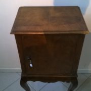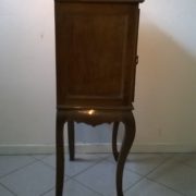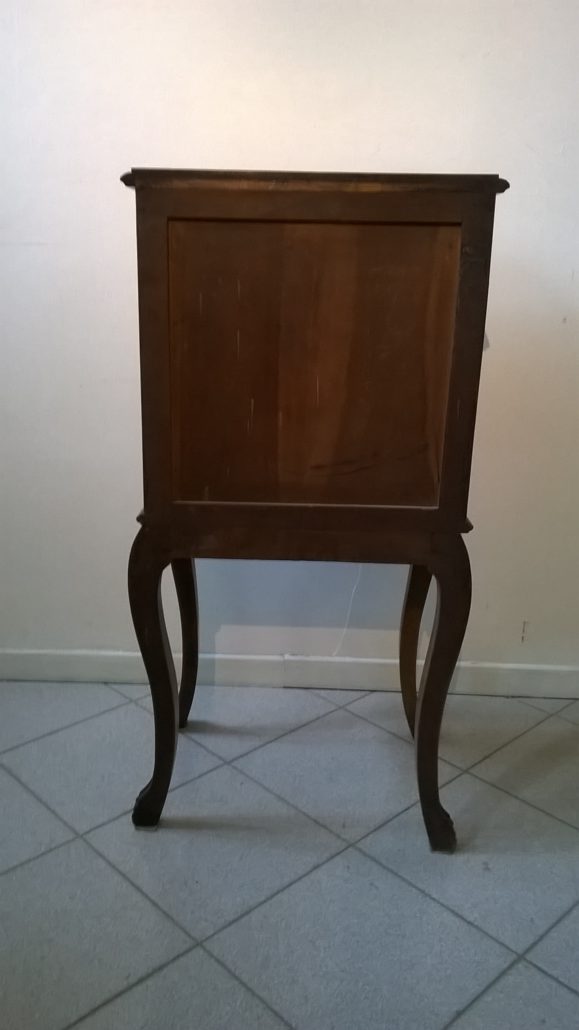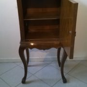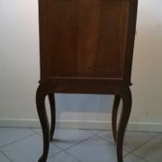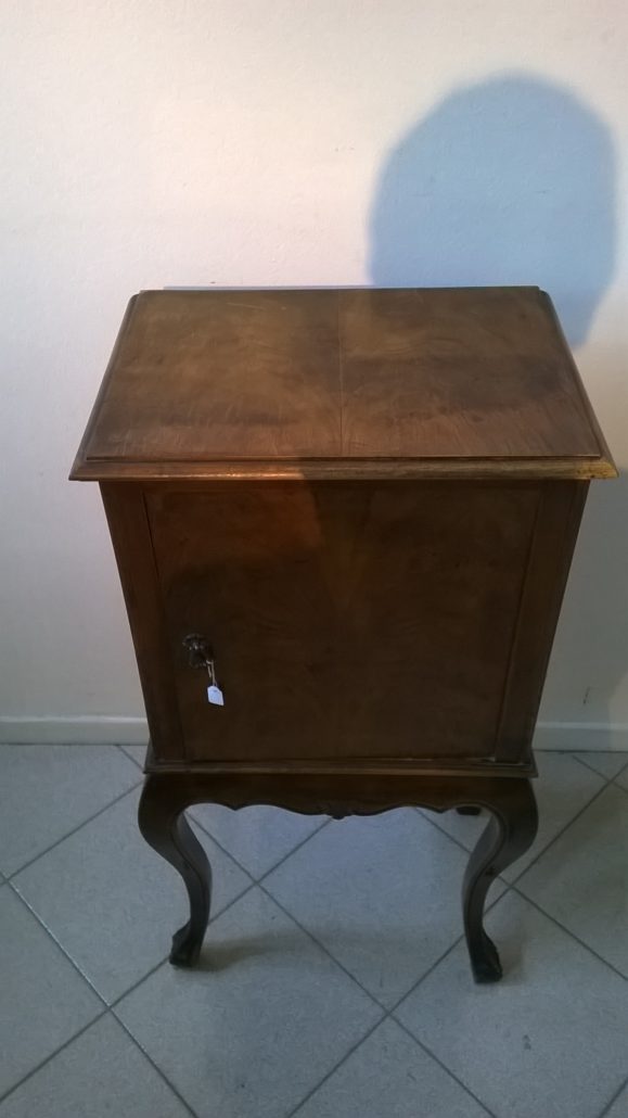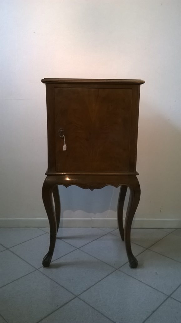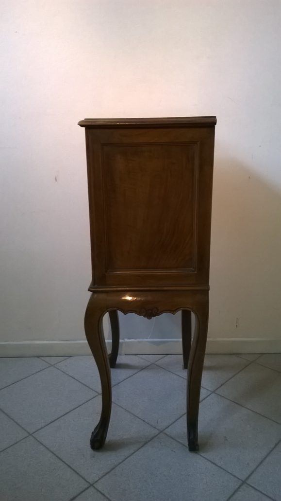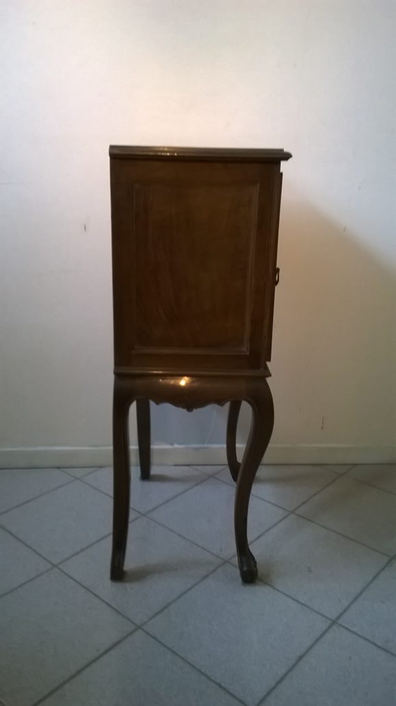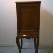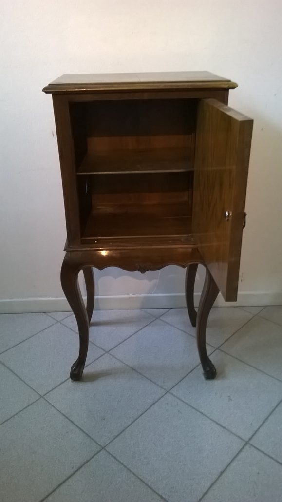 Comodino in legno di noce ad una anta, composto da un parallelepipedo ad un anta ingentilito da un leggero grembiale e sostenuto da quattro alte gambe mosse.