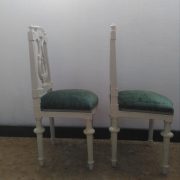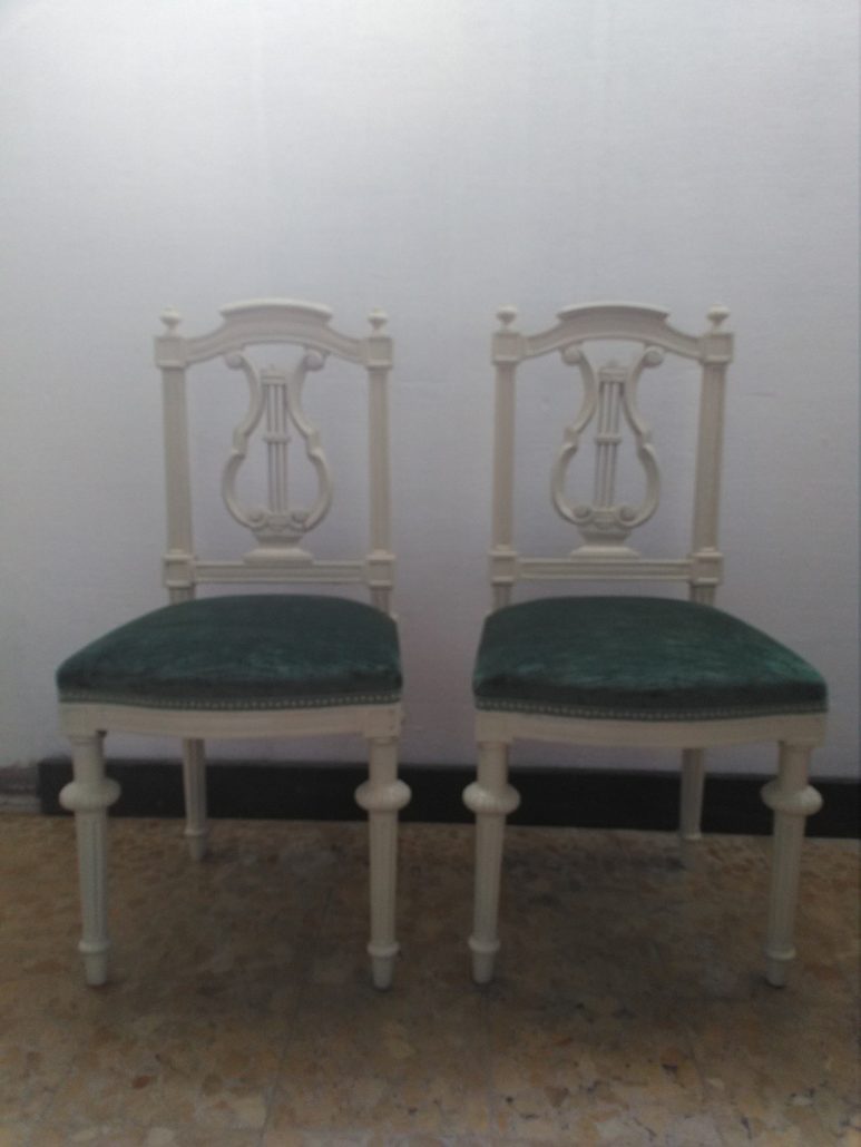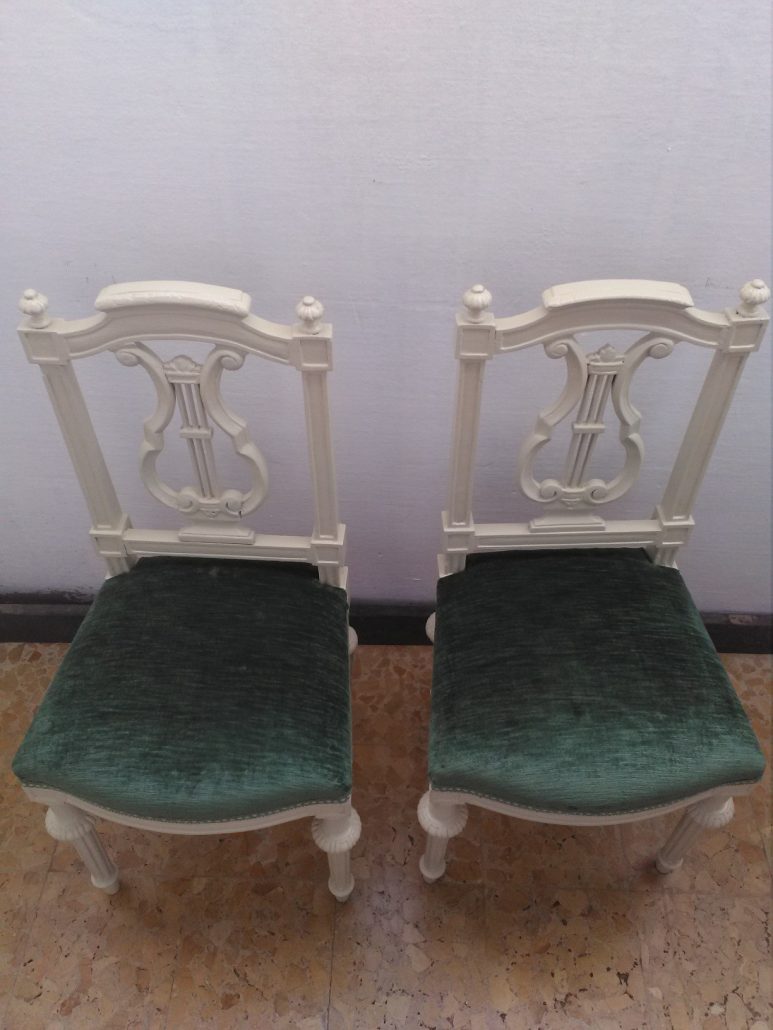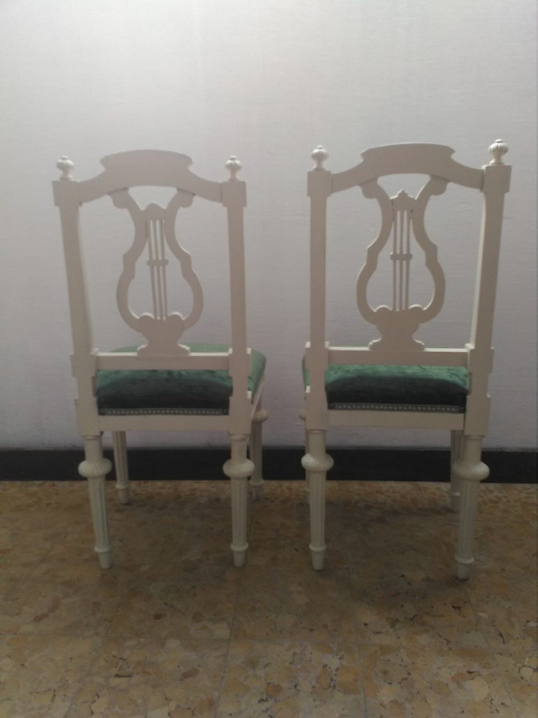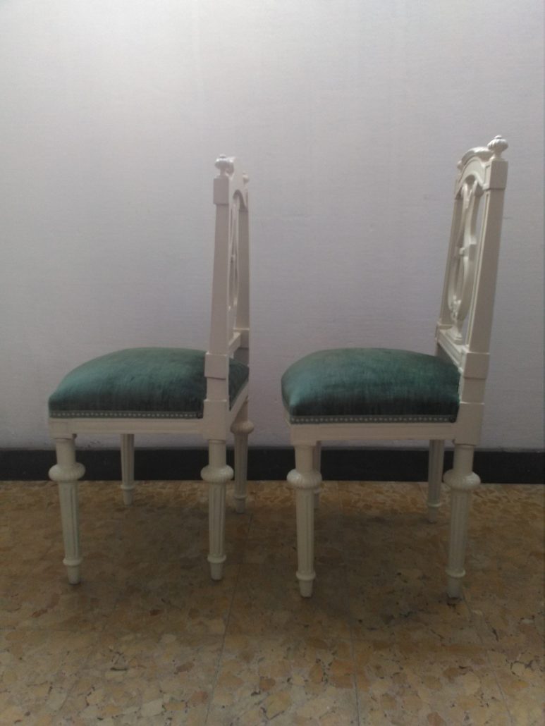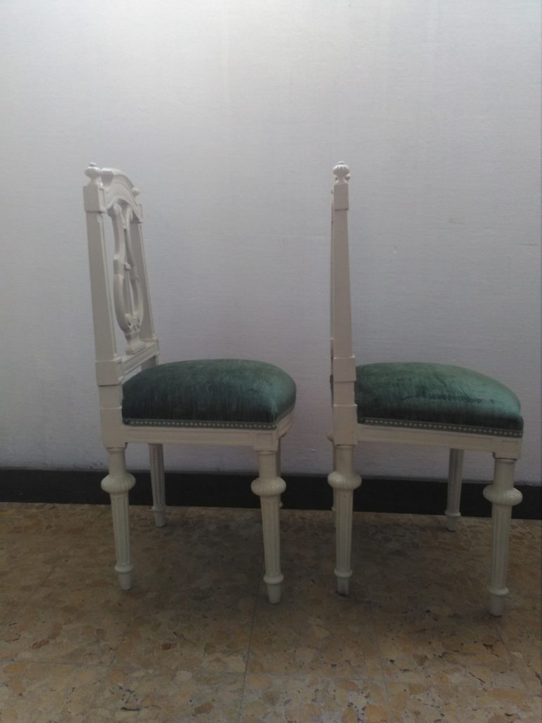 Coppia di sedie laccate . Schienale a giorno decorato da una cartella centrale a foggia di lira . Sedile imbottito e rivestito in velluto di lino verde. Gambe tronco-coniche rovesciate,rastremate desinenti in puntale con collare scanalato inprossimità al dado di accordo con il sedile. L’ elegante decorazione dello schienale , la medesima lavorazione presente in tutte e quattro le gambe ripropone i più classici modelli neoclassici del Luigi XVI, ancor più alleggeriti dalla laccatura bianca. Questi arredi quindi presentano una leggerezza e raffinatezza di grande gusto.
