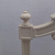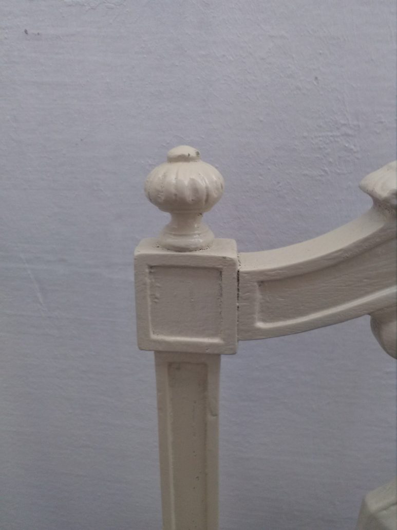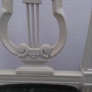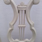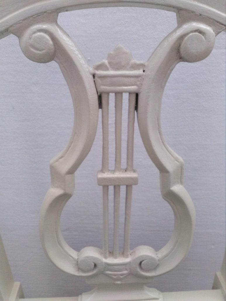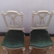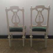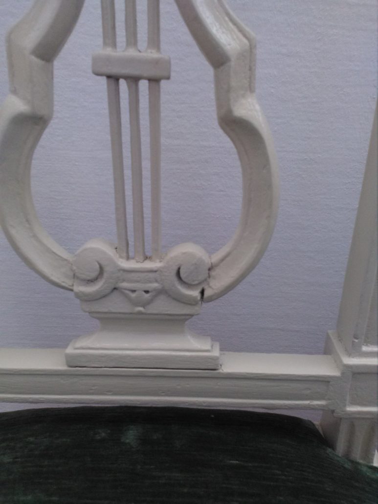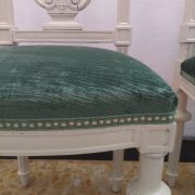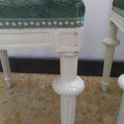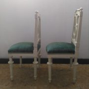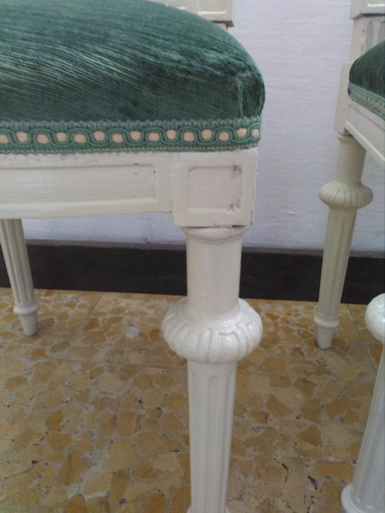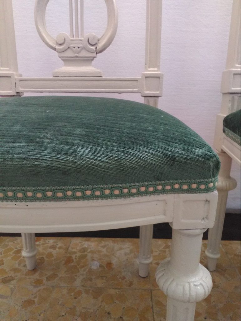 Coppia di sedie laccate . Schienale a giorno decorato da una cartella centrale a foggia di lira . Sedile imbottito e rivestito in velluto di lino verde. Gambe tronco-coniche rovesciate,rastremate desinenti in puntale con collare scanalato inprossimità al dado di accordo con il sedile. L’ elegante decorazione dello schienale , la medesima lavorazione presente in tutte e quattro le gambe ripropone i più classici modelli neoclassici del Luigi XVI, ancor più alleggeriti dalla laccatura bianca. Questi arredi quindi presentano una leggerezza e raffinatezza di grande gusto.