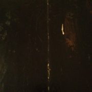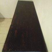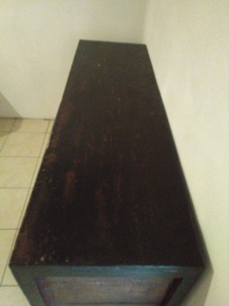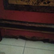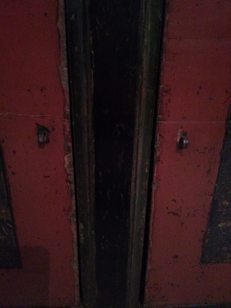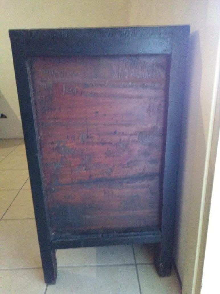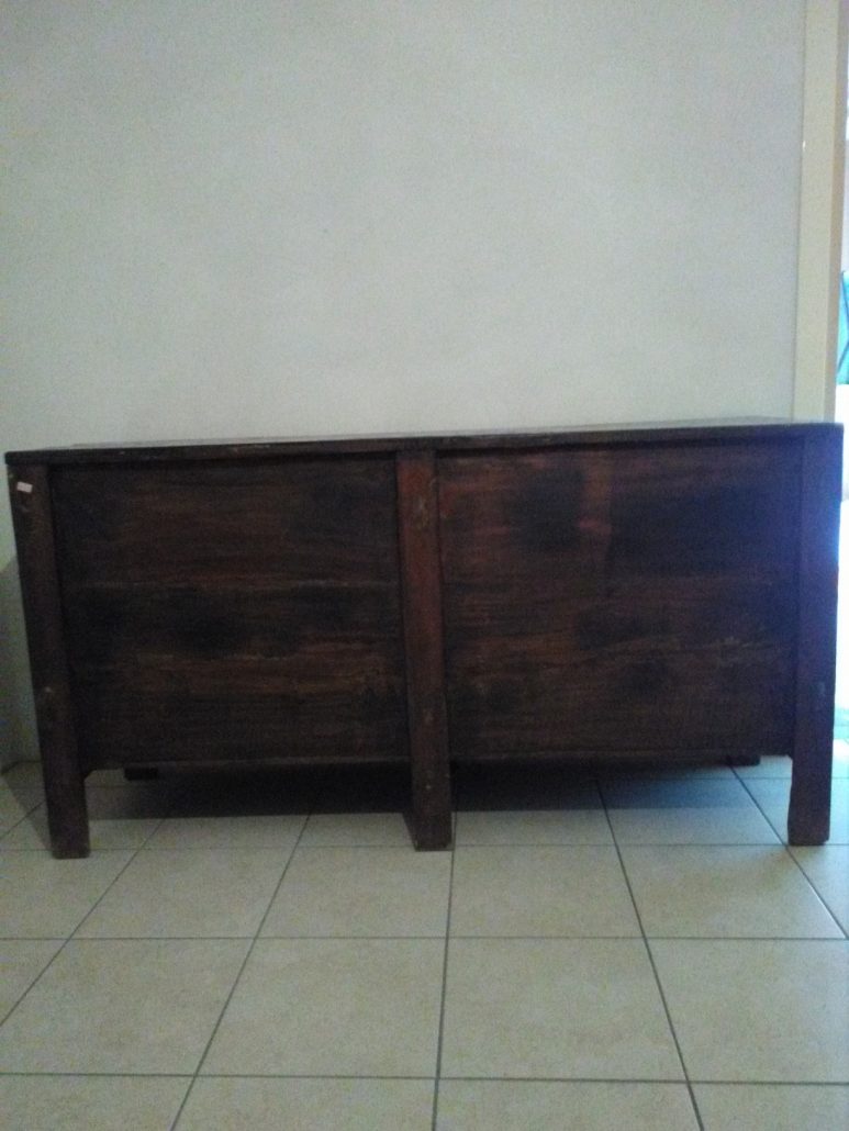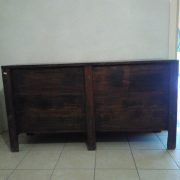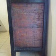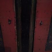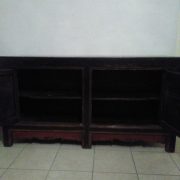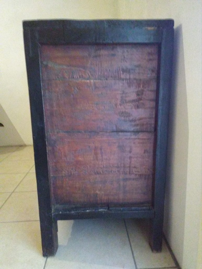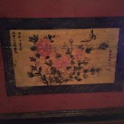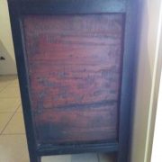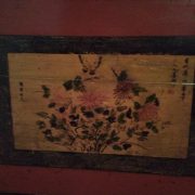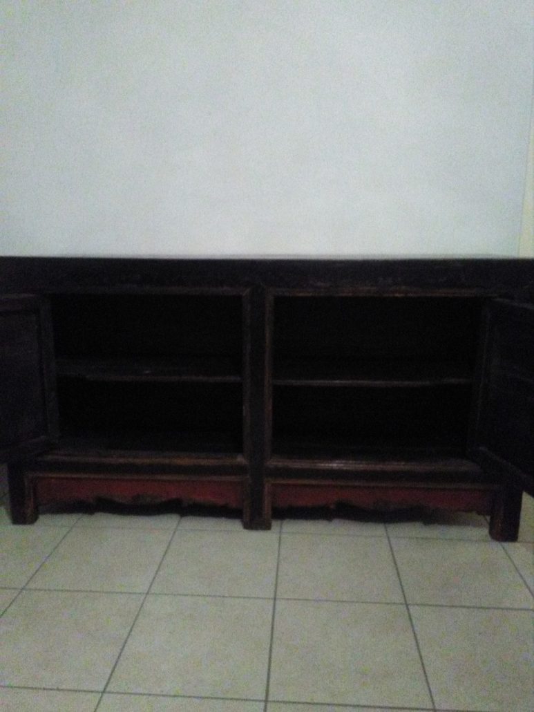 Credenza cinese in legno laccato , composta da due ante sulle quali campeggiano due riserve gialle con motivi floreali dipini incorniciati da una laccatura rossa. Il resto del mobile è laccato in nero.