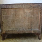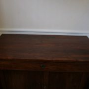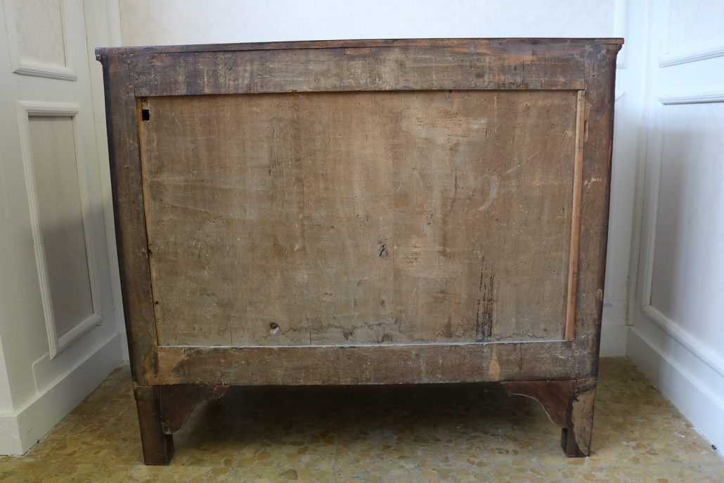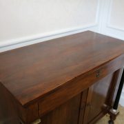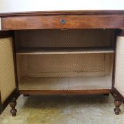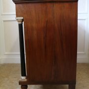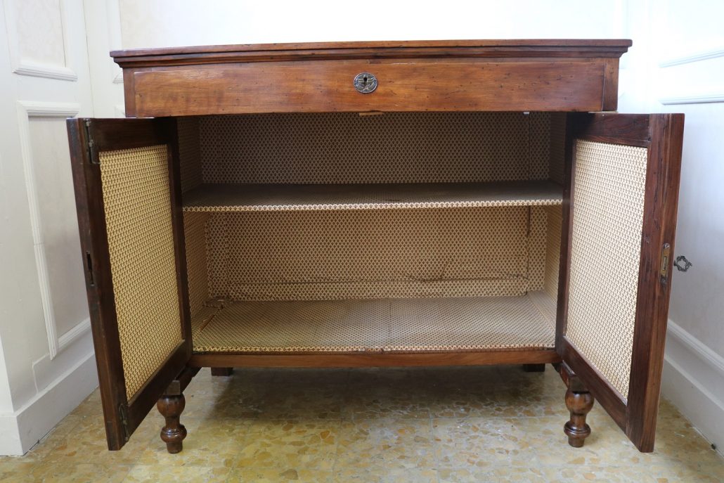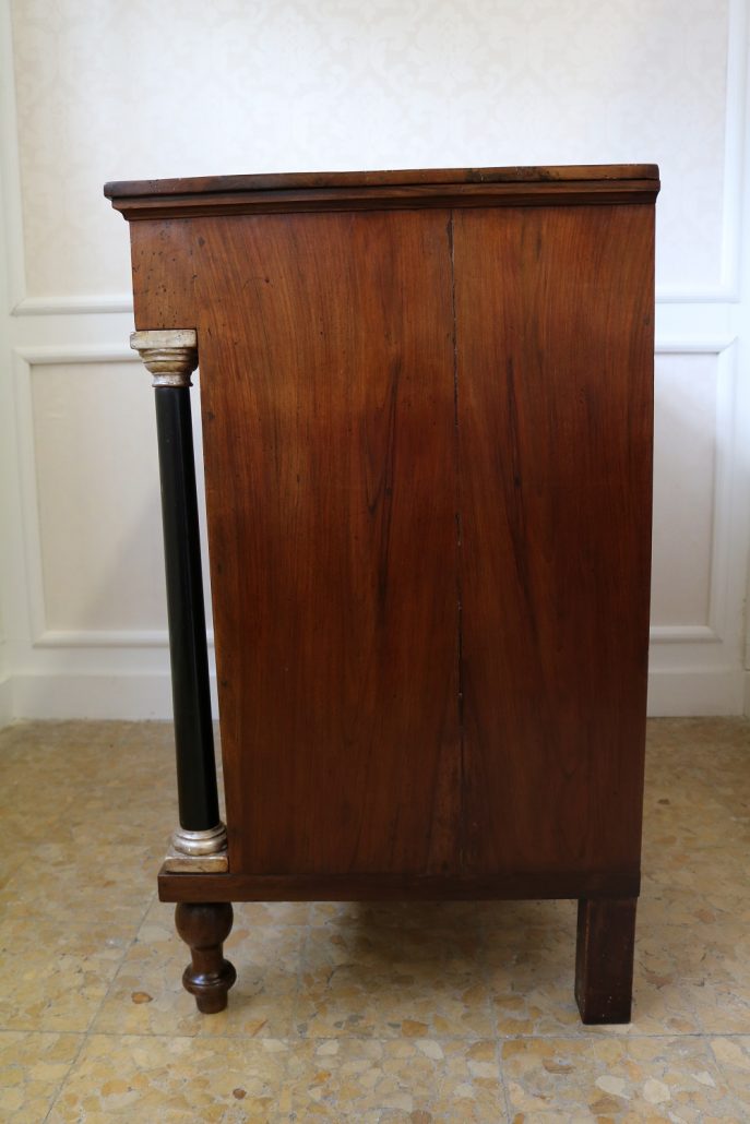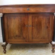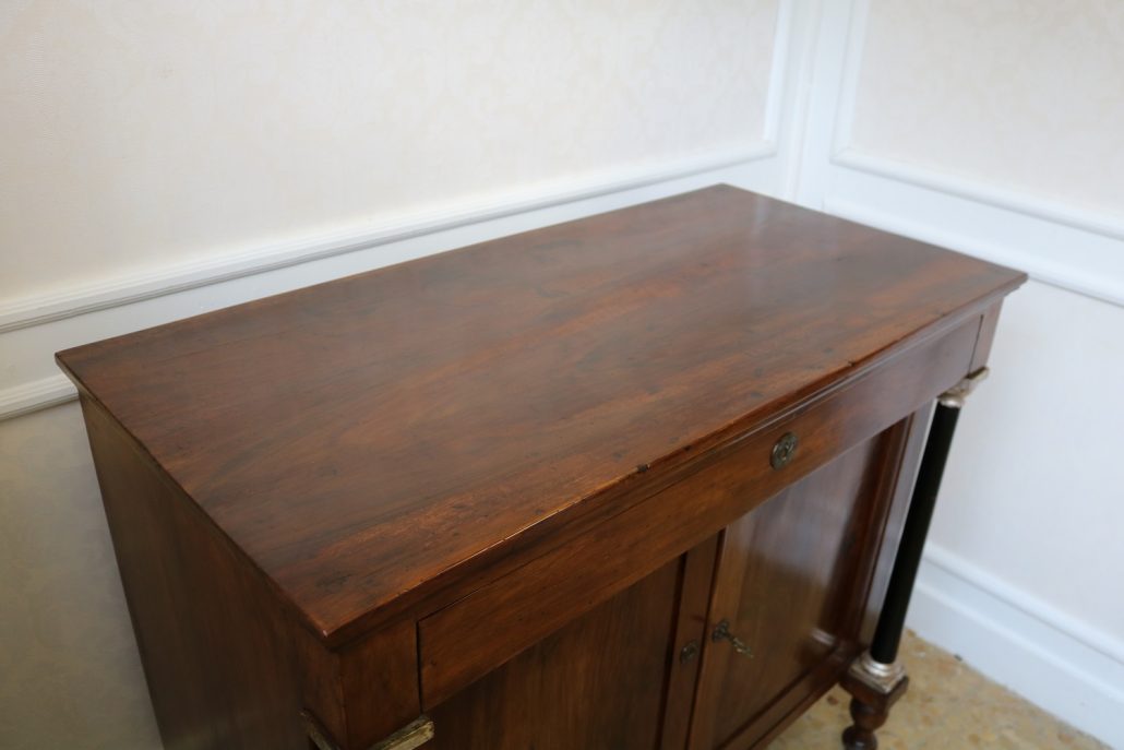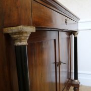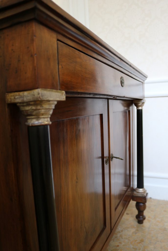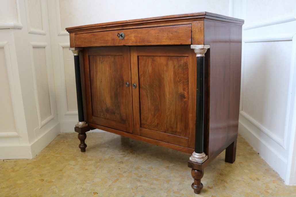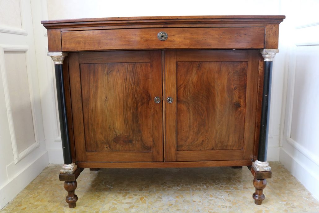 Credenza in noce. Arredo composto da due ante, munite di serratura, racchiuse da due colonne ebanizzate con capitelli e basi in legno dorato. Alta fascia sostenuta da piedi a plinto. A foggia di architrave, sostenuto dalle colonne sopra descritte, un grande cassetto, munito di serratura ed infine piano leggermente aggettante. Il mobile di bella fattura attraverso decorazioni architettoniche riprende tutti gli stilemi dello stile Impero. Le linee rette e l’austerità della composizione sono ingentiliti dalle dimensioni e dai particolari, come i capitelli, o la bella venatura scelta della nobile essenza di noce. Interni foderati con carta a giglio marrone.