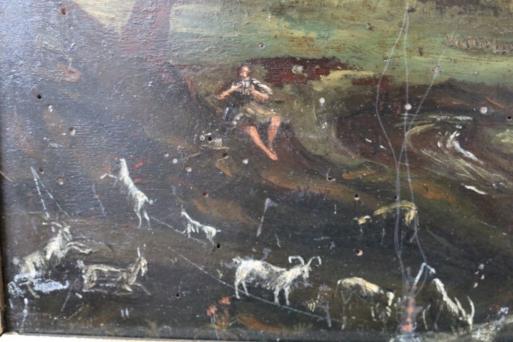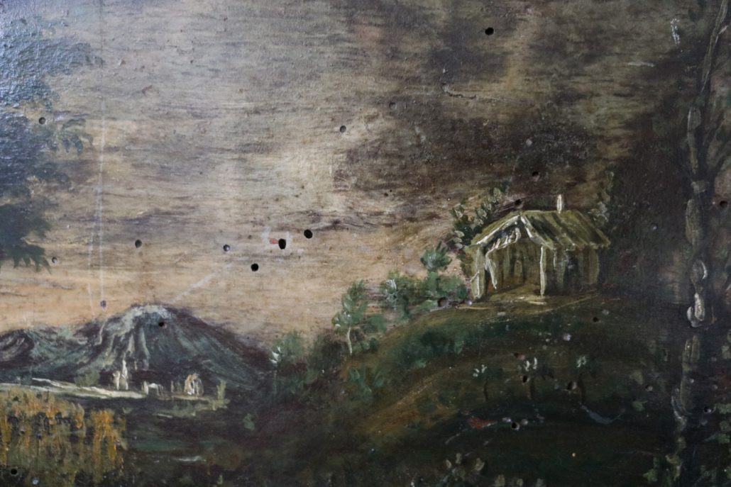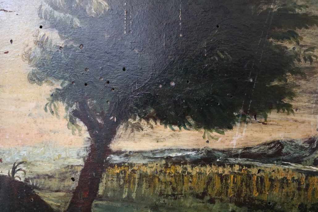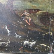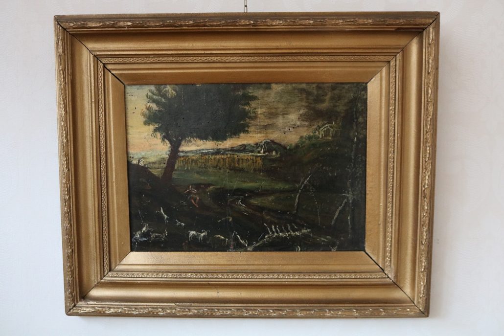 Dipinto, olio su tavola, “Pastorello con armenti”. Quadro raffigurante un pastorello seduto sull’erba, all’ombra di un maestoso albero, intento a suonare un flauto mentre un piccolo gregge di capri pascola tranquillamente sulle rive di un ruscello. Il dipinto, di fantasia, si ispira sicuramente ad opere più importanti del XVIII secolo, dove le rappresentazioni della vita contadina quotidiana, venivano raffigurate in un mondo idilliaco privo di fatica e povertà, lontano da ciò che era realmente, ma quasi invidiato dalle classi abbienti per la semplicità della vita stessa che ne scaturiva. L’opera di mano piuttosto ingenua, trasmette comunque ciò che sopra abbiamo citato.