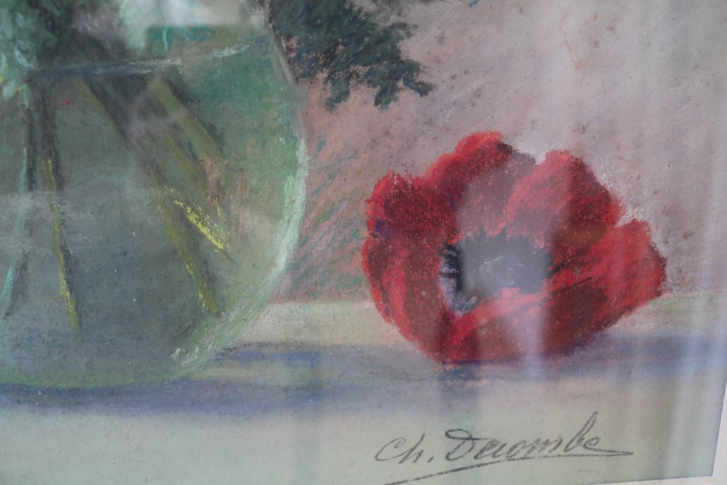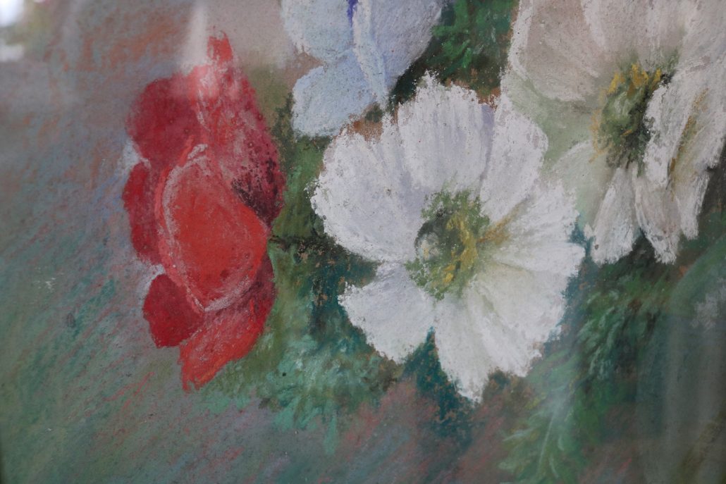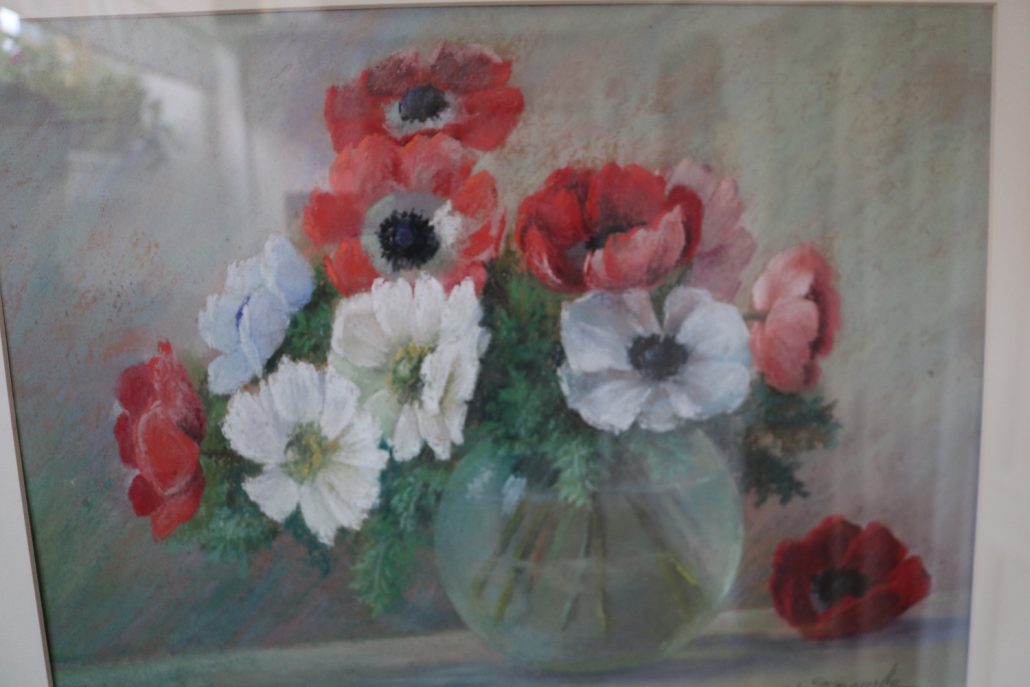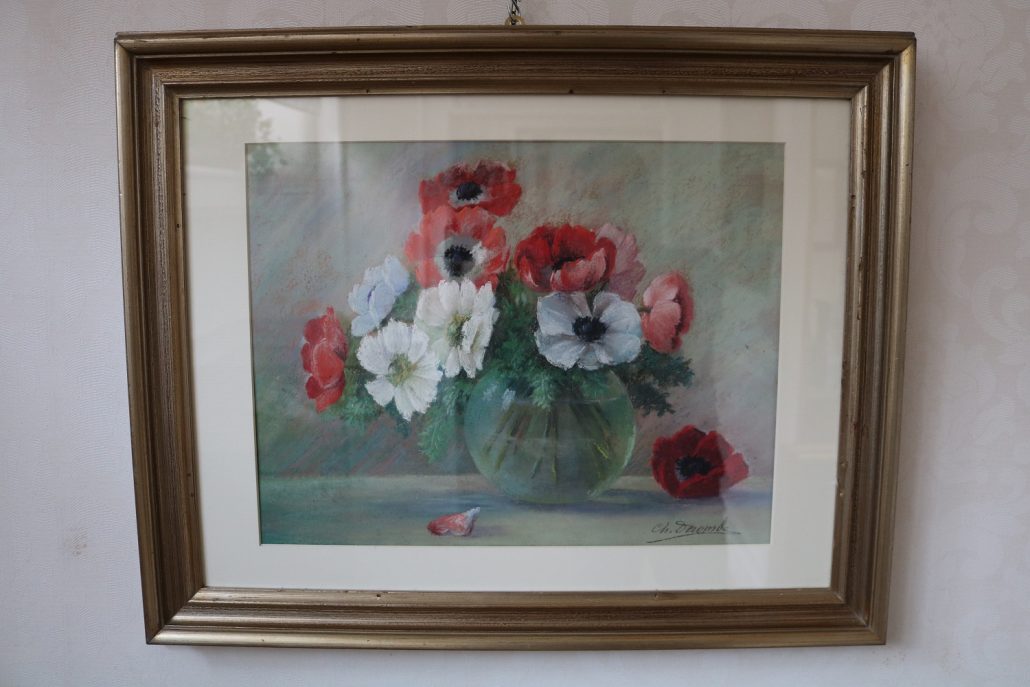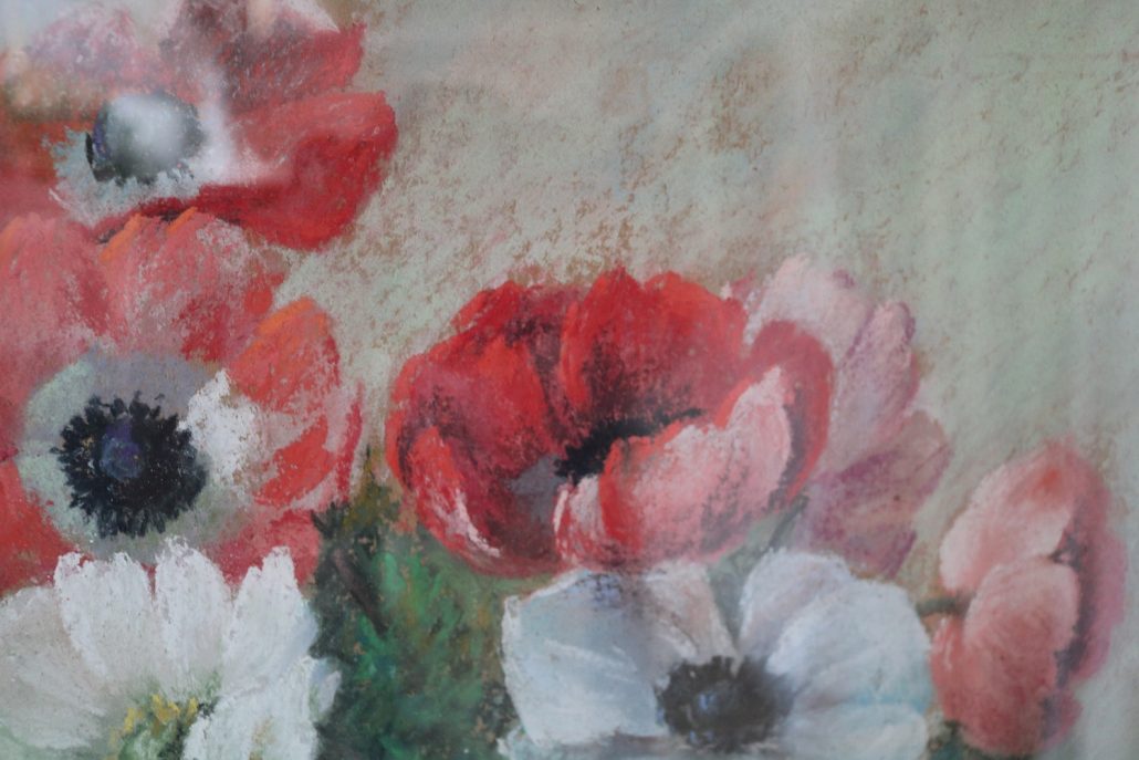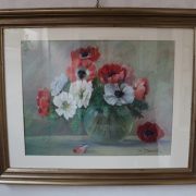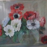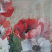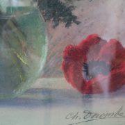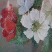 Dipinto “vaso di papaveri”, tecnica carboncino su carta. L’opera ritrae un vaso dalla forma tondeggiante in vetro dalle belle trasparenze, contenente una composizione di papaveri recisi nei toni del rosso e del bianco con lumeggiature di azzurro. Il dipinto appare vivace tramite l’utilizzo di una tavolozza cromatica accesa ma rimane alquanto delicato grazie alla tecnica pittorica del carboncino. Il quadro molto realistico, si ispira, nella sua composizione, ai dipinti più antichi con quella classica nota nostalgica del fiore caduto pochi istanti prima di essere immortalato e adagiato sul piano “ancora in vita ma per breve tempo”. Il dipinto risulta di grande effetto e piacevole impatto visivo.
