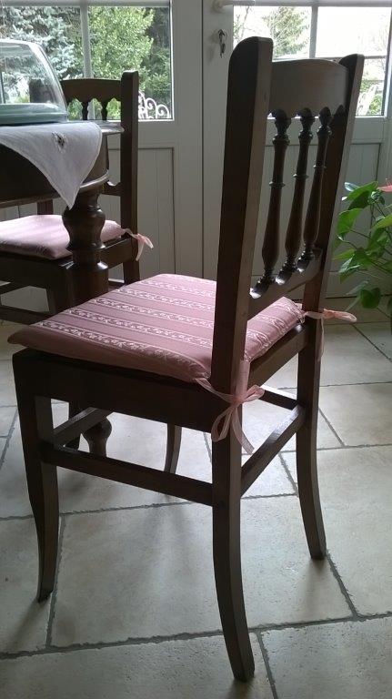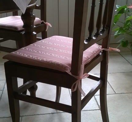 Laccetti per fermare il cuscino ai montanti della sedia confezionati con il medesimo tessuto.