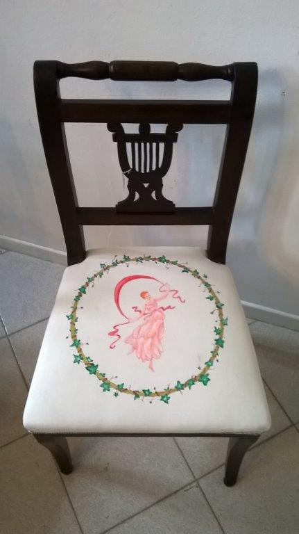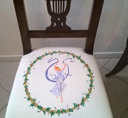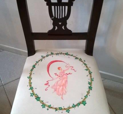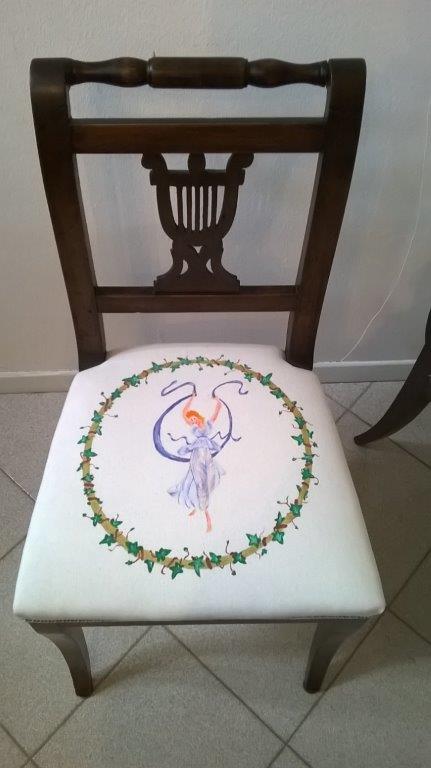 Rivestimento dei sedili di due sedie con tessuto in cotone bianco dipinto a mano con colori dai toni pastello di “danzatrici etrusche” ispirate a incisioni del Canova, grande scultore e decoratore di epoca neoclassica.