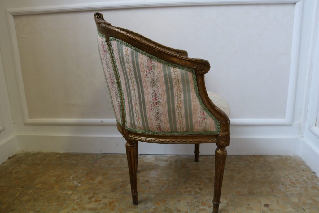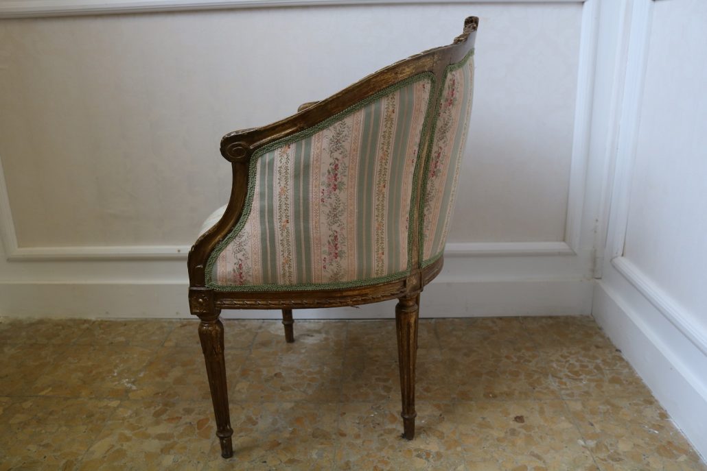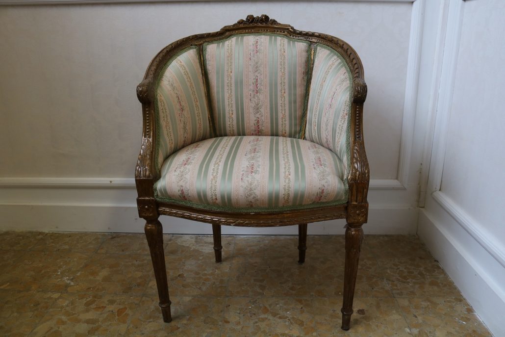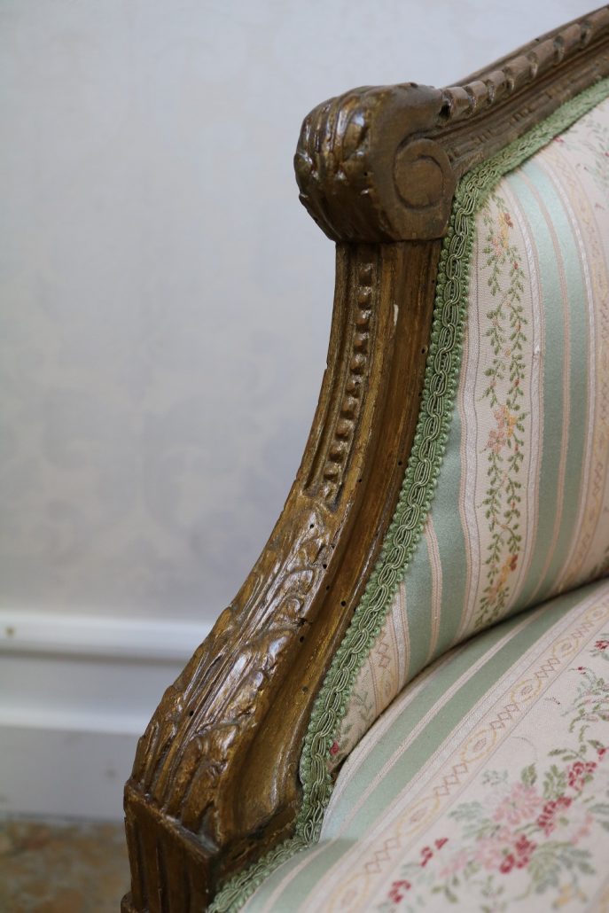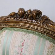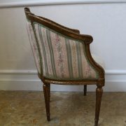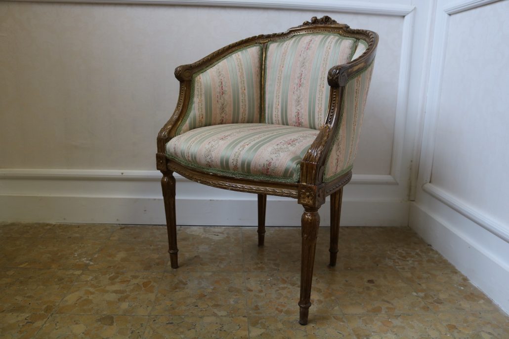 Poltroncina cabriolè in legno dorato di gusto Luigi XVI. La seduta si compone di quattro gambe troncoconiche rovesciate con collarino, fascia intagliata a nastro, braccioli con foglie e volute e schienale che ripropone il motivo a nastro arricchito nella parte centrale, da un intaglio di delicati mazzetti di rose. La seduta di grande raffinatezza composita si ispira sicuramente agli arredi prodotti per la corte francese. Sia il modello infatti che l’intaglio, cosi minuto e delicato era prerogativa francese. La metodologia di costruzione, il tipo di doratura invece presentano una tecnica del secolo successivo. La poltroncina è quindi stata prodotta nello stile Luigi XVI francese, come detto, ma nella seconda metà del XIX Secolo. Era infatti di gran moda in questo periodo arredare intere sale riproponendo uno stile del passato.