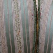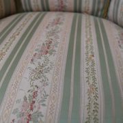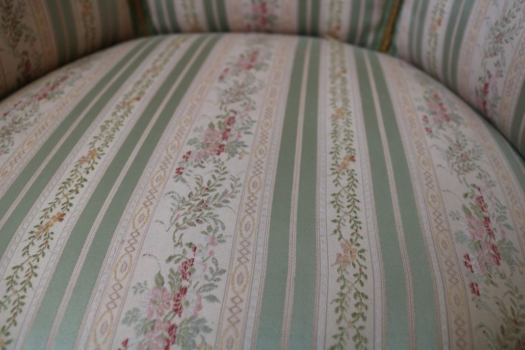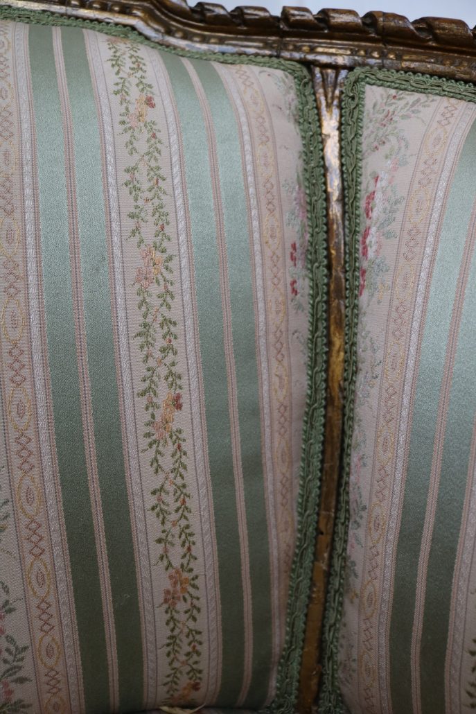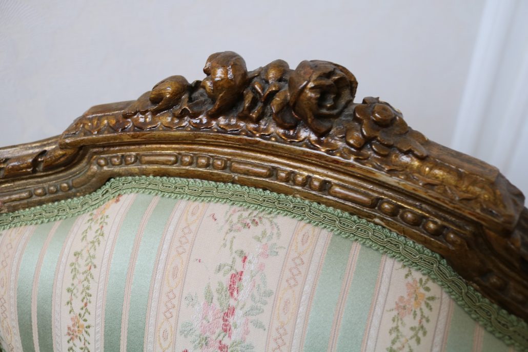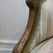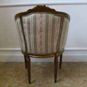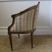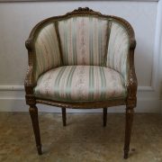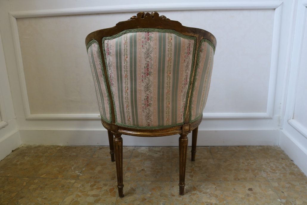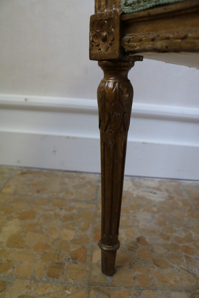 Poltroncina cabriolè in legno dorato di gusto Luigi XVI. La seduta si compone di quattro gambe troncoconiche rovesciate con collarino, fascia intagliata a nastro, braccioli con foglie e volute e schienale che ripropone il motivo a nastro arricchito nella parte centrale, da un intaglio di delicati mazzetti di rose. La seduta di grande raffinatezza composita si ispira sicuramente agli arredi prodotti per la corte francese. Sia il modello infatti che l’intaglio, cosi minuto e delicato era prerogativa francese. La metodologia di costruzione, il tipo di doratura invece presentano una tecnica del secolo successivo. La poltroncina è quindi stata prodotta nello stile Luigi XVI francese, come detto, ma nella seconda metà del XIX Secolo. Era infatti di gran moda in questo periodo arredare intere sale riproponendo uno stile del passato.