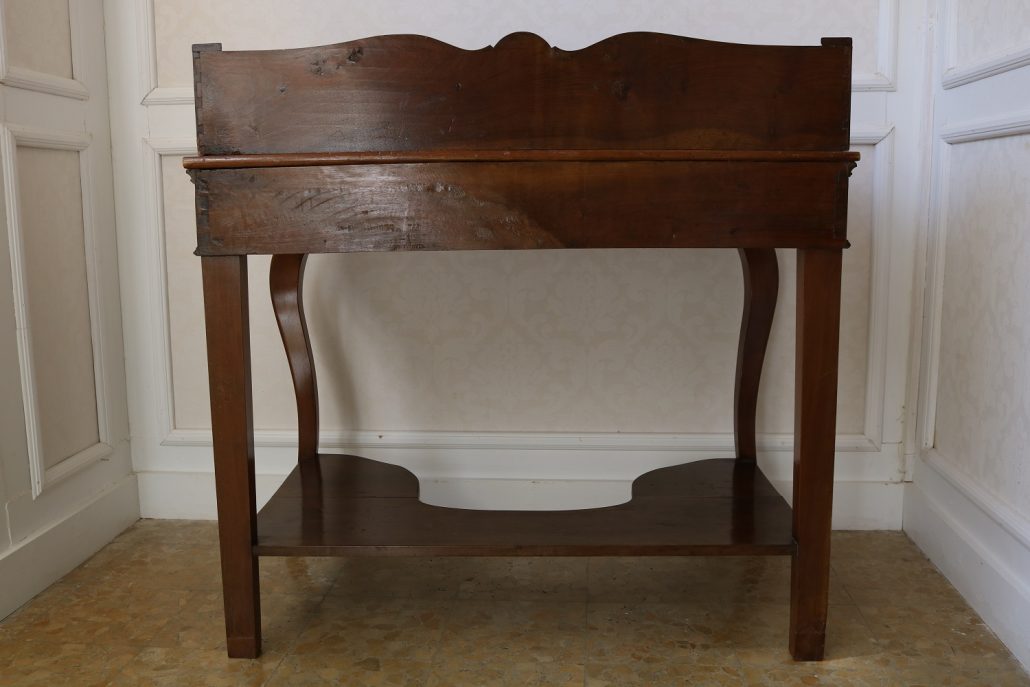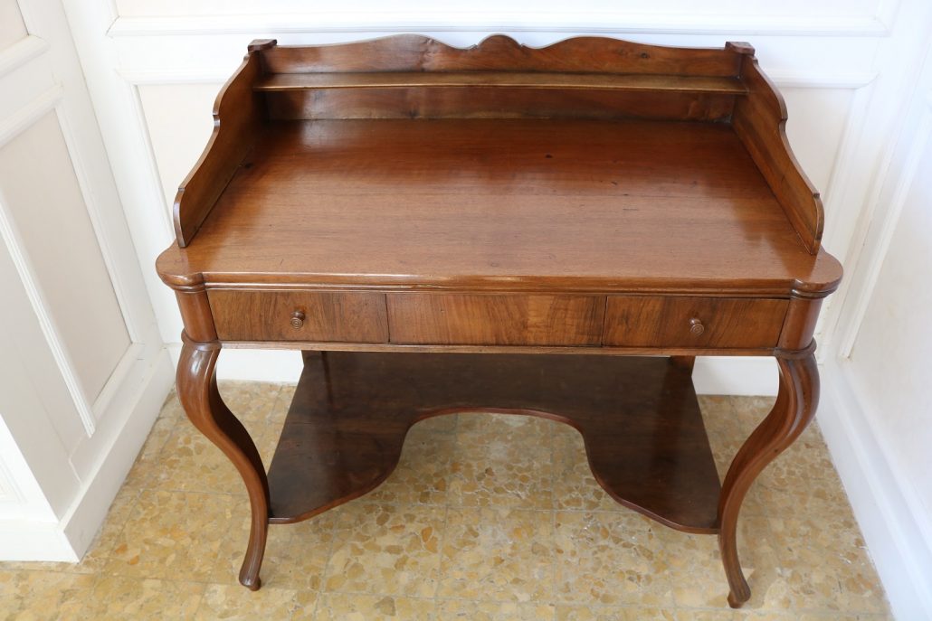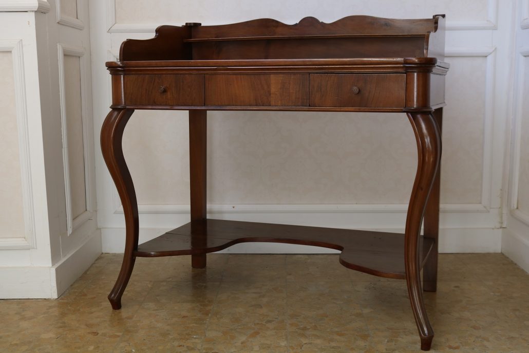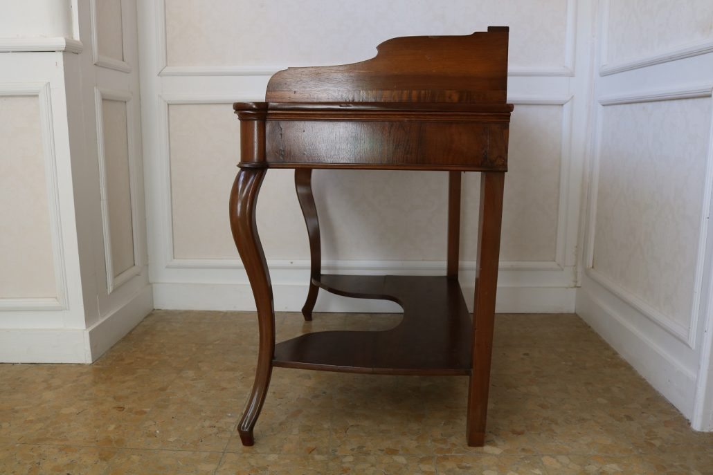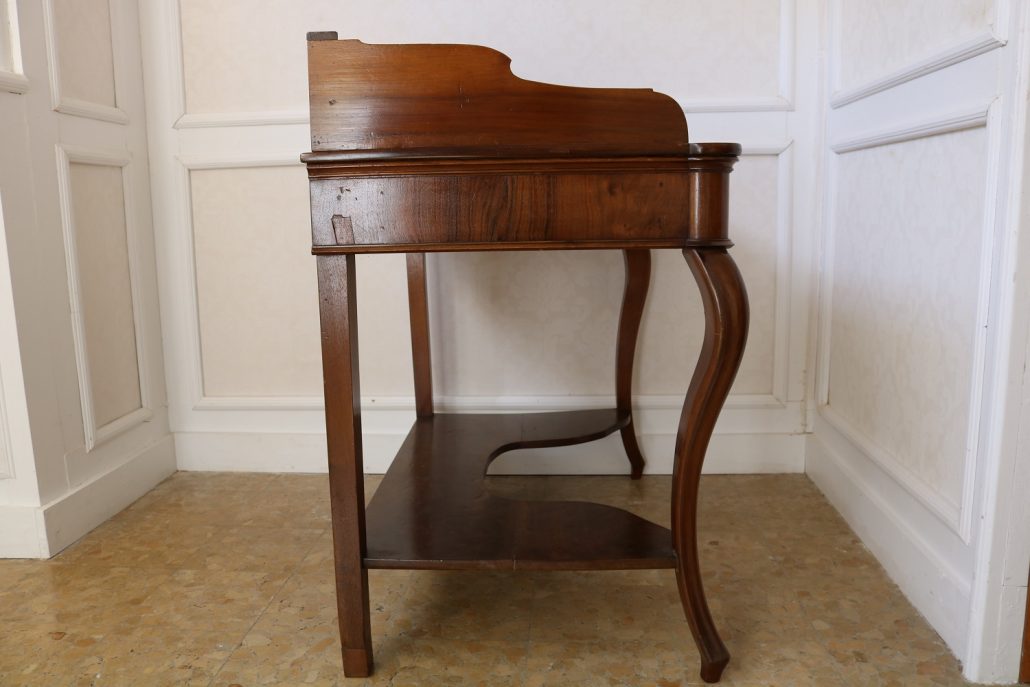 Scrittoio in noce Luigi Filippo. Un piano munito di alzatina con mensola è sostenuto da due gambe dalla linea mossa terminanti con una “scarpetta” anteriormente, da due gambe a plinto rafforzate da una sorta di zoccolo nella parte posteriore. Sotto il piano scrittura, all’interno della fascia sono racchiusi due cassettini, muniti di pomolo in legno, foderati all’interno con carta a garofano verde. Un largo ripiano, modanato, collega le quattro gambe nella parte bassa. La bella venatura del noce è posta verticalmente lungo la fascia sotto piano, per creare un effetto di “slancio” verso l’alto alleggerendo così l’arredo ed esaltandone le eleganti forme mosse. Il mobile “tradisce” una probabile funzione precedente differente o complementare allo scrittoio, denunciato dal fatto che nella fascia, i cassetti sono presenti sui lati lasciando una porzione centrale inspiegabilmente vuota. Probabilmente il piano presentava un foro per l’incasso di un recipiente in ceramica per le abluzioni. Scomparso durante un precedente restauro eseguito con grande maestria. Mobile di bella fattura e di raffinato disegno, arricchito dalla nobile essenza di noce sapientemente lavorato.