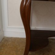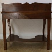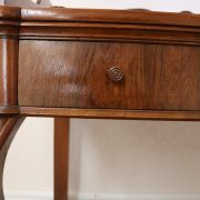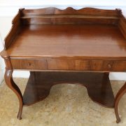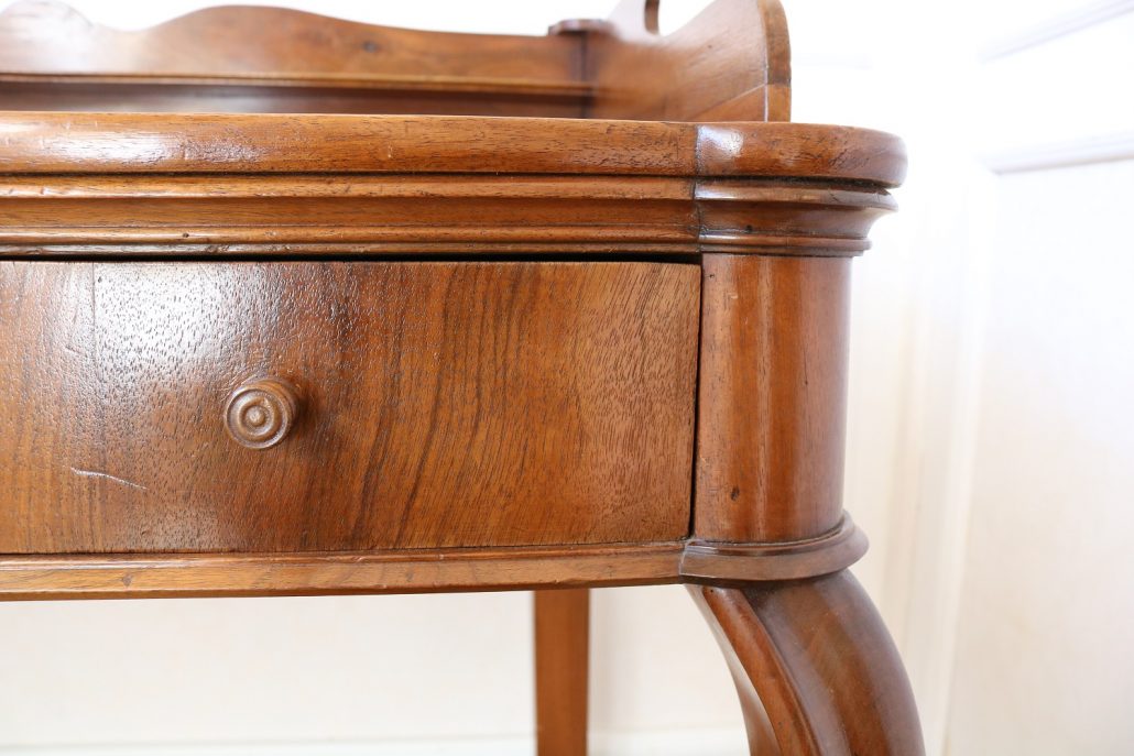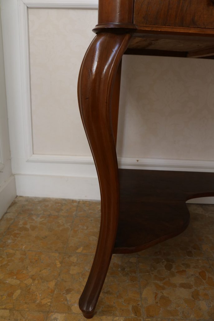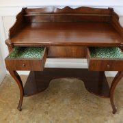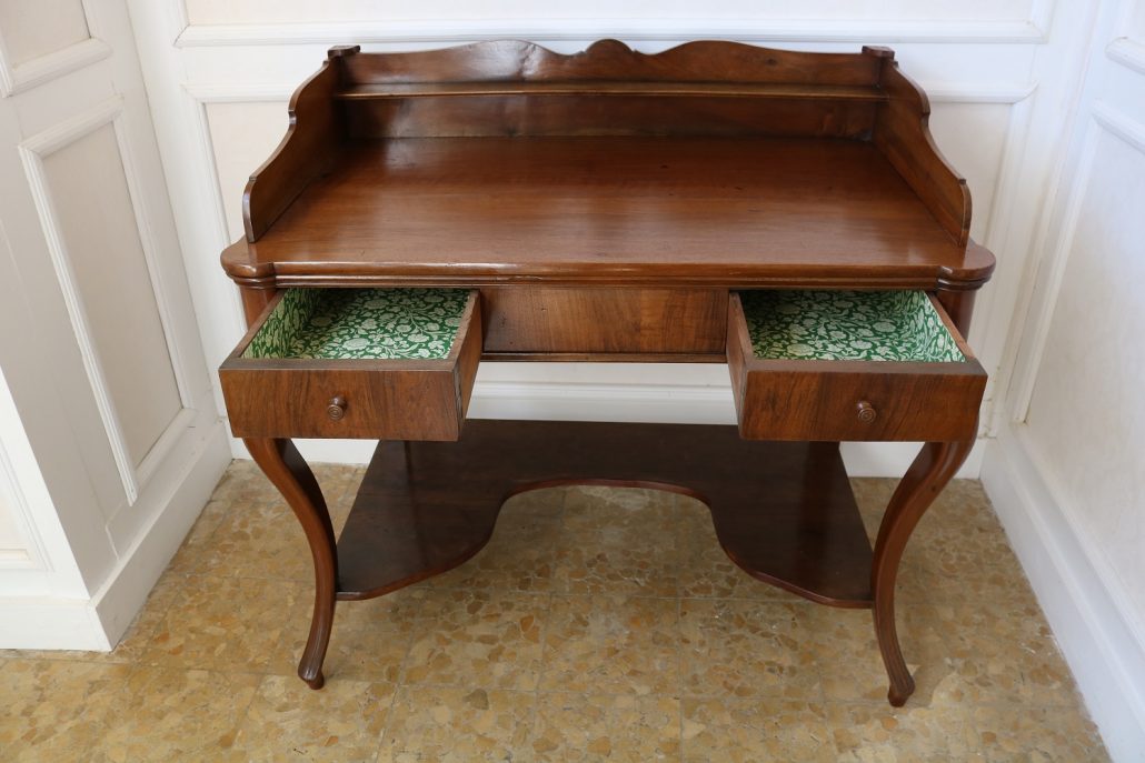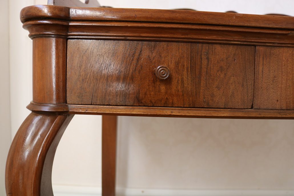 Scrittoio in noce Luigi Filippo. Un piano munito di alzatina con mensola è sostenuto da due gambe dalla linea mossa terminanti con una “scarpetta” anteriormente, da due gambe a plinto rafforzate da una sorta di zoccolo nella parte posteriore. Sotto il piano scrittura, all’interno della fascia sono racchiusi due cassettini, muniti di pomolo in legno, foderati all’interno con carta a garofano verde. Un largo ripiano, modanato, collega le quattro gambe nella parte bassa. La bella venatura del noce è posta verticalmente lungo la fascia sotto piano, per creare un effetto di “slancio” verso l’alto alleggerendo così l’arredo ed esaltandone le eleganti forme mosse. Il mobile “tradisce” una probabile funzione precedente differente o complementare allo scrittoio, denunciato dal fatto che nella fascia, i cassetti sono presenti sui lati lasciando una porzione centrale inspiegabilmente vuota. Probabilmente il piano presentava un foro per l’incasso di un recipiente in ceramica per le abluzioni. Scomparso durante un precedente restauro eseguito con grande maestria. Mobile di bella fattura e di raffinato disegno, arricchito dalla nobile essenza di noce sapientemente lavorato.