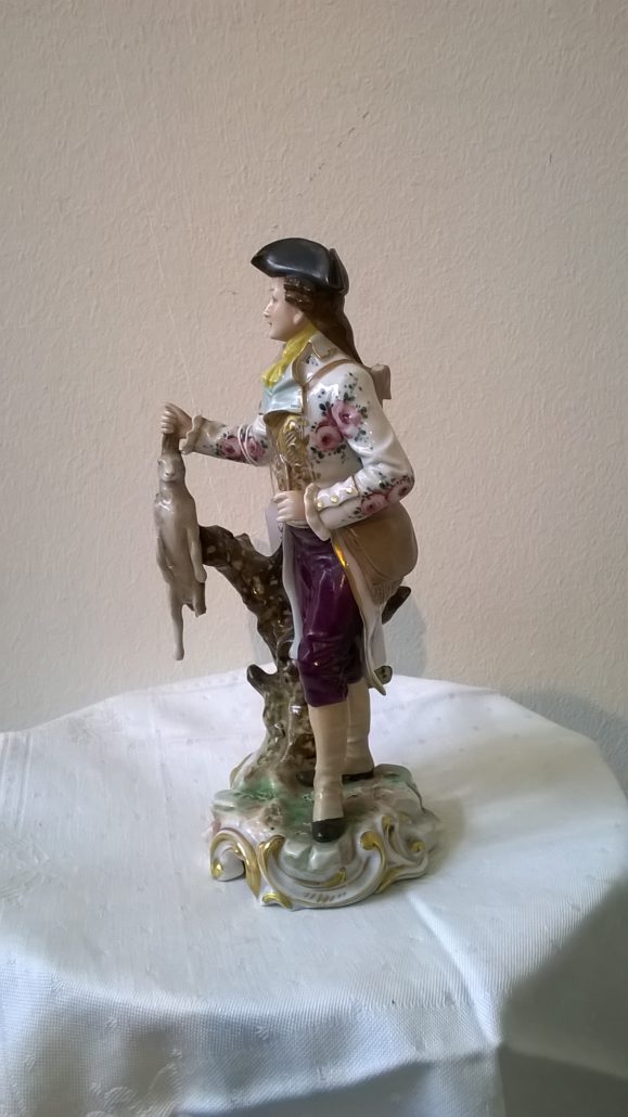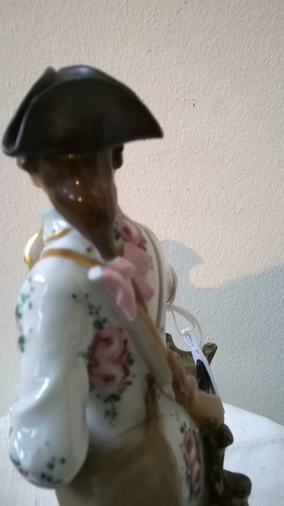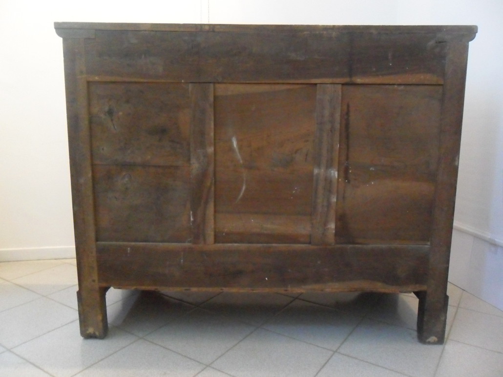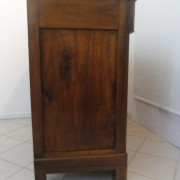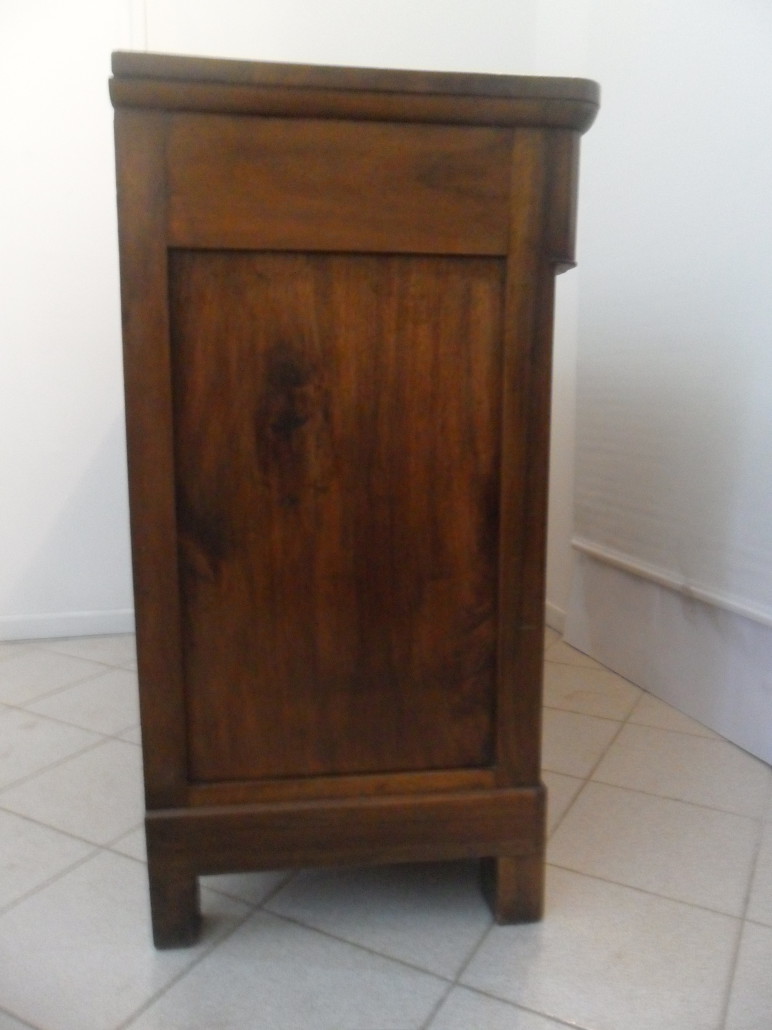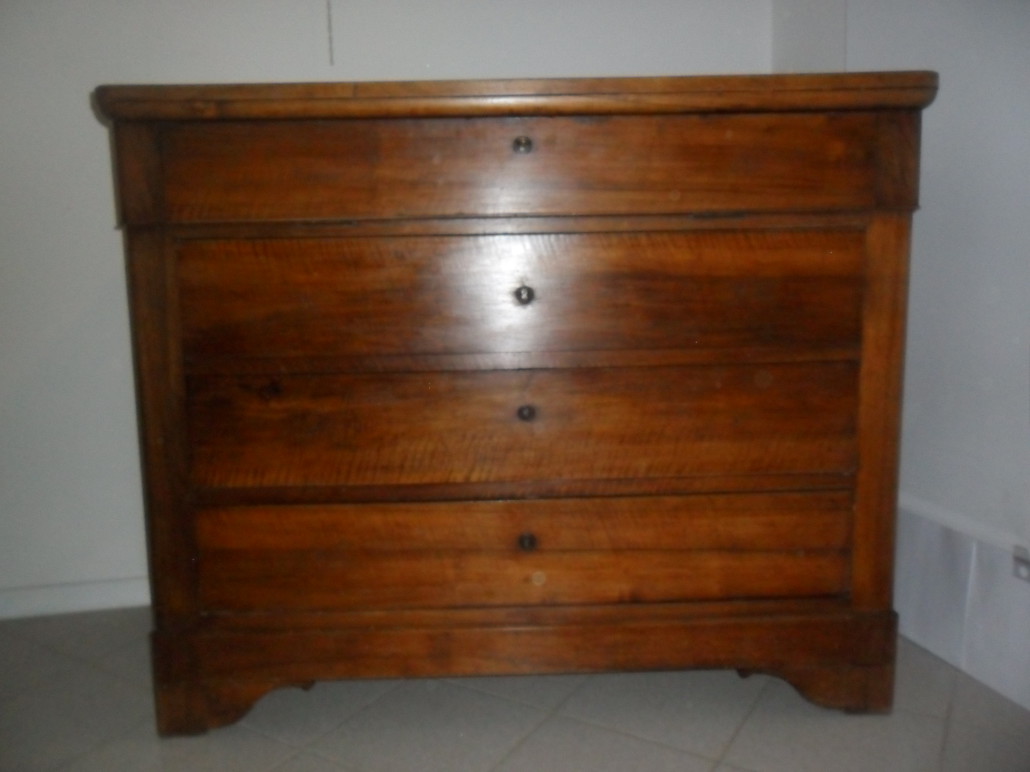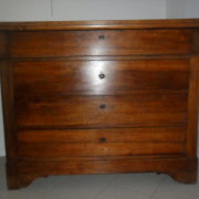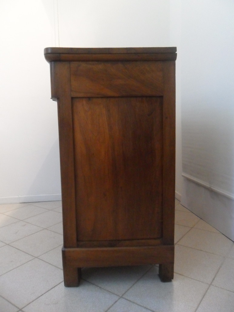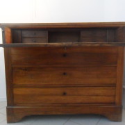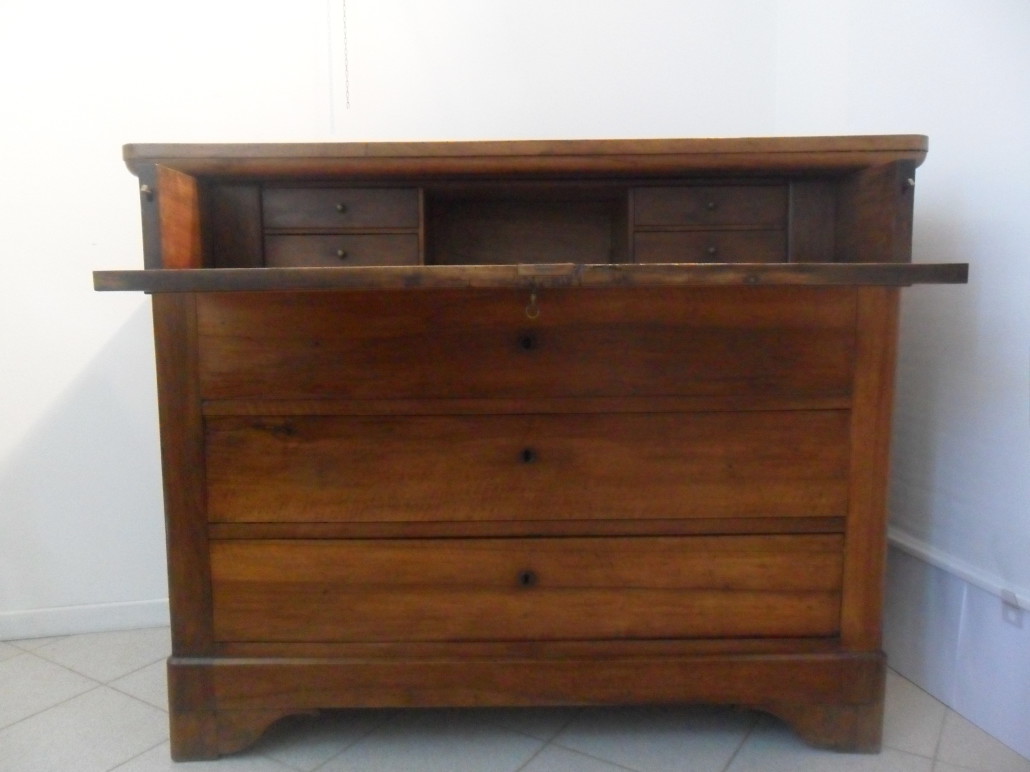 Cassettone-canterano in noce massello Carlo X, quattro cassetti di cui il primo a ribalta celante quattro cassettini, vano a giorno e due cassettini con scatto segreto. Linea semplice e piedi a mensola.