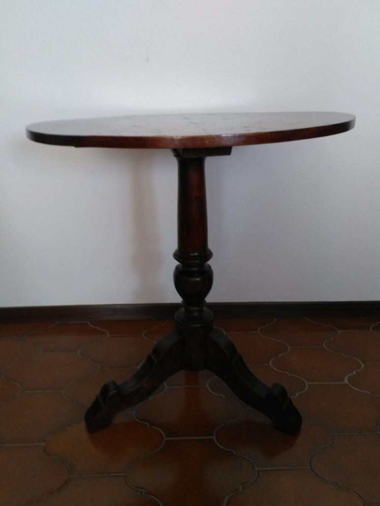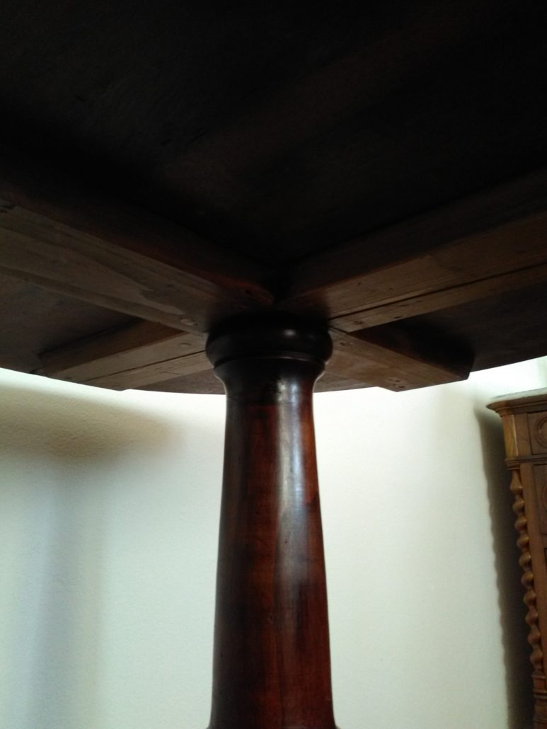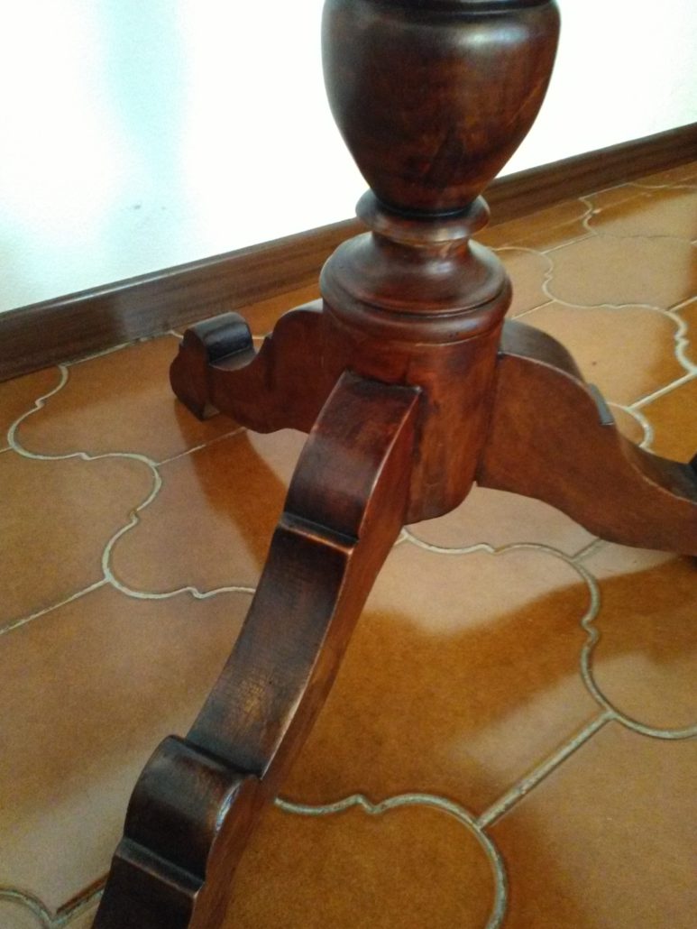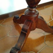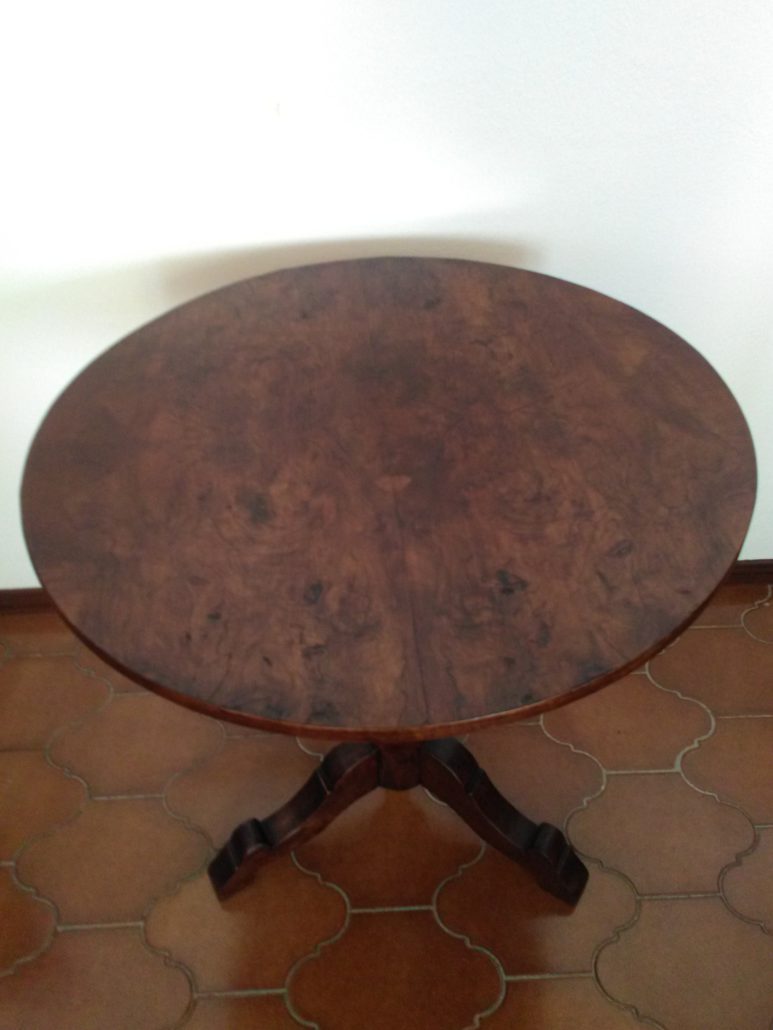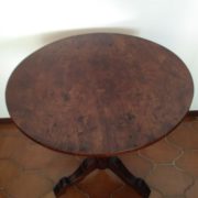 Tavolino tondo in noce. Piano tendo lastronato in radica di noce quadripartita. Balaustro centrale tripode.