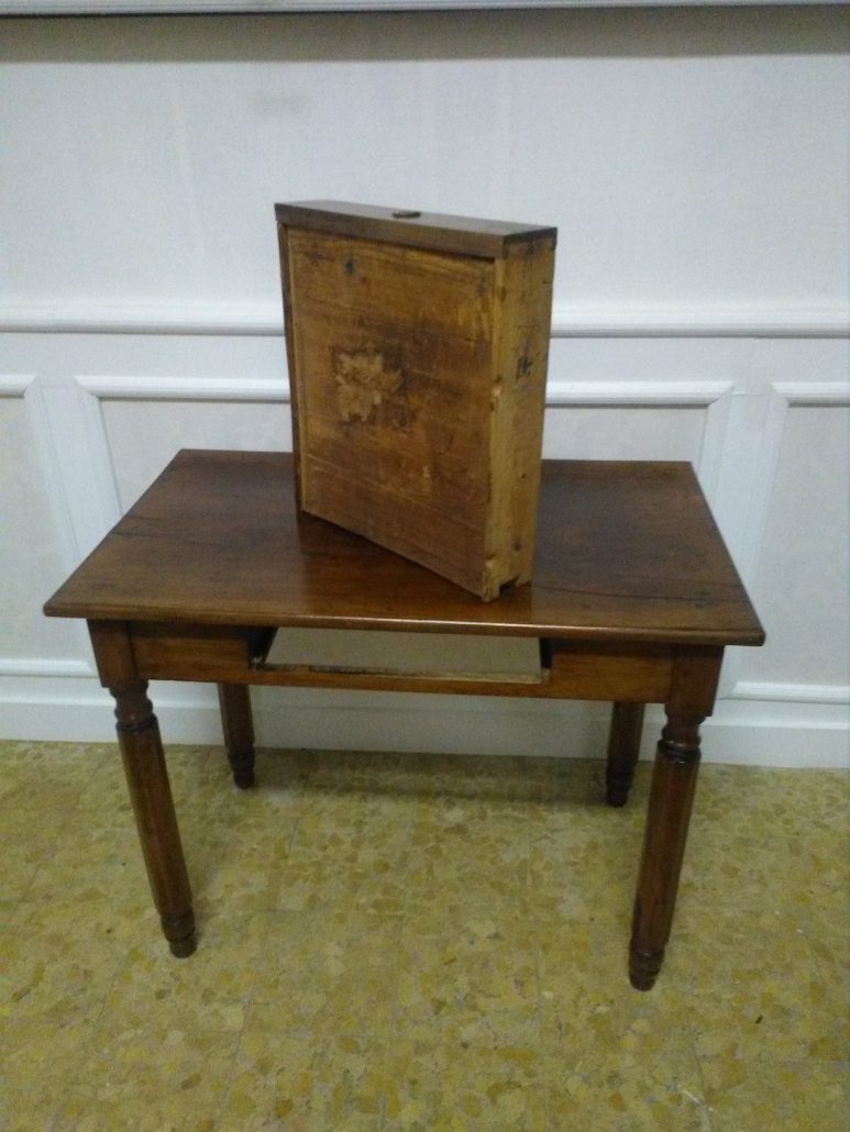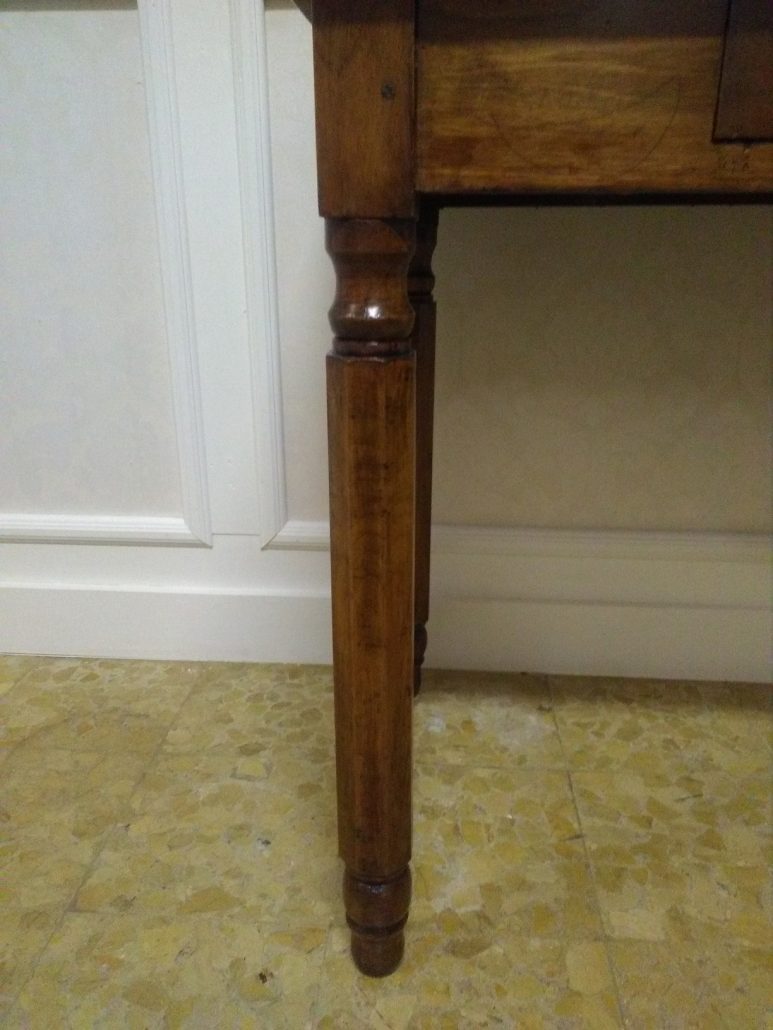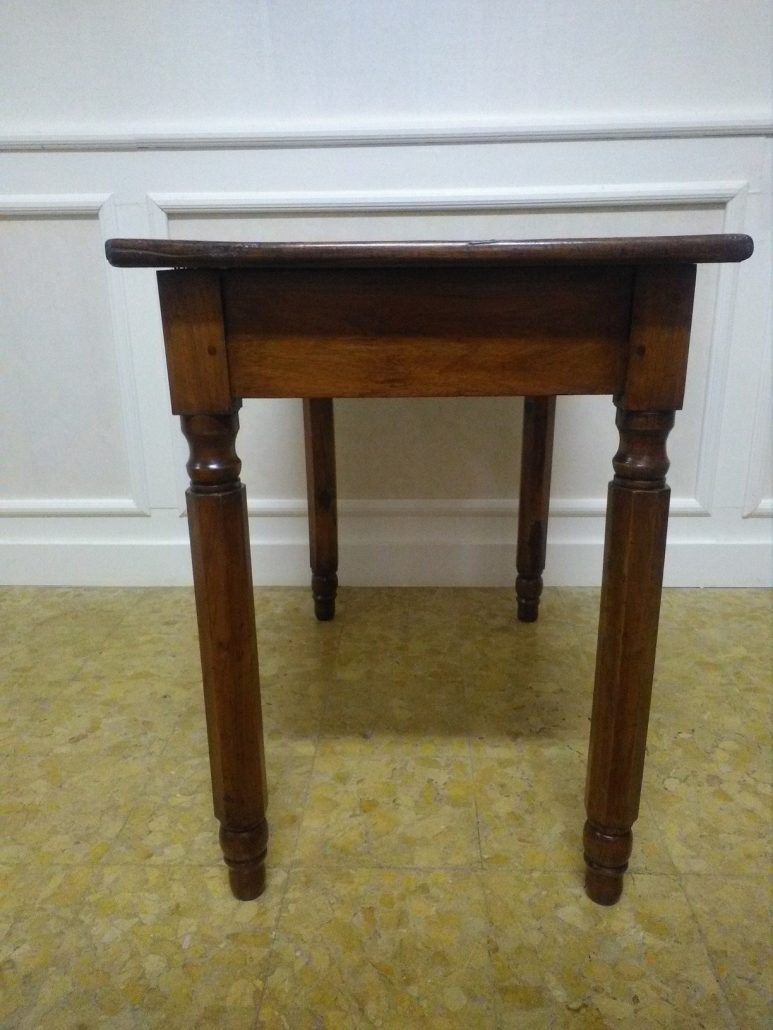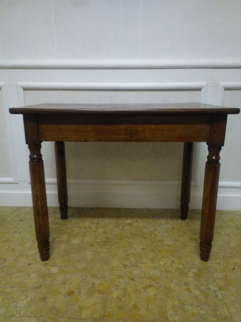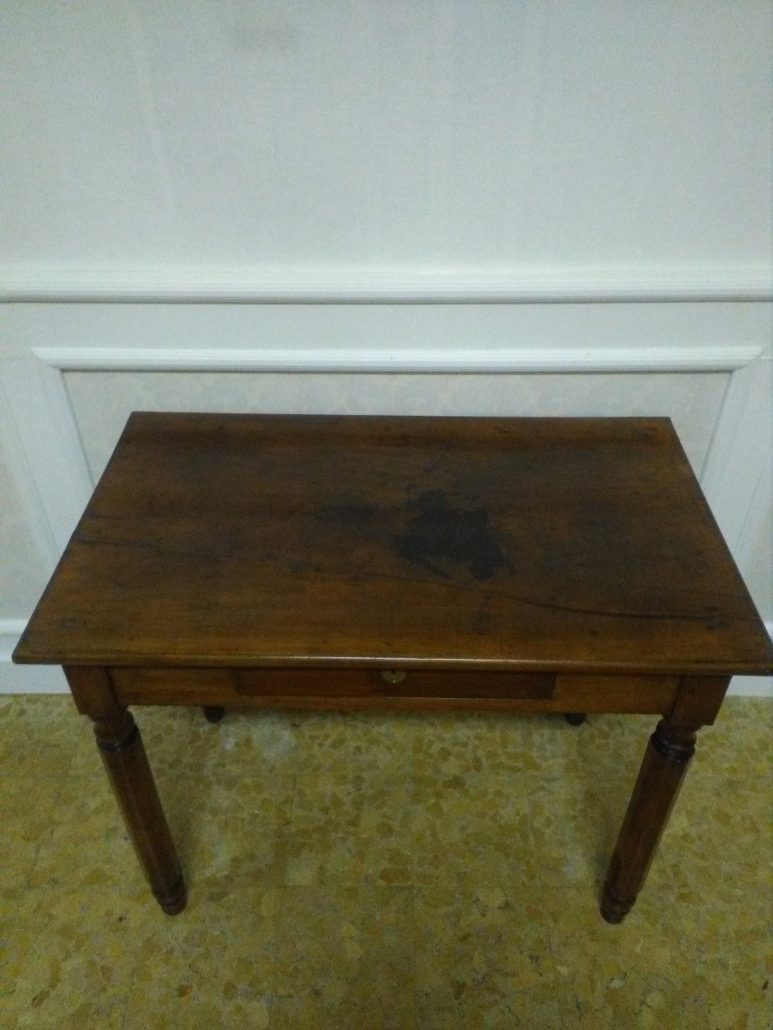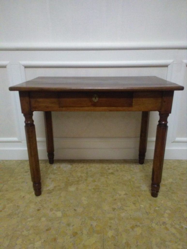 Tavolo-scrittoio in noce massello. Quattro gambe sfaccettate e tornite sostengono una fascia con cassetto, munito di serratura. Piano semplice con cornice a guscia applicata. Dalle forme molto sobrie, il tavolo si presenta sano e massiccio. Utilizzabile come scrittoio, come testimonia la macchia di inchiostro sul piano, può anche essere utilizzato come tavolo da pranzo.