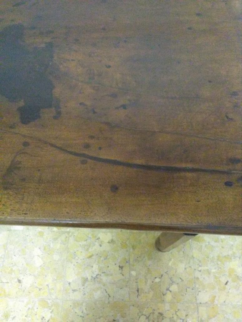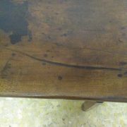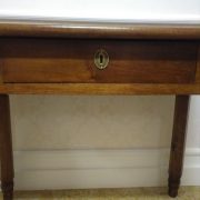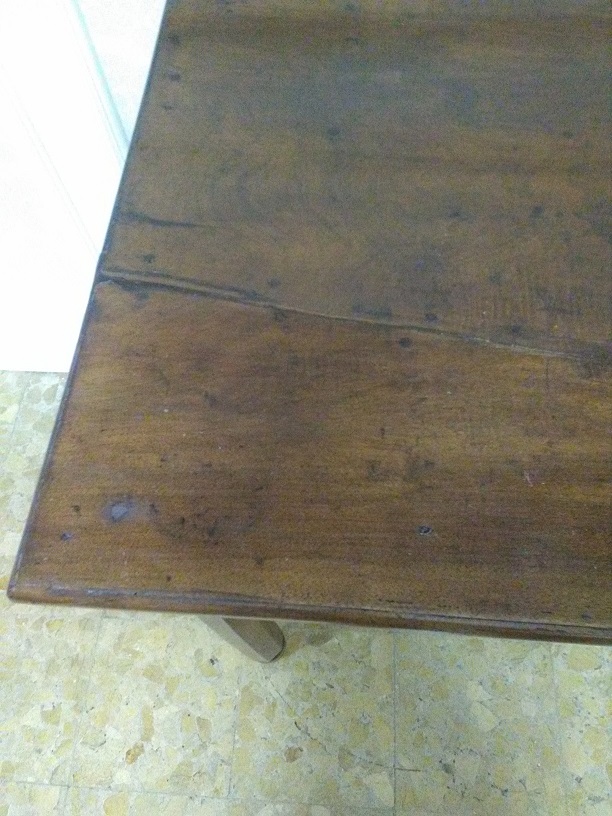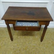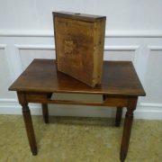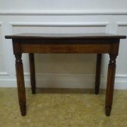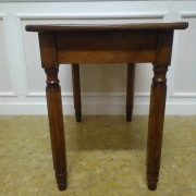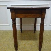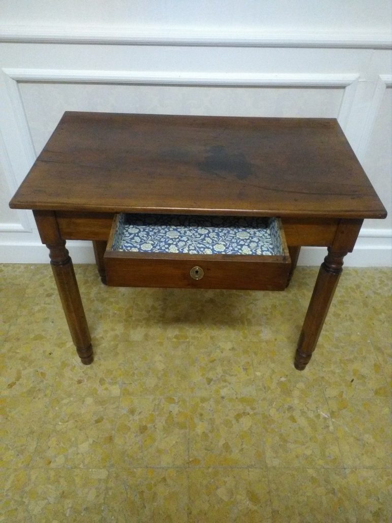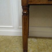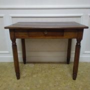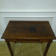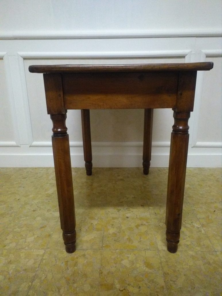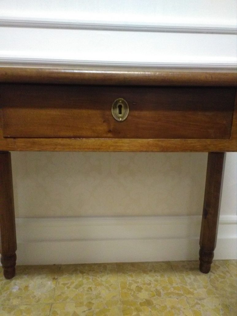 Tavolo-scrittoio in noce massello. Quattro gambe sfaccettate e tornite sostengono una fascia con cassetto, munito di serratura. Piano semplice con cornice a guscia applicata. Dalle forme molto sobrie, il tavolo si presenta sano e massiccio. Utilizzabile come scrittoio, come testimonia la macchia di inchiostro sul piano, può anche essere utilizzato come tavolo da pranzo.