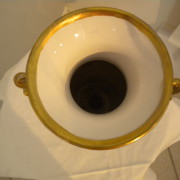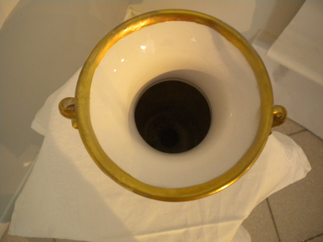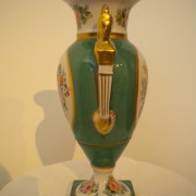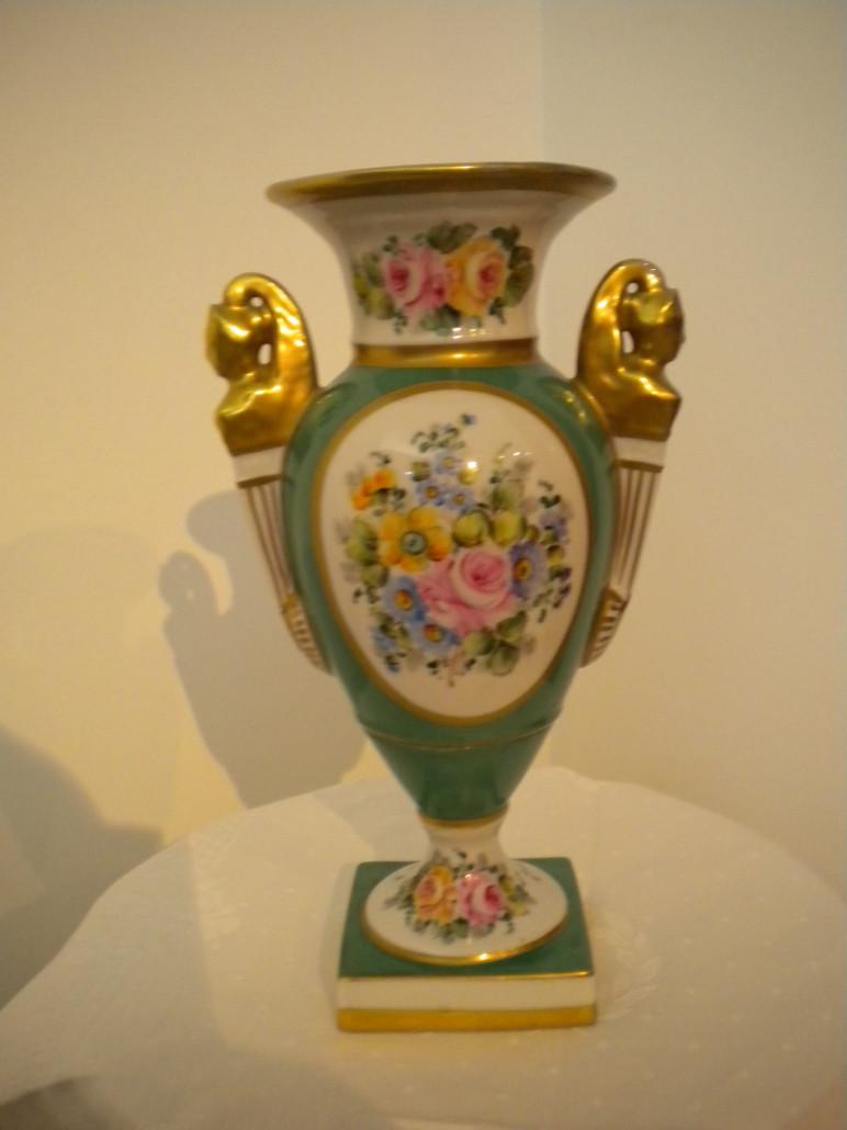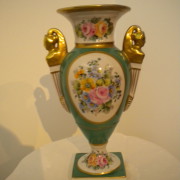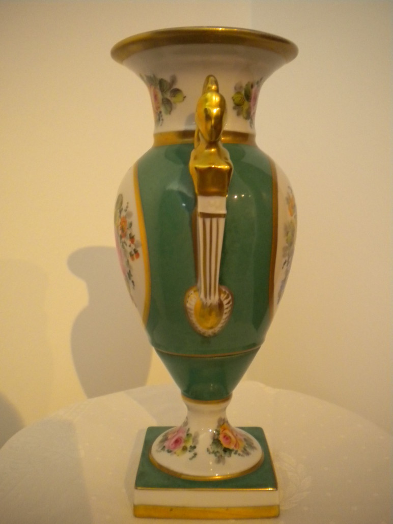 Vaso ad urna di dimensioni contenute in stile Impero smaltato verde smeraldo con cammeo centrale decorato con fiori dipinti a mano su tutti e due i lati.