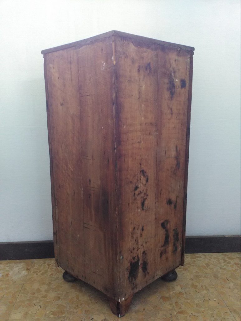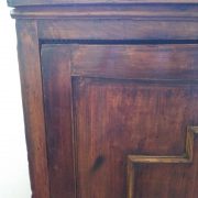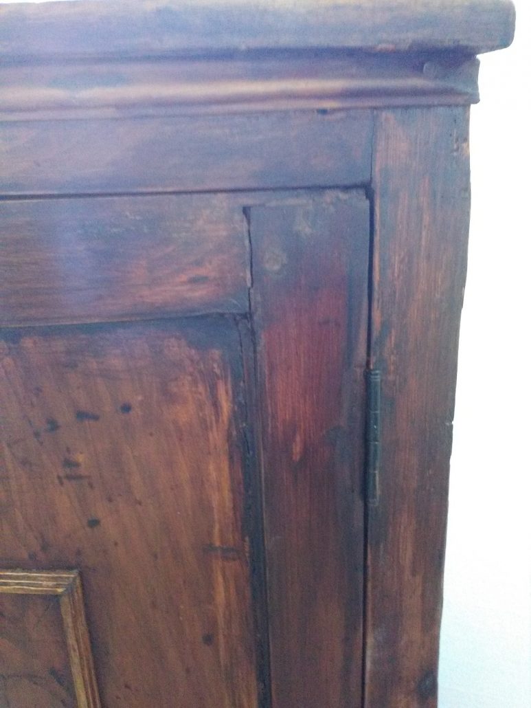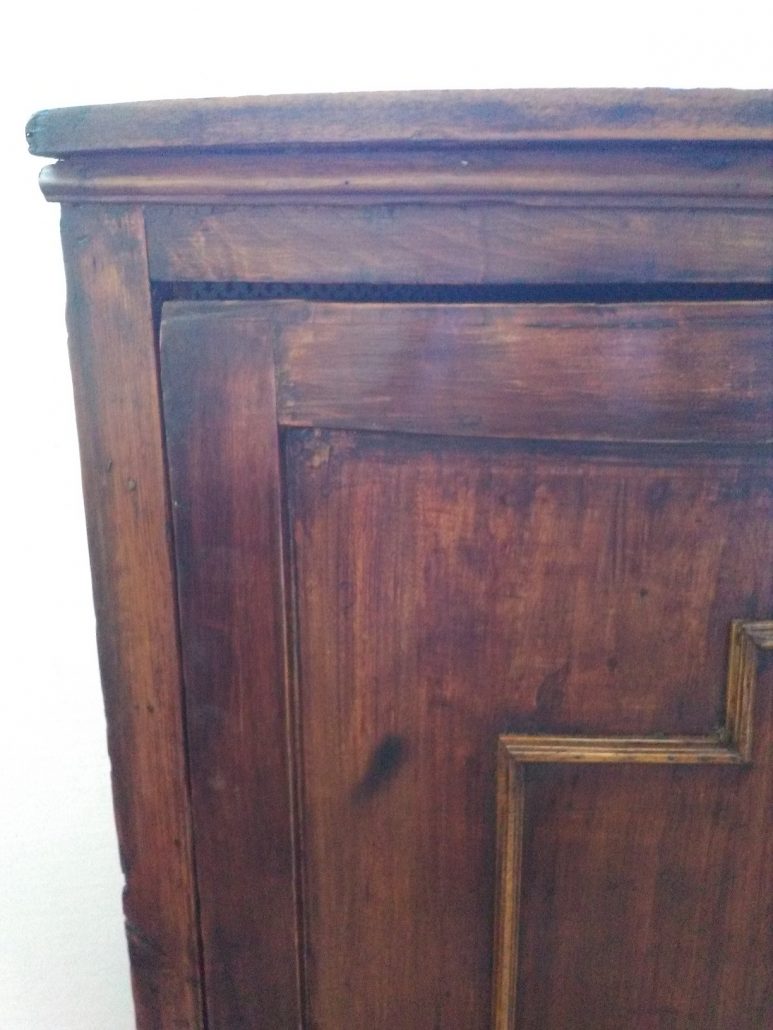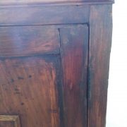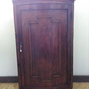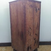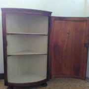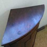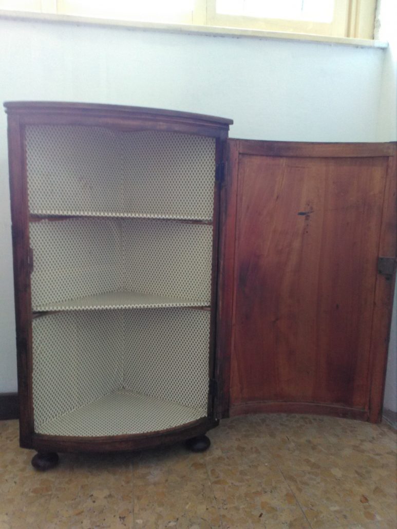 Angoliera in legni vari tra cui: noce, ciliegio, abete. Costituita da una unica anta, munita di serratura, questa angoliera demi lune, presenta una sobria eleganza, la decorazione viene affidata ad una semplice cornicetta applicata sull’anta che forma un motivo geometrico. Piedi a bulbo.