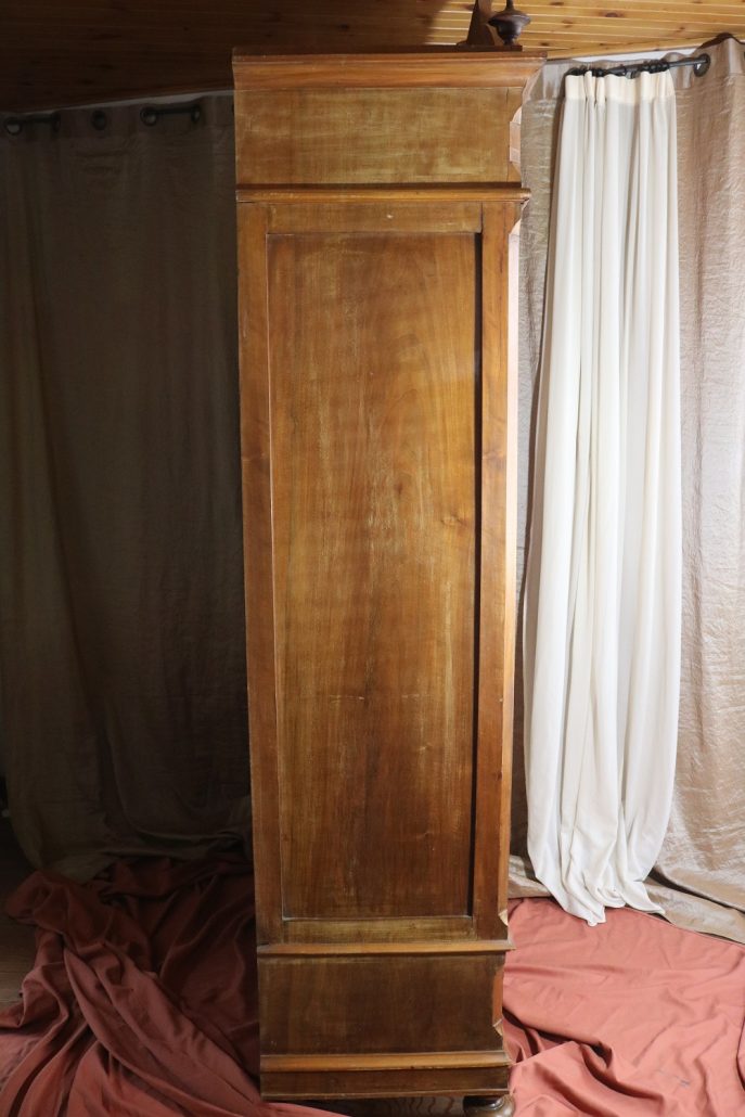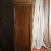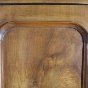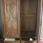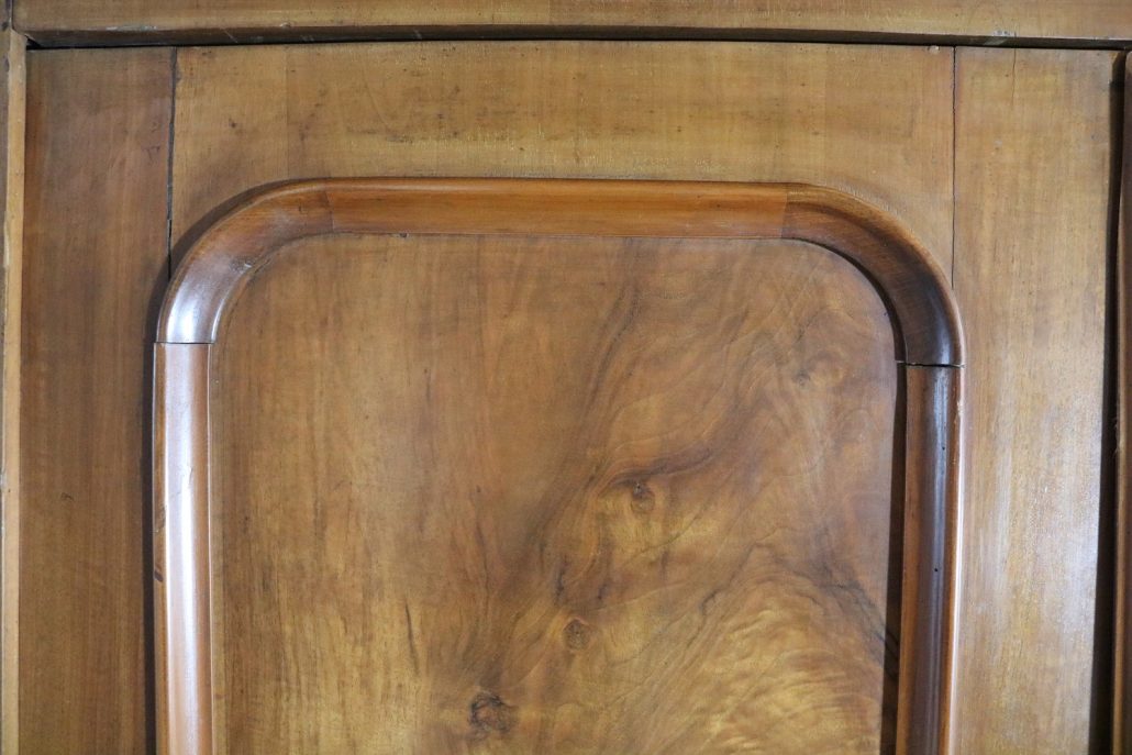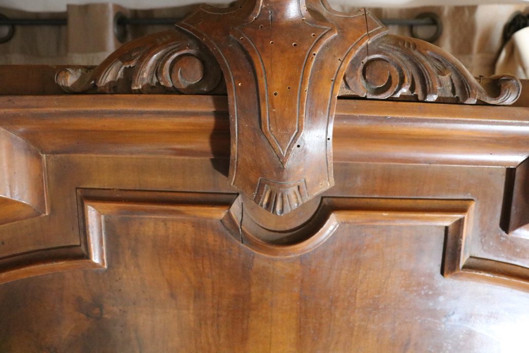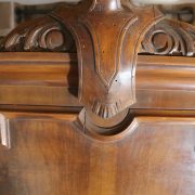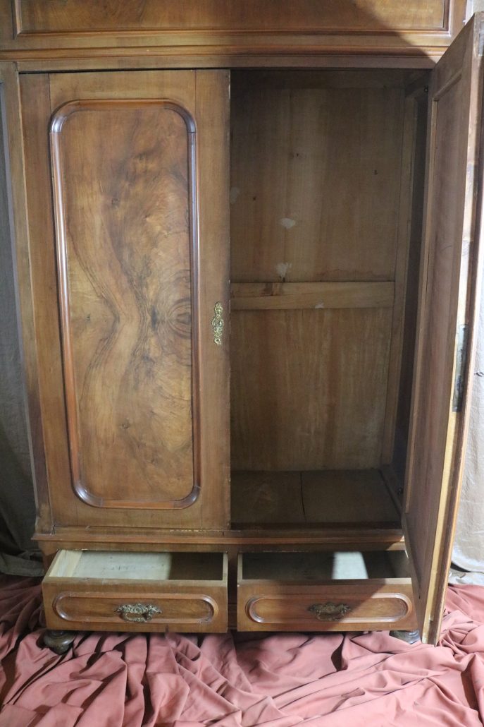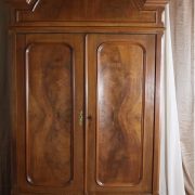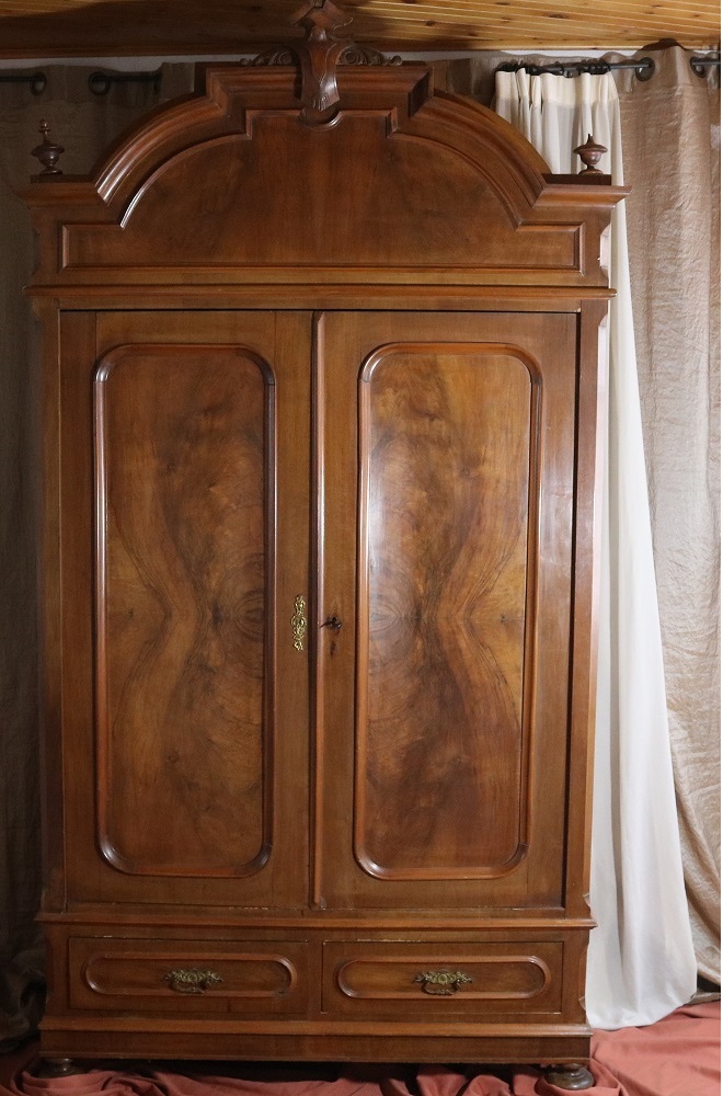 Armadio Umbertino in noce. Mobile costituito da due grandi ante munite di serratura decorate da una pannellatura centrale in radica specchiata contornata da una cornice. Due cassetti trovano alloggio ai piedi delle ante riprendendo la medesima decorazione e sono muniti di maniglie dorate. Uno zoccolo con venatura posta verticalmente finisce la parte basse di questo arredo sostenuto da due piedi a bulbo leggermente schiacciato anteriormente e a plinto posteriormente. Al di sopra delle ante si sviluppa un alto frontale a foggia di timpano decorato da un cornicione centrato da un cartiglio intagliato e delimitato lateralmente da tue pennacchi a trottola. Nella parte centrale del fronte una cornice più discreta segue l’andamento curvilineo del timpano riprendendo la radica anche in questo caso specchiata. I fianchi del mobile risultano più sobri e sono decorati da semplici cornici. Seppur in buono stato, si consiglia un restauro.