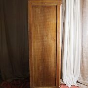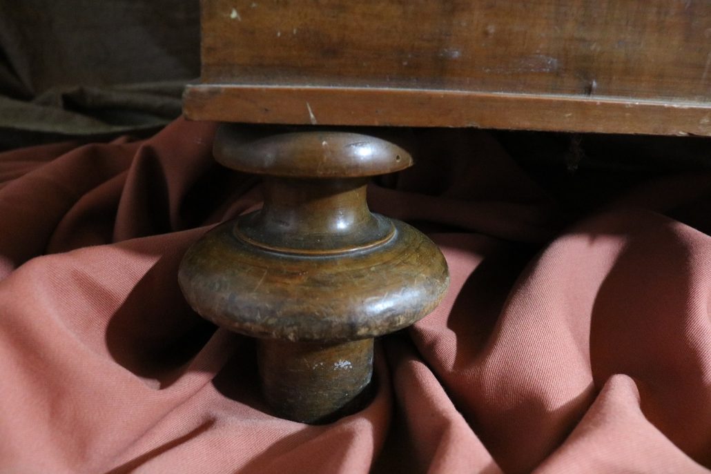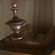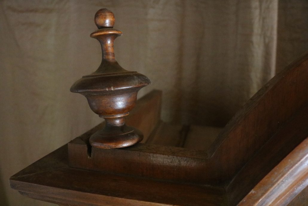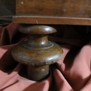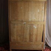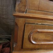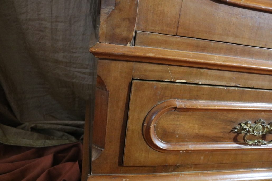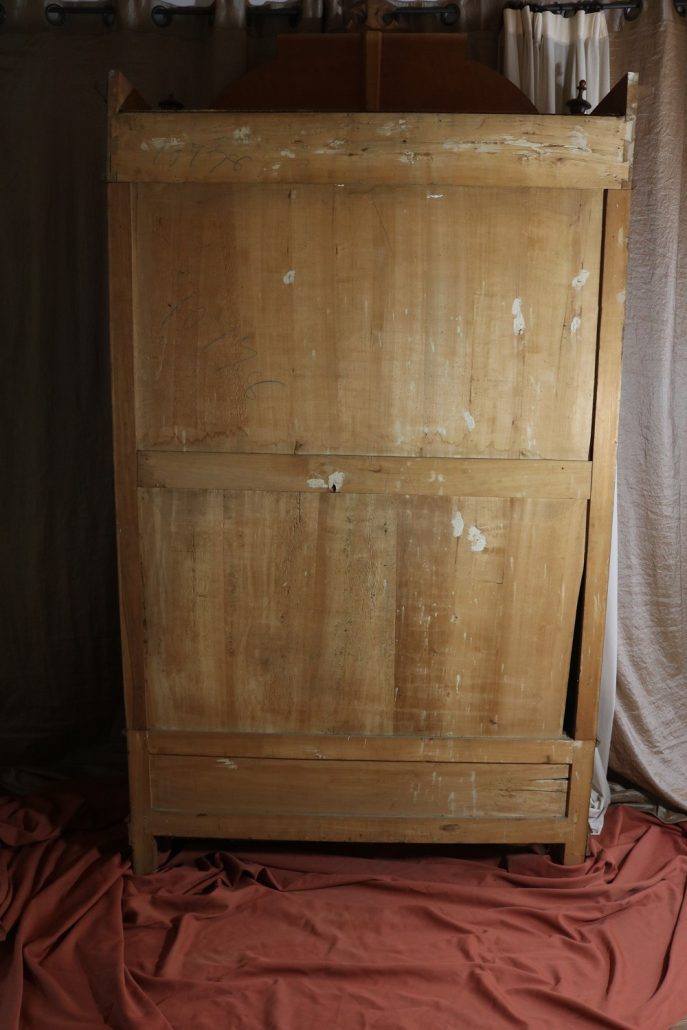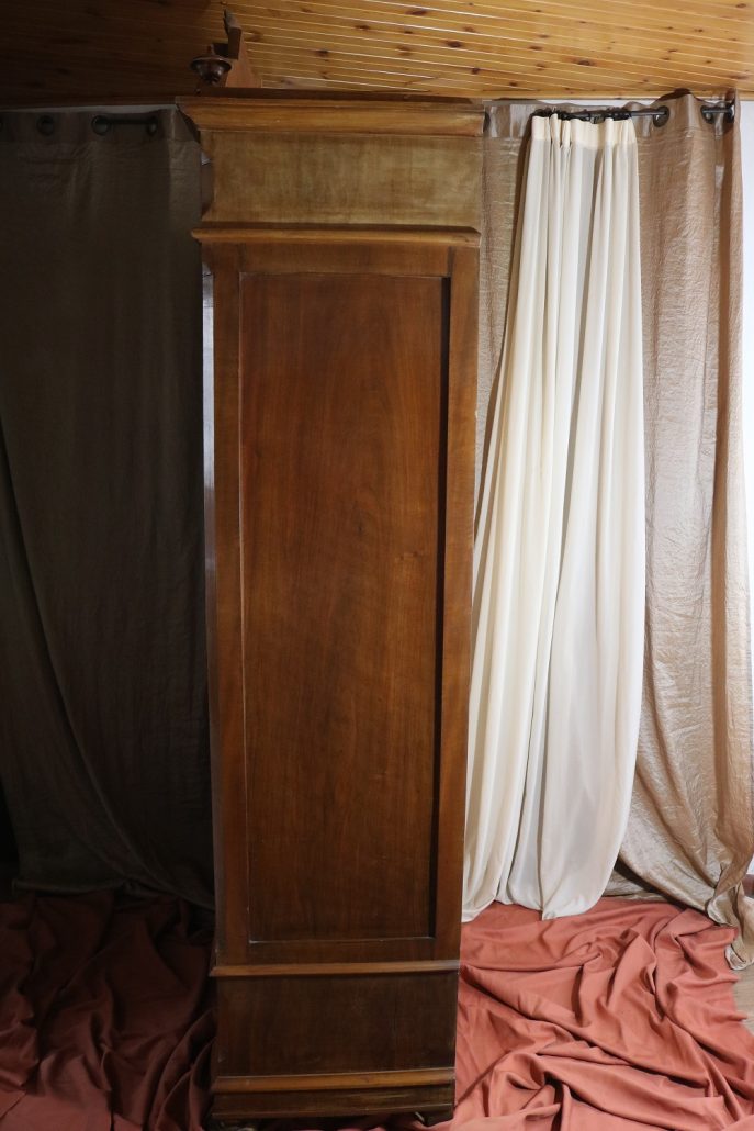 Armadio Umbertino in noce. Mobile costituito da due grandi ante munite di serratura decorate da una pannellatura centrale in radica specchiata contornata da una cornice. Due cassetti trovano alloggio ai piedi delle ante riprendendo la medesima decorazione e sono muniti di maniglie dorate. Uno zoccolo con venatura posta verticalmente finisce la parte basse di questo arredo sostenuto da due piedi a bulbo leggermente schiacciato anteriormente e a plinto posteriormente. Al di sopra delle ante si sviluppa un alto frontale a foggia di timpano decorato da un cornicione centrato da un cartiglio intagliato e delimitato lateralmente da tue pennacchi a trottola. Nella parte centrale del fronte una cornice più discreta segue l’andamento curvilineo del timpano riprendendo la radica anche in questo caso specchiata. I fianchi del mobile risultano più sobri e sono decorati da semplici cornici. Seppur in buono stato, si consiglia un restauro.