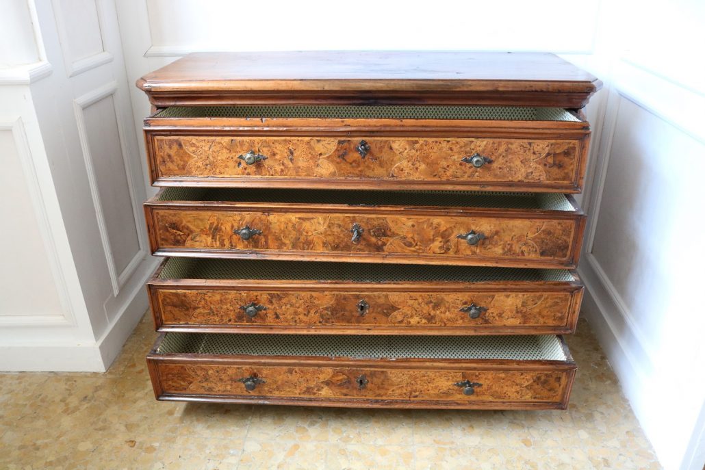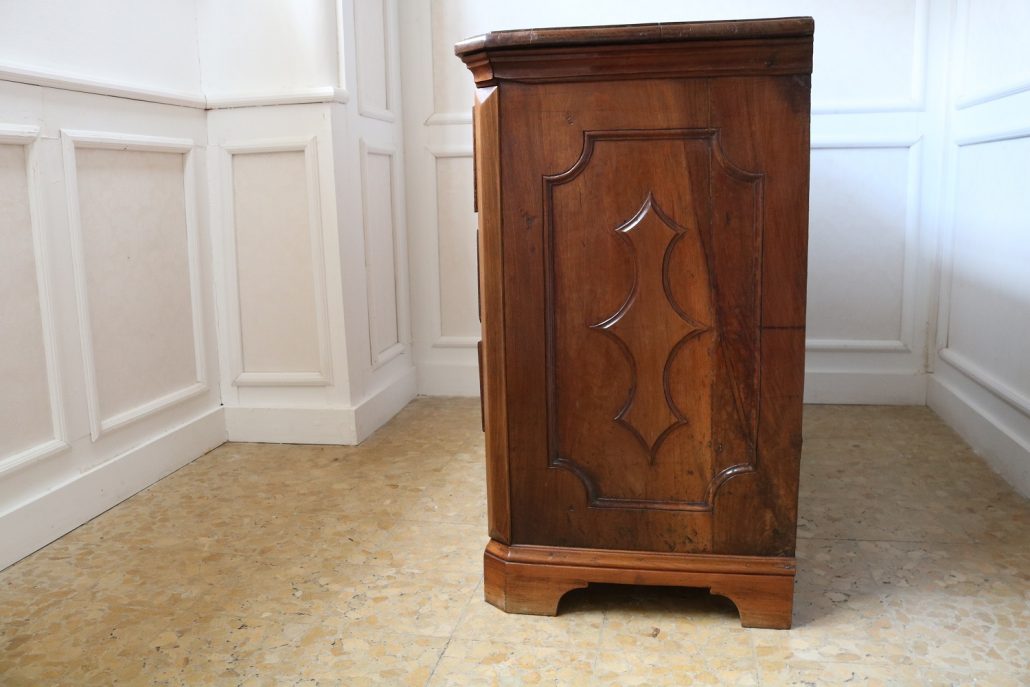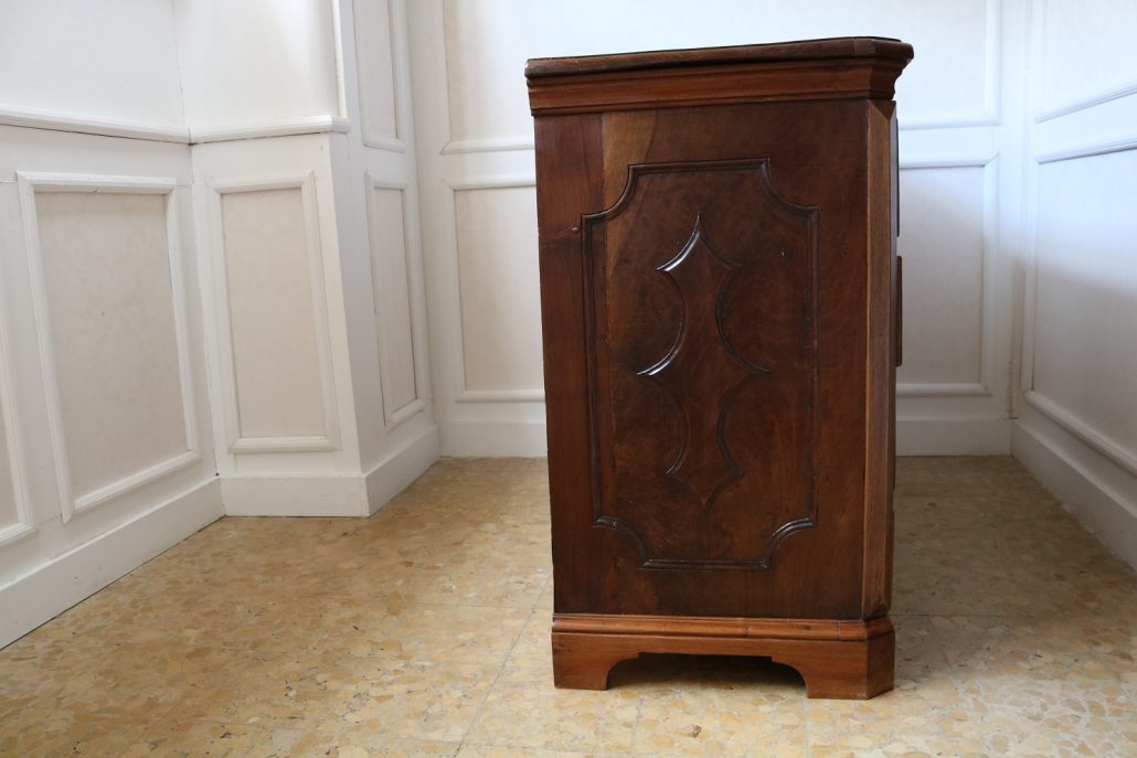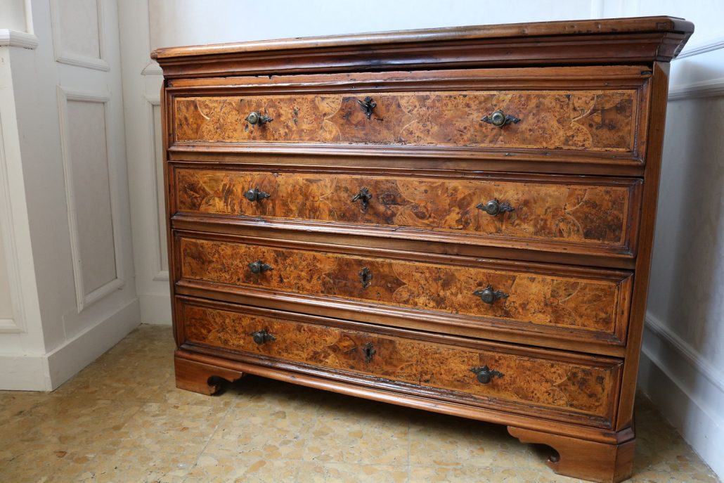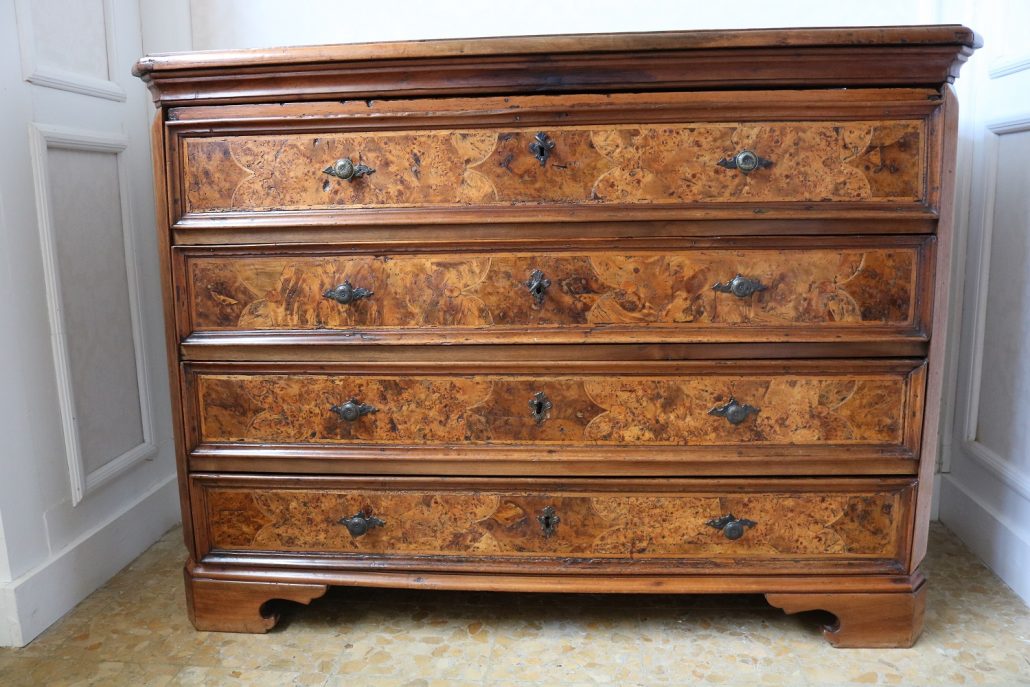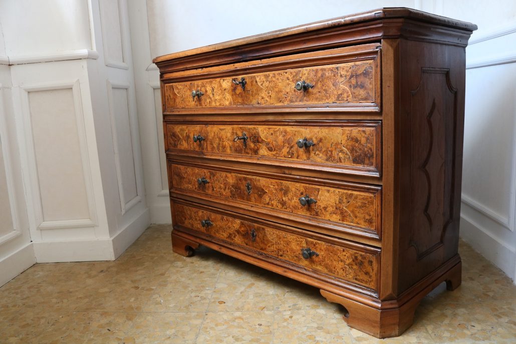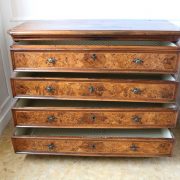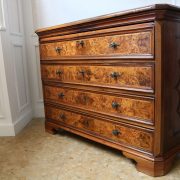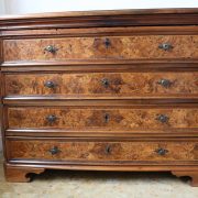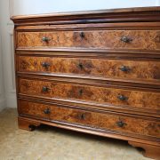 Canterano in noce e radica di noce. Quattro grandi cassetti, muniti di serratura, presentano un piacevole intarsio attraverso l’utilizzo di una filettatura di acero che crea delle riserve entro le quali è stata posizionata una bella radica di noce. A completare la mostra dei cassetti la ferramenta in sintonia stilistica con l’arredo. I fianchi del mobile presentano un piacevole intaglio, costituito da linee mosse a creare una grande formella centrale, tipica decorazione dell’epoca. Il piano, aggettante, è rafforzato nel suo spessore da una elaborata cornice. Anteriormente, lungo i fianchi, corrono due cornicioni verticali sfaccettati, mentre a sostegno del mobile sono presenti piedi a mensola. La bella essenza di noce, ricca di sfumature che passano dai toni del biondo al marrone scuro, viene valorizzata dalla lavorazione dei fianchi, dove, mediante l’utilizzo della tecnica dell’intaglio, possiamo ammirare anche il considerevole spessore del legno utilizzato. Il fronte del mobile, ancor più prezioso, con l’utilizzo della radica, presenta una raffinata partitura che ingentilisce le notevoli proporzioni dell’arredo. Il canterano, considerato “principe nell’arredamento”, non risulta essere “pesante” o austero, ma anzi, leggero e di gradevoli proporzioni.