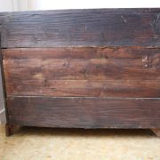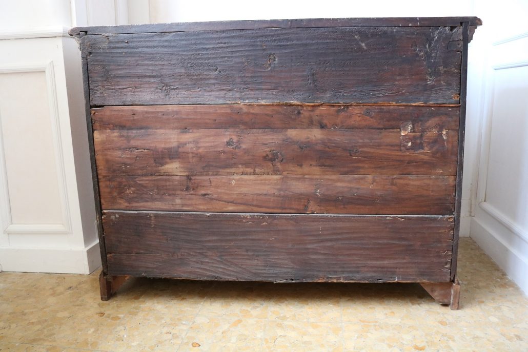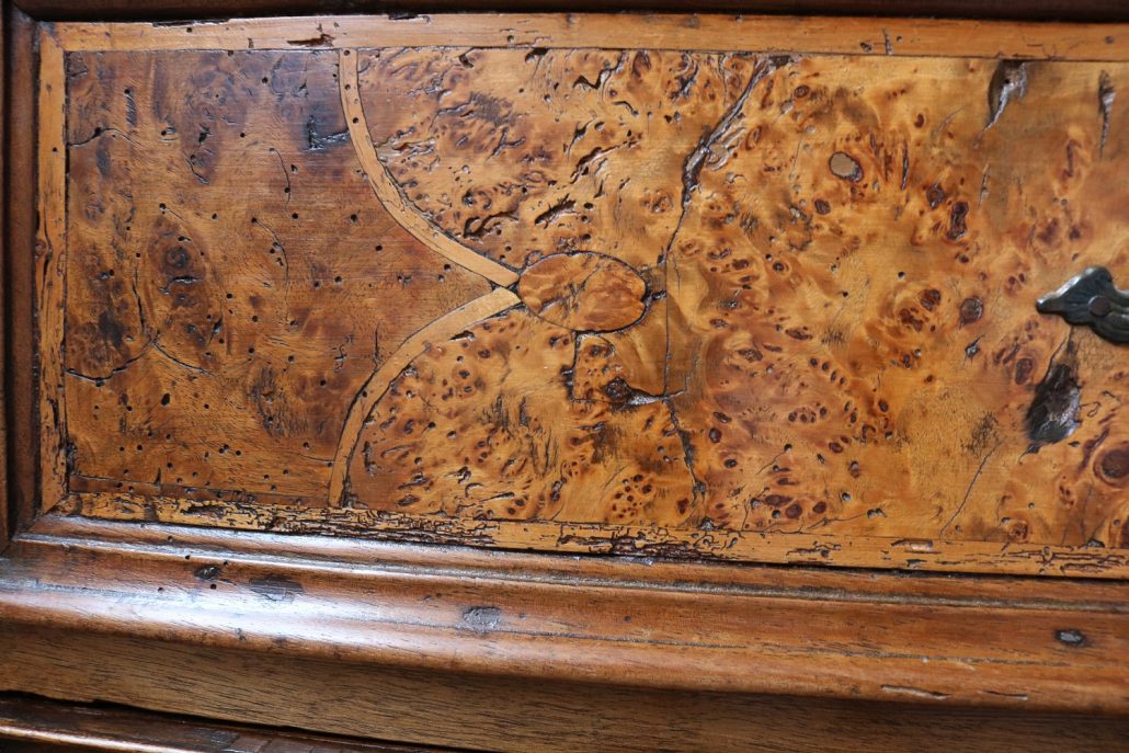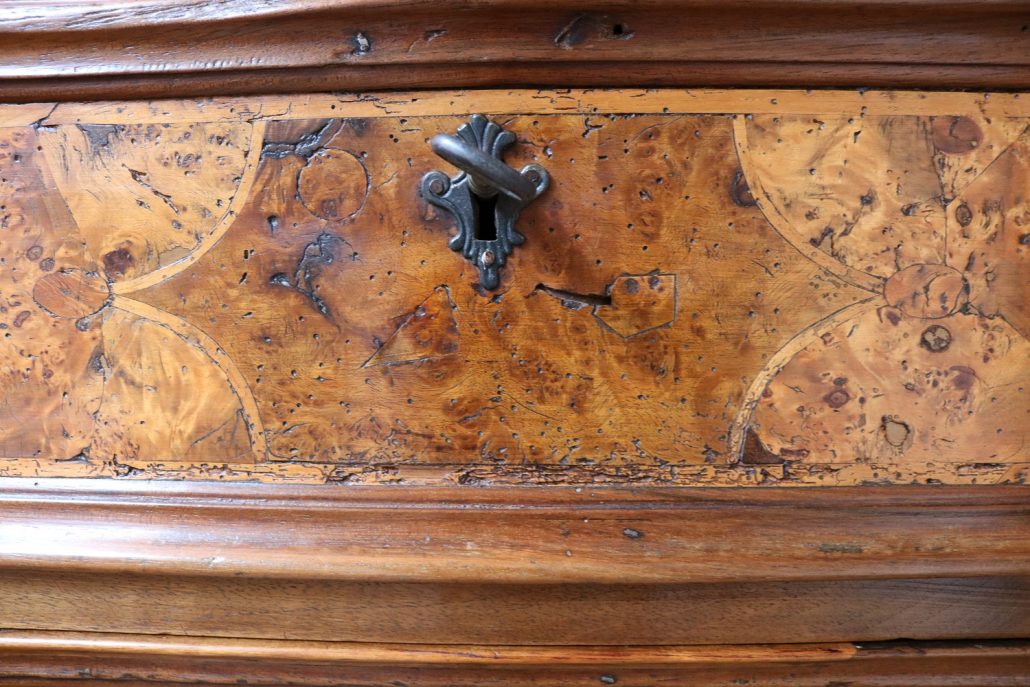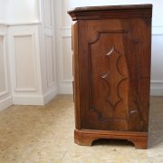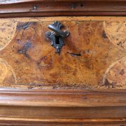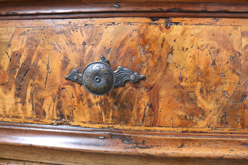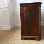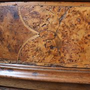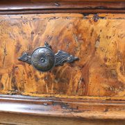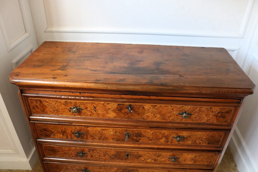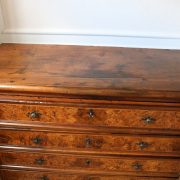 Canterano in noce e radica di noce. Quattro grandi cassetti, muniti di serratura, presentano un piacevole intarsio attraverso l’utilizzo di una filettatura di acero che crea delle riserve entro le quali è stata posizionata una bella radica di noce. A completare la mostra dei cassetti la ferramenta in sintonia stilistica con l’arredo. I fianchi del mobile presentano un piacevole intaglio, costituito da linee mosse a creare una grande formella centrale, tipica decorazione dell’epoca. Il piano, aggettante, è rafforzato nel suo spessore da una elaborata cornice. Anteriormente, lungo i fianchi, corrono due cornicioni verticali sfaccettati, mentre a sostegno del mobile sono presenti piedi a mensola. La bella essenza di noce, ricca di sfumature che passano dai toni del biondo al marrone scuro, viene valorizzata dalla lavorazione dei fianchi, dove, mediante l’utilizzo della tecnica dell’intaglio, possiamo ammirare anche il considerevole spessore del legno utilizzato. Il fronte del mobile, ancor più prezioso, con l’utilizzo della radica, presenta una raffinata partitura che ingentilisce le notevoli proporzioni dell’arredo. Il canterano, considerato “principe nell’arredamento”, non risulta essere “pesante” o austero, ma anzi, leggero e di gradevoli proporzioni.