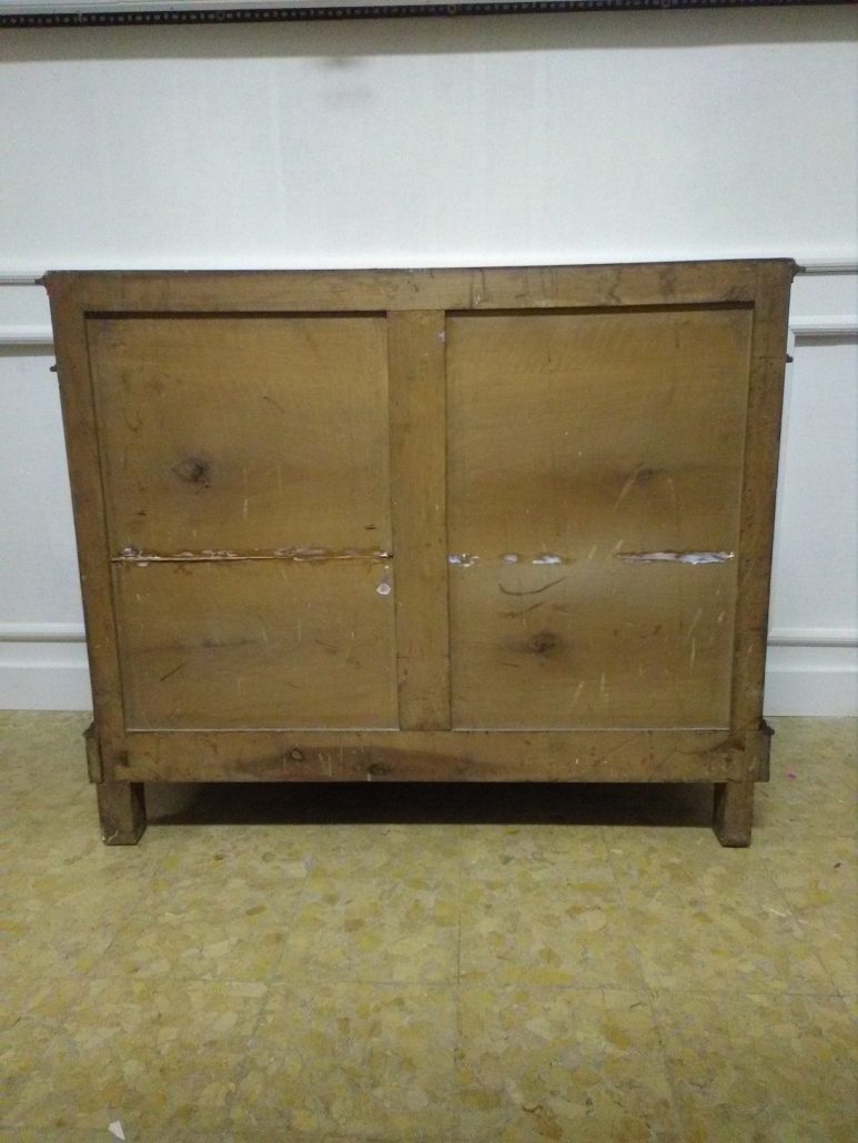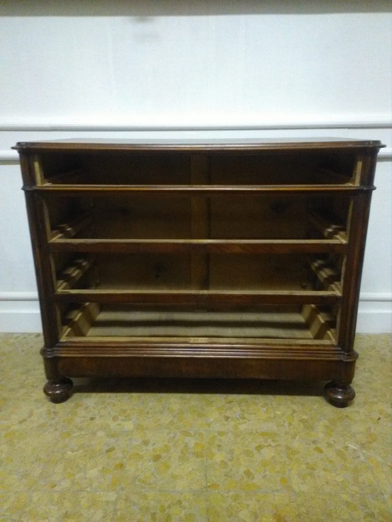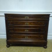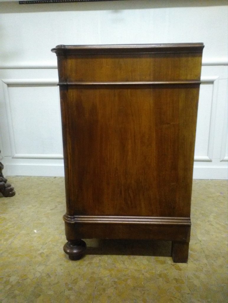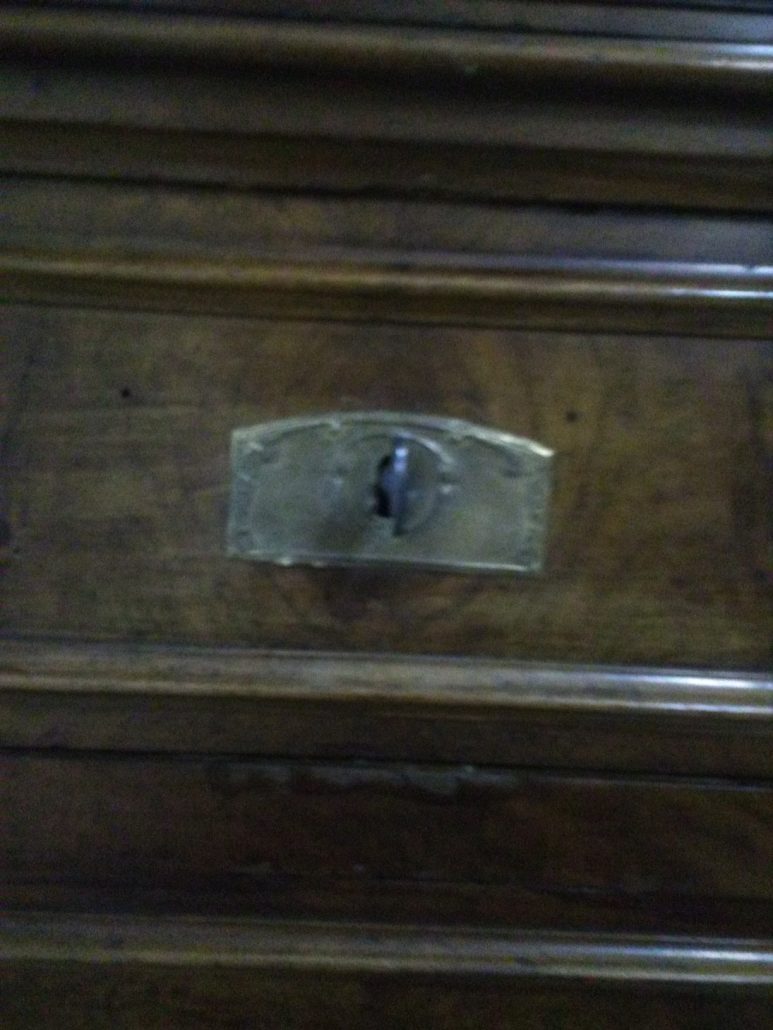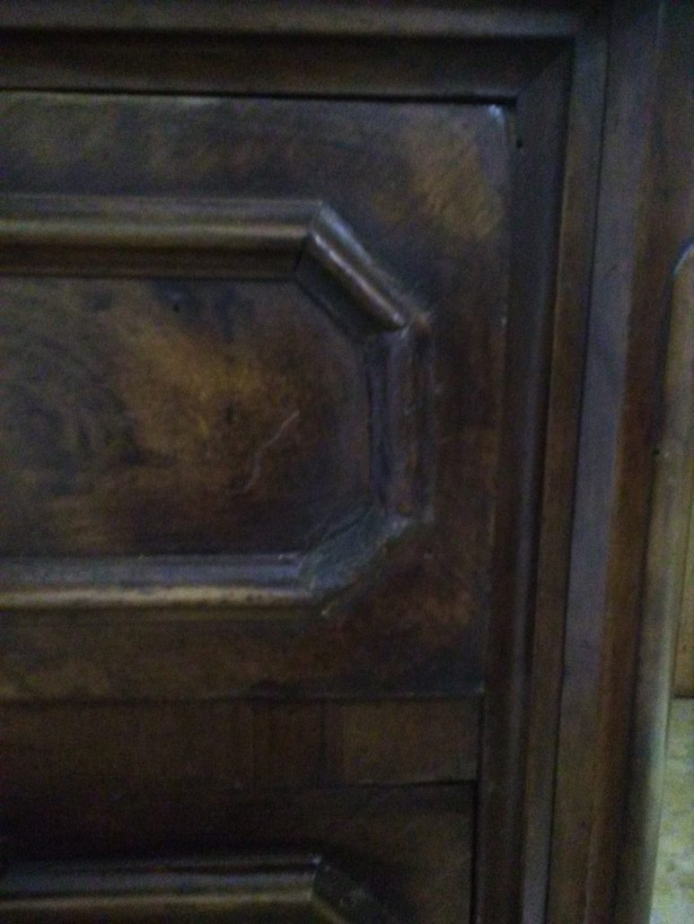 Particolarità: Il mobile ha subito un restauro non da un esperto, alcune parti di cornici sui frontali dei cassetti sono state reintegrate con dello stucco tinto (vedi fotografie).