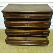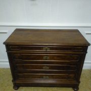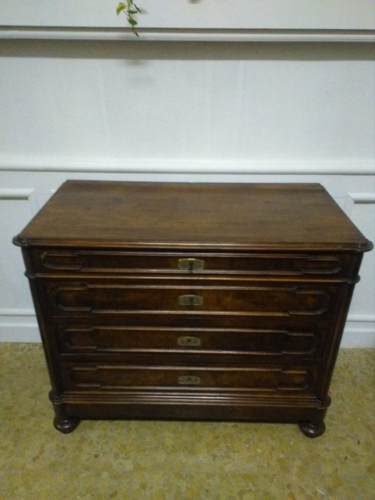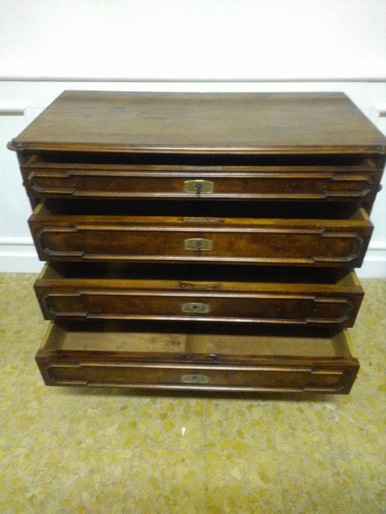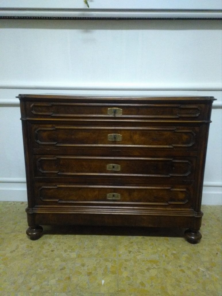 Cassettone in noce massello con parti impiallacciate. Arredo costituito da quattro cassetti, muniti di serratura, racchiusi e decorati da cornici applicate. Alto zoccolo sostenuto da piedi a bulbo anteriormente. Piano con cornice smussata. Il cassettone presenta l’utilizzo del noce, anche nelle parti interne come i fondi e le spondine dei cassetti. Questo lo rende particolare e prezioso, mentre le parti impiallacciate si limitano all’esigenza di porre la venatura del legno in verticale, come nello zoccolo, per creare un bell’effetto visivo, impossibile da ottenere con legno massello.