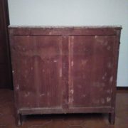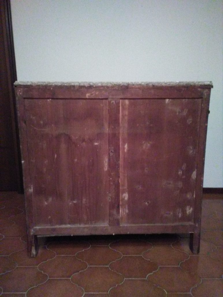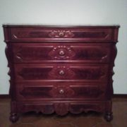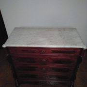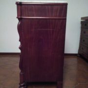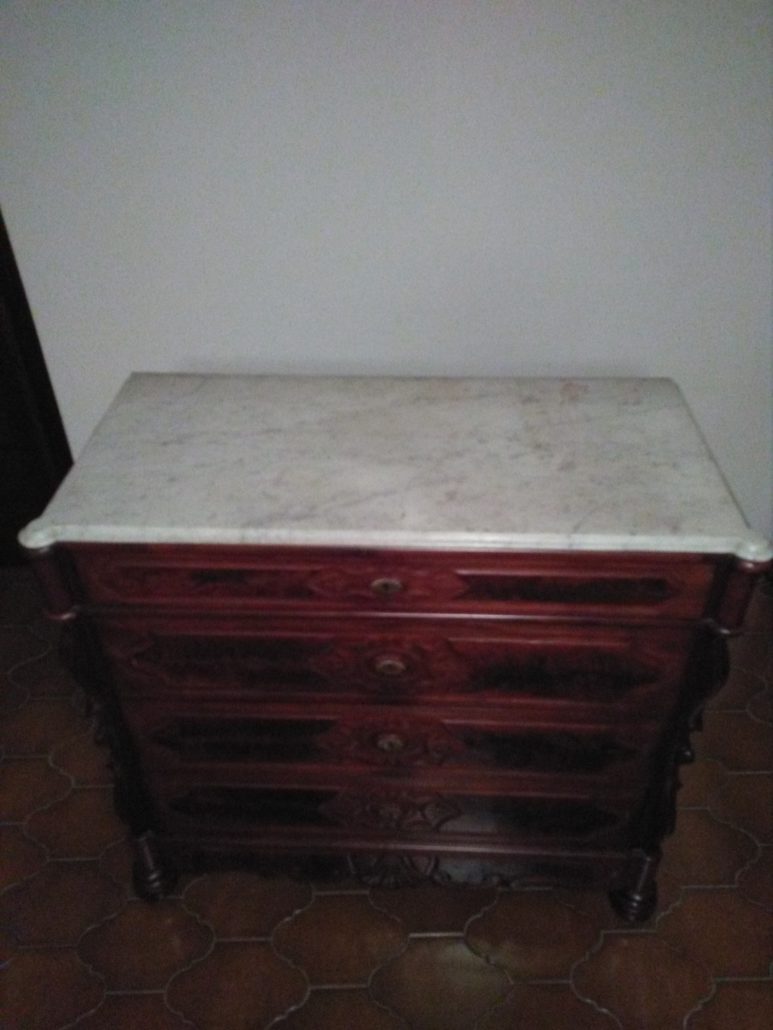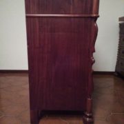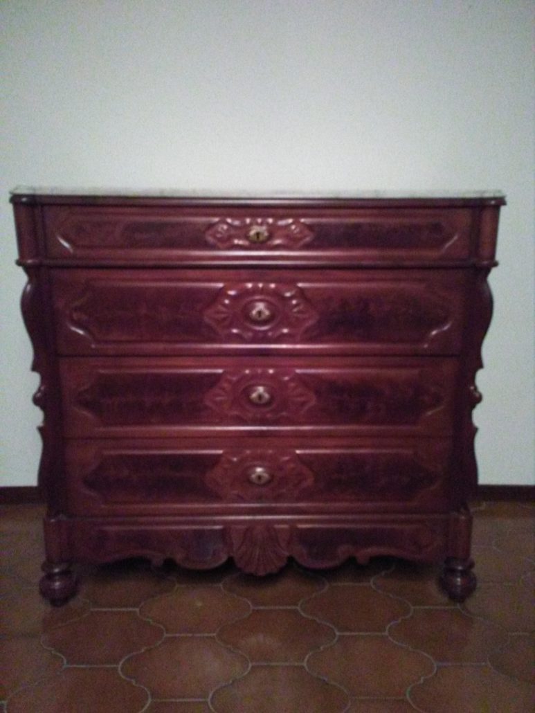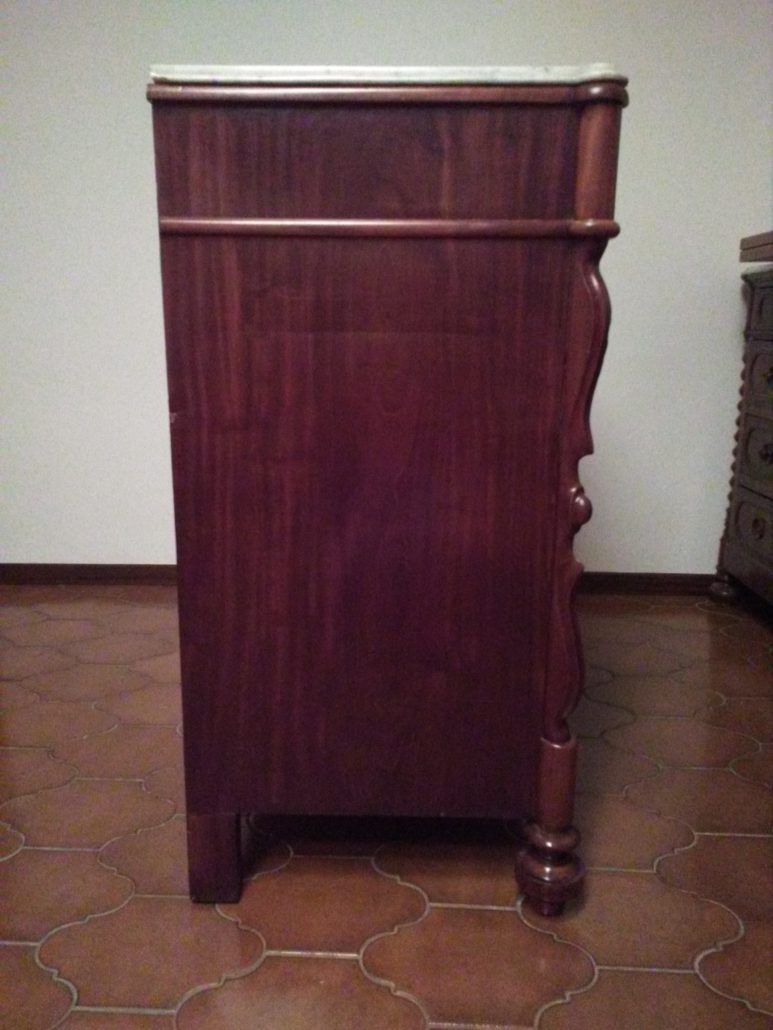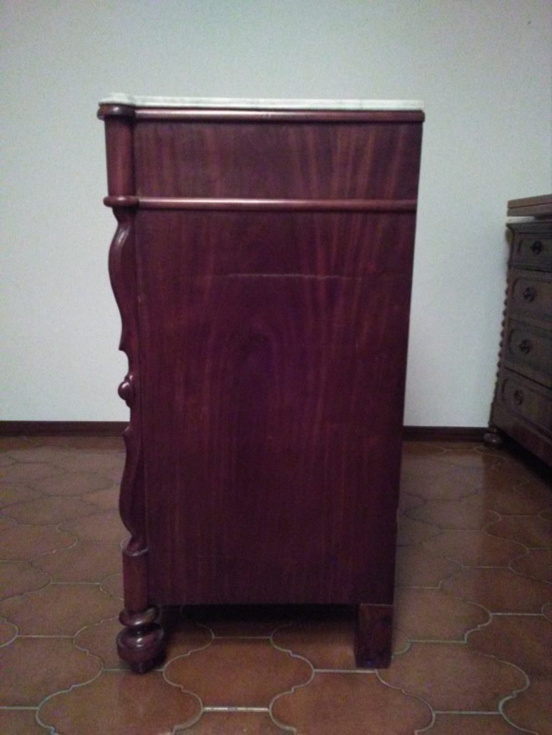 Cassettone in mogano massello e lastronato in piuma di mogano. Il mobile si presenta con il fronte suddiviso in quattro ampi cassetti con serratura, di cui il primo separato dagli altri con una cornicetta che continua sui fianchi. I frontali dei cassetti presentano una modanatura che crea una campitura nella quale è inserita con grande maestria la piuma di mogano specchiata da un lato all’altro. Montanti intagliati e posti a quarantacinque gradi, piedi a bulbo e alto zoccolo celante quinto cassetto (segreto) che si chiude a chiave azionando la serratura del cassetto superiore due volte. Piano sagomato in marmo bianco.