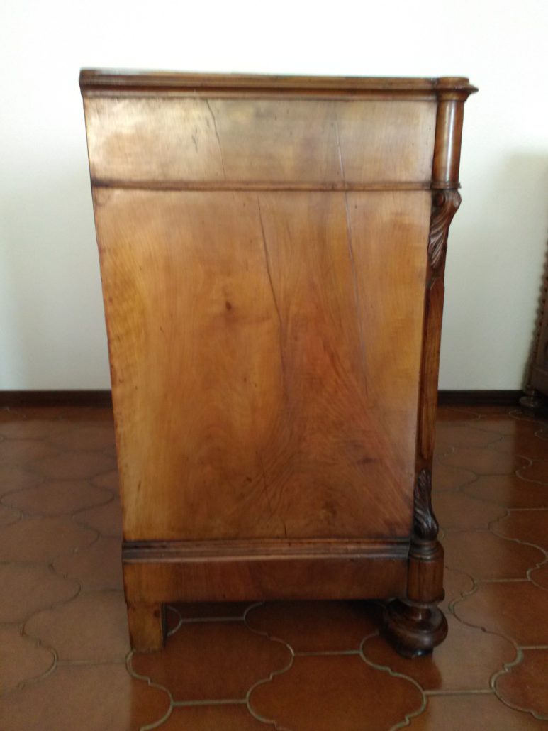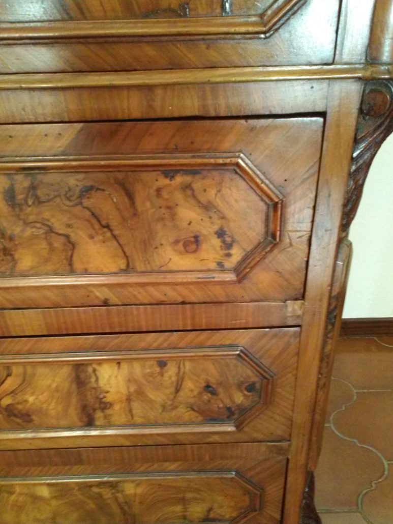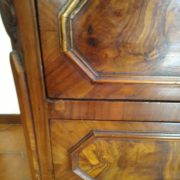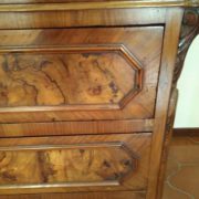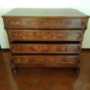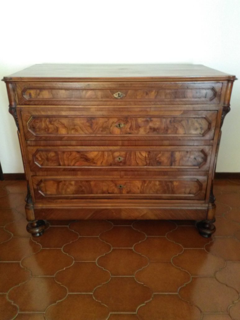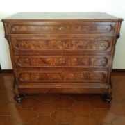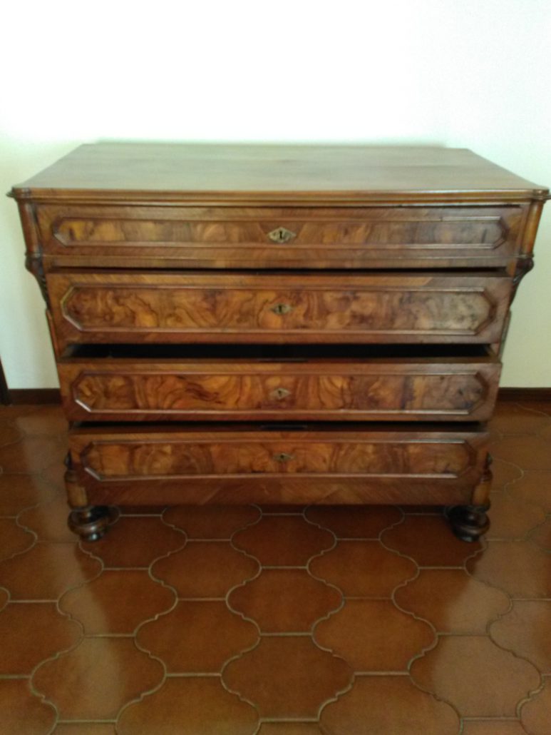 Cassettone in noce. Quattro cassetti, di cui il primo più piccolo, muniti di serrature, decorati con applicazioni di cornici con all’interno radica di noce. Montanti a quarantacinque gradi con applicati intagli di volute fogliacee. Piedi a bulbo e alto zoccolo.