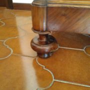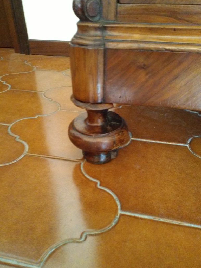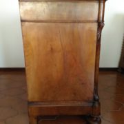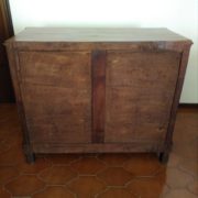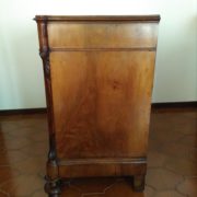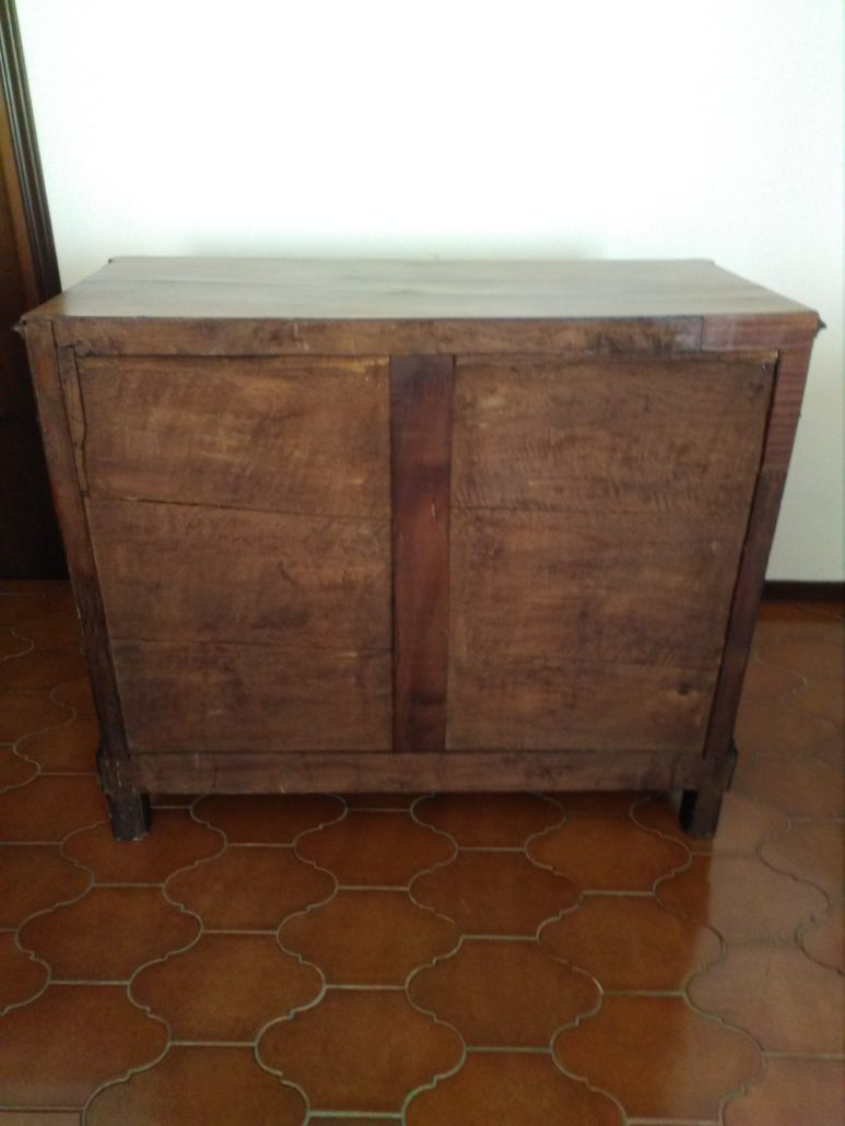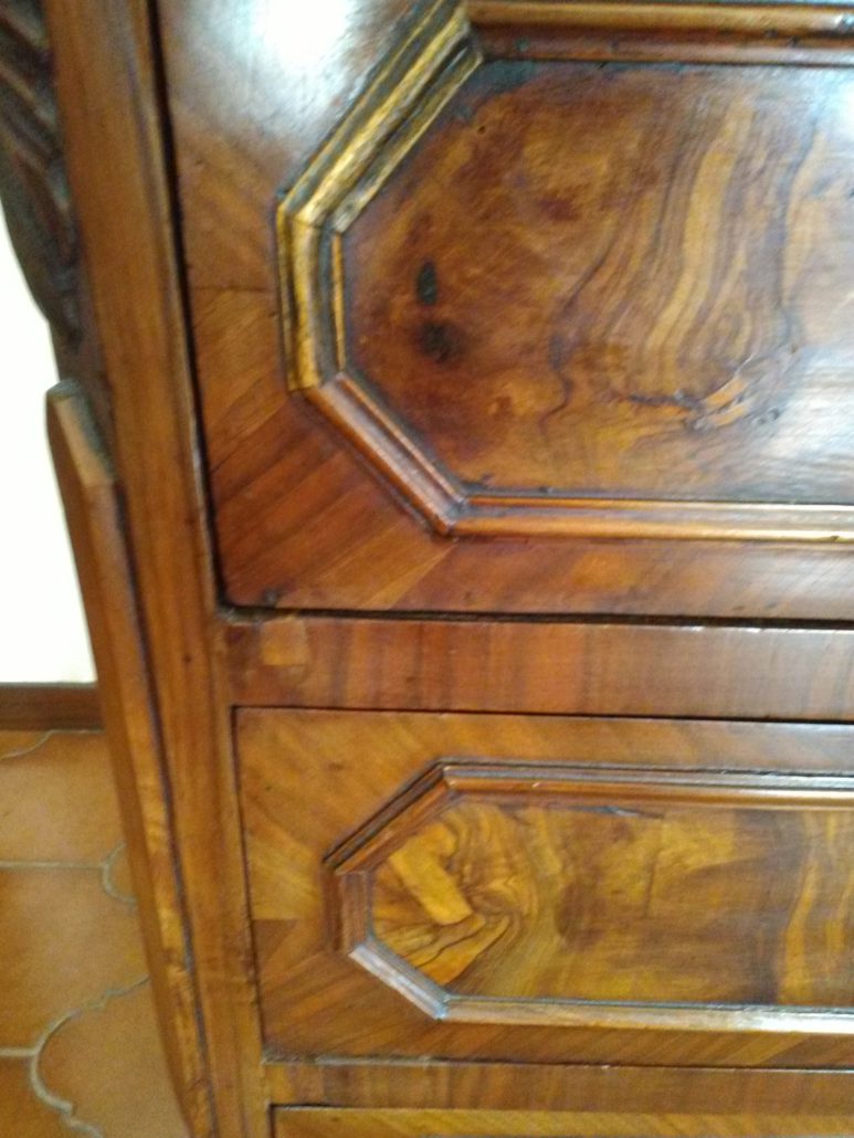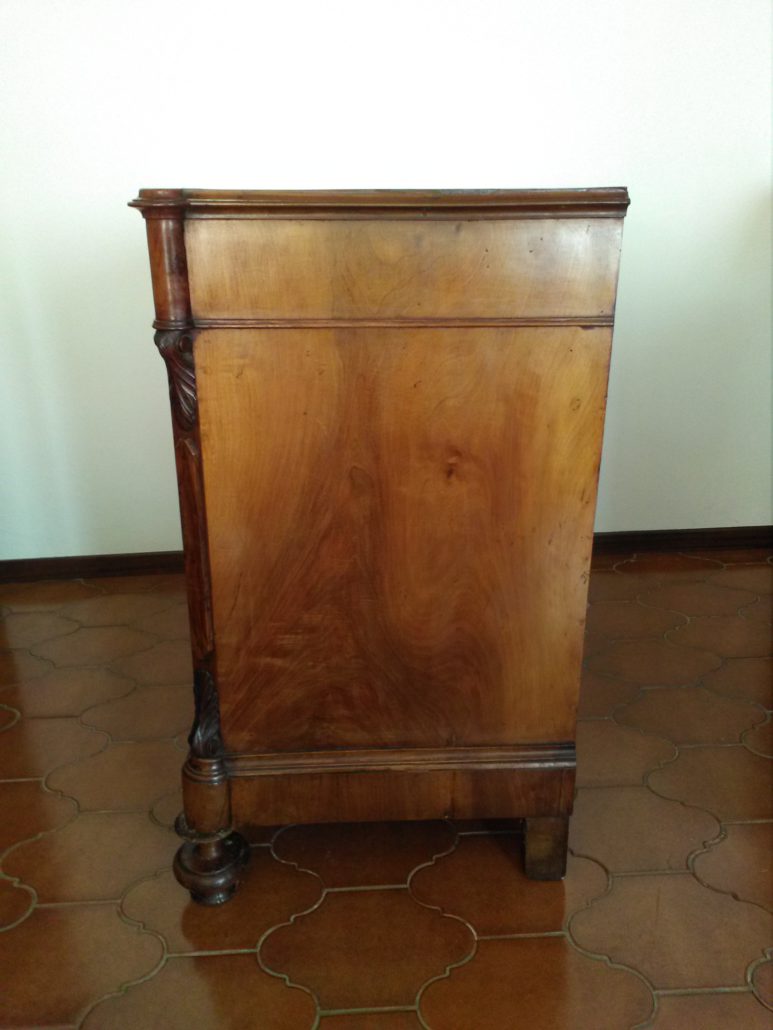 Cassettone in noce. Quattro cassetti, di cui il primo più piccolo, muniti di serrature, decorati con applicazioni di cornici con all’interno radica di noce. Montanti a quarantacinque gradi con applicati intagli di volute fogliacee. Piedi a bulbo e alto zoccolo.