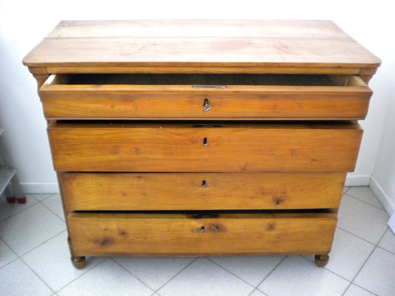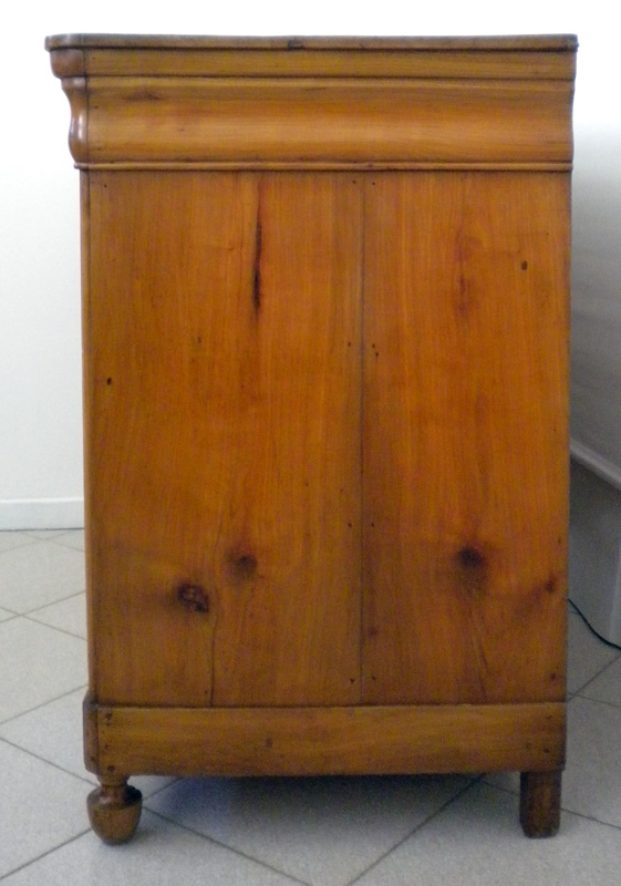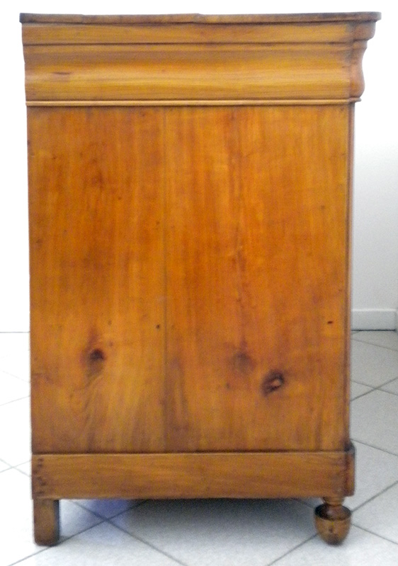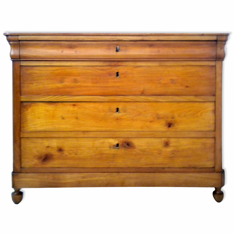 Cassettone Luigi Filippo in ciliegio massello, costituito da quattro cassetti di cui il primo più piccolo e sagomato a “tulipano”, piedi anteriori a trottola