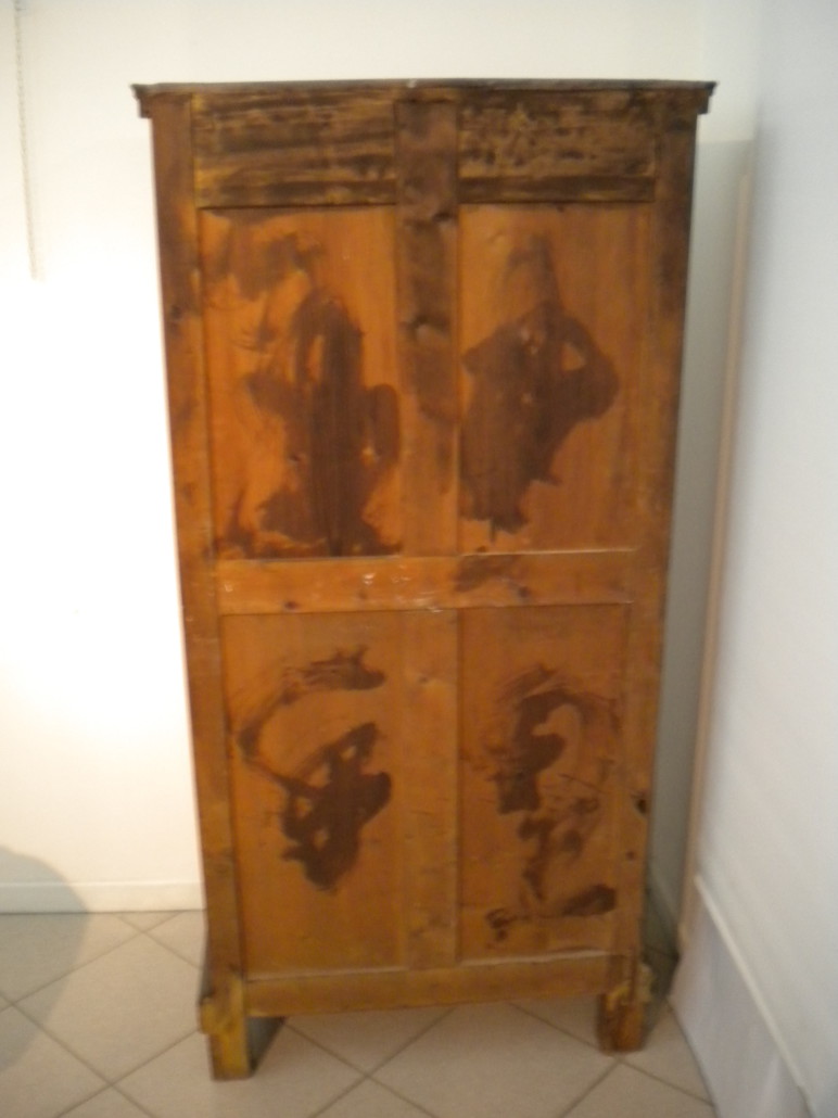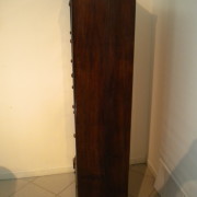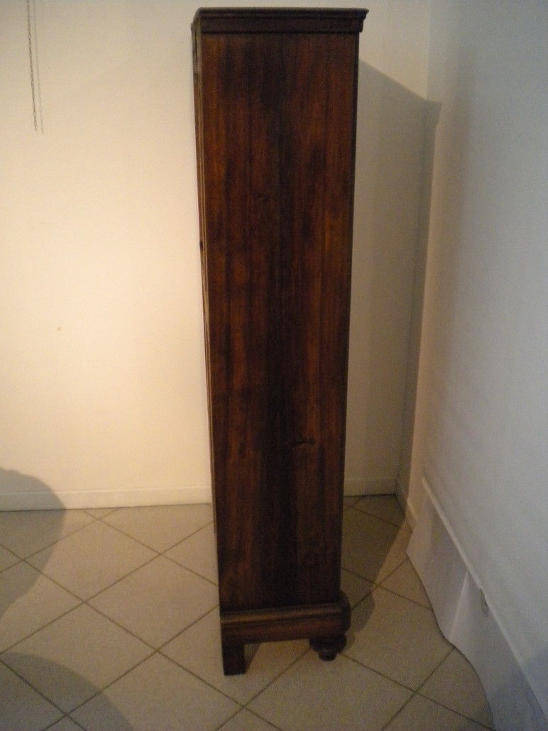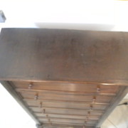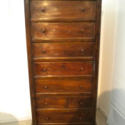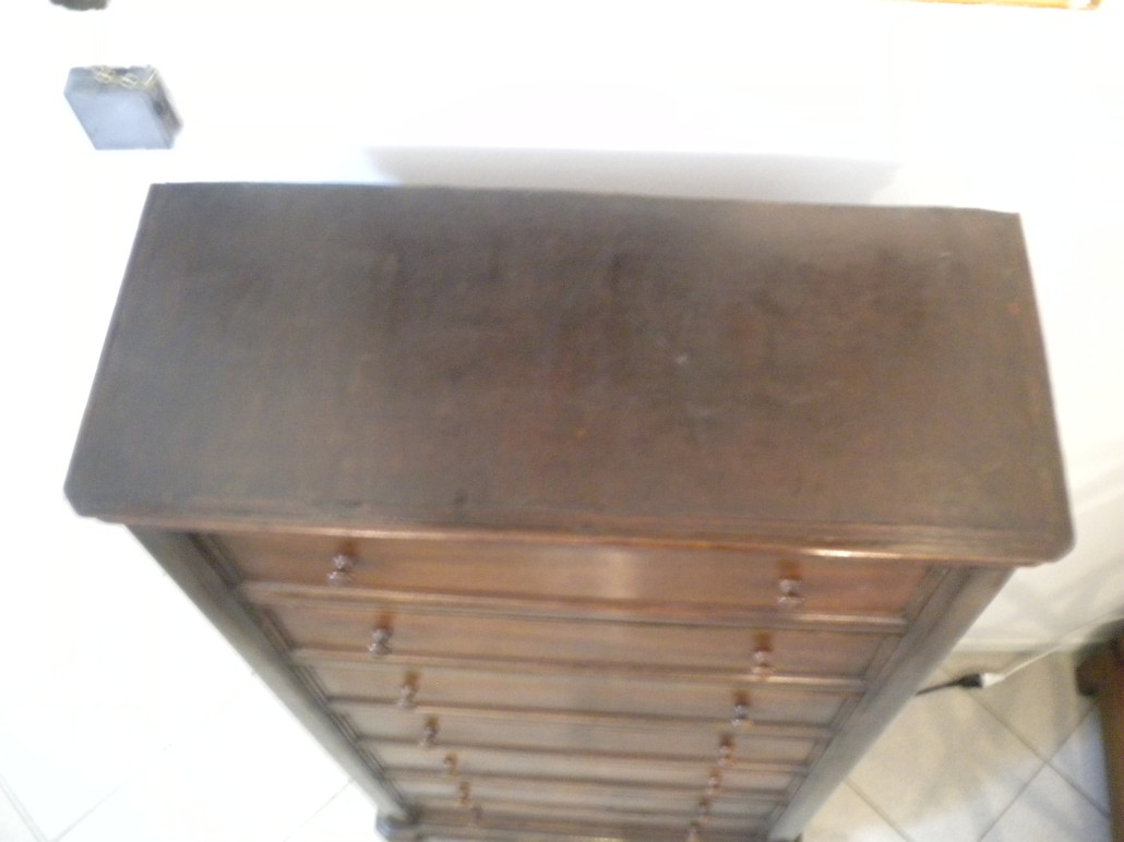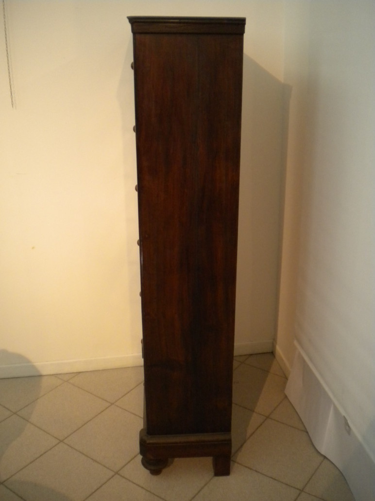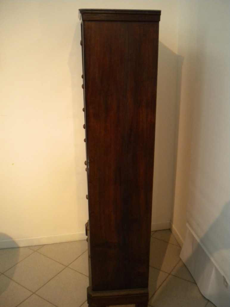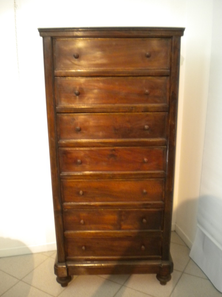 Settimanale in noce massello e impiallacciato. Sette cassetti incorniciati, piedi anteriori a cipolla.
