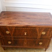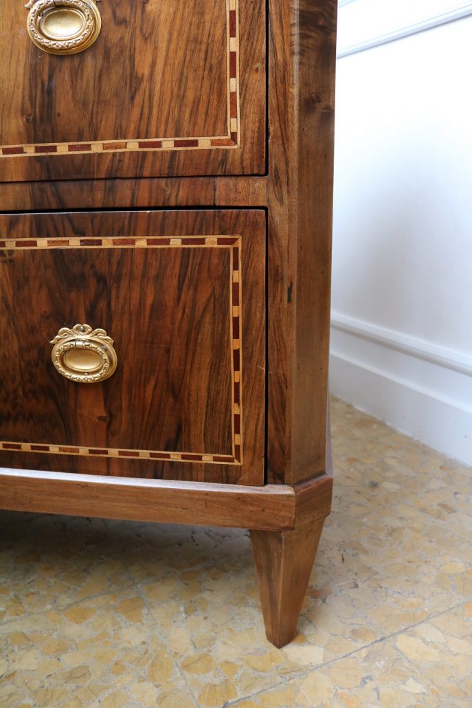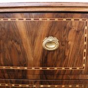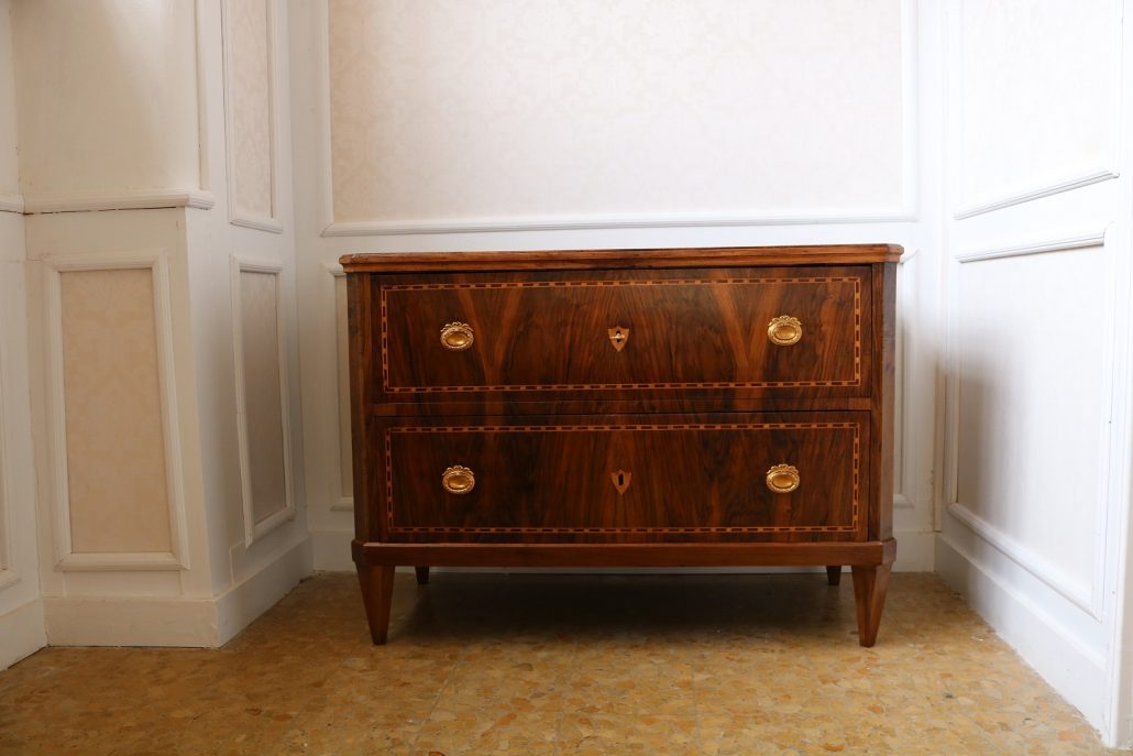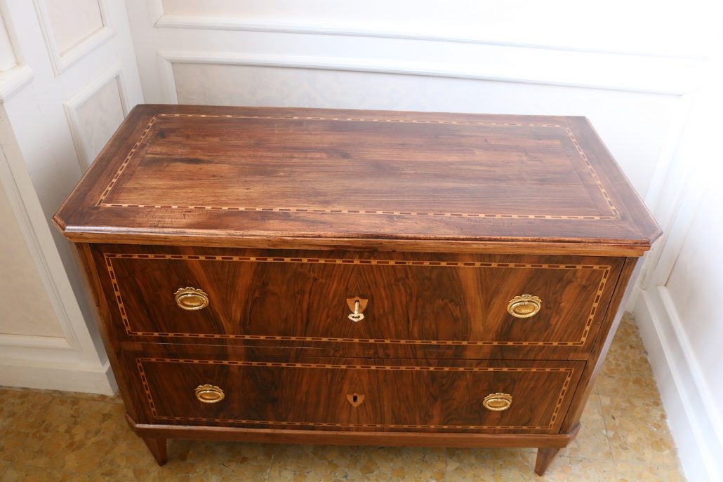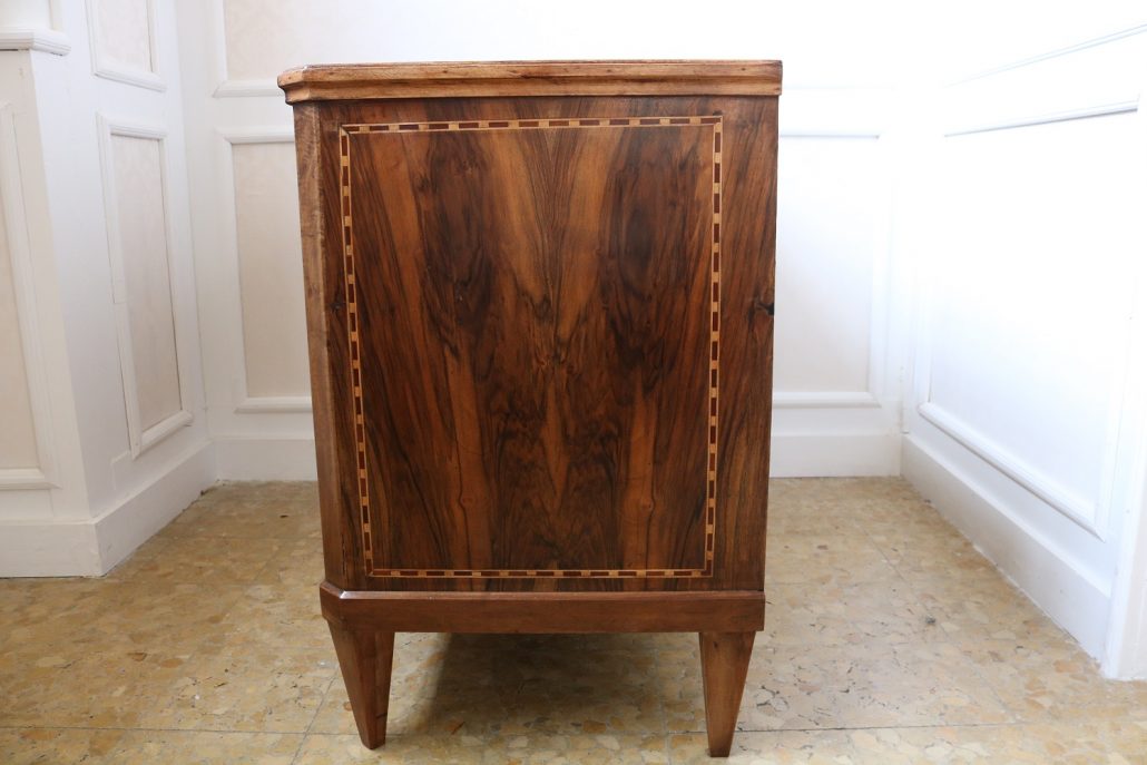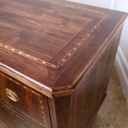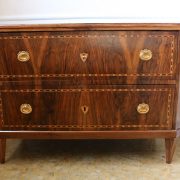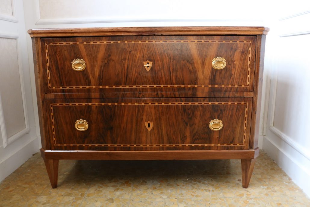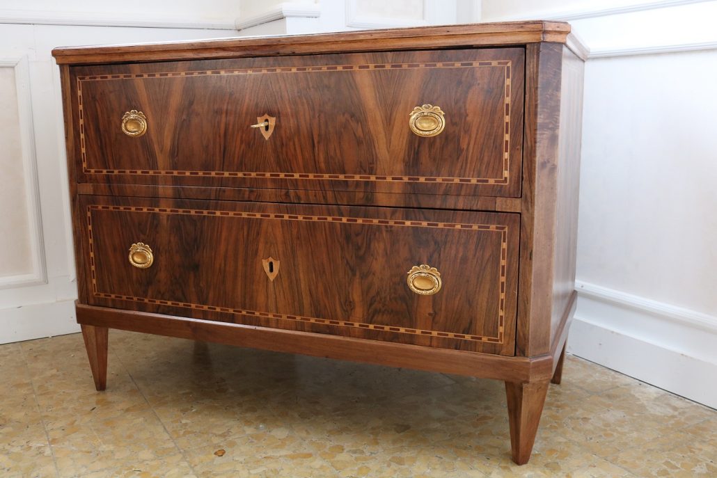 Cassettone Direttorio in noce. Arredo costituito da due grandi cassetti, muniti di serratura, piedi a obelisco rovesciato, montanti sfaccettati e piano leggermente aggettante. Il mobile presenta una linea semplice e pulita, la decorazione è affidata, oltre che alla bella venatura della nobile essenza scelta, ad un intarsio di acero alternato a palissandro in un motivo ripetitivo, a creare delle campiture sulle superfici. La maniglieria, presenta una buona cesellatura e una splendida doratura. Il cassettone presenta tutte le caratteristiche del periodo post Luigi XVI, mentre infatti il disegno architettonico è nel pieno criterio neoclassico, la decorazione è molto più sobria e semplice, spogliata di qualsiasi emblema che possa ricordare l’ancien régime.