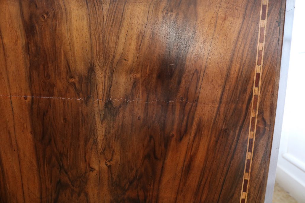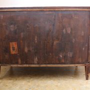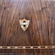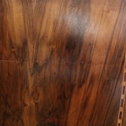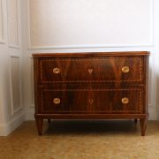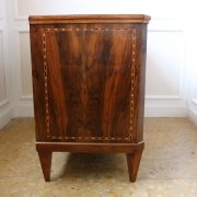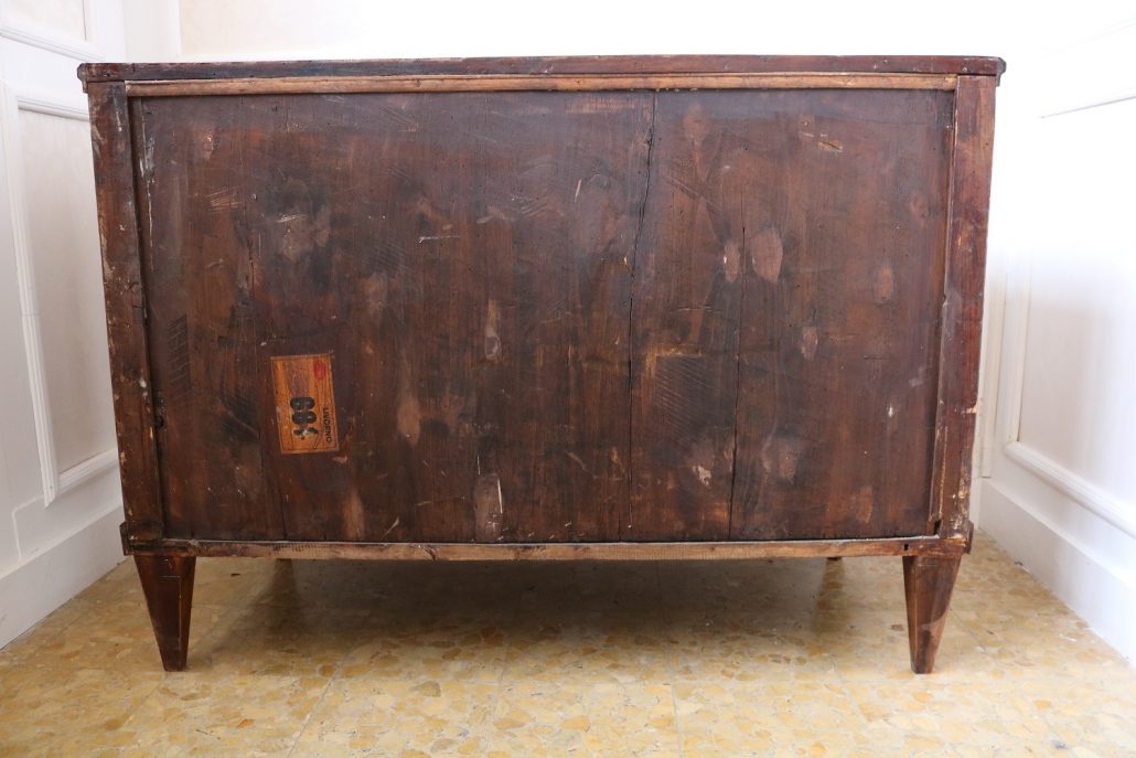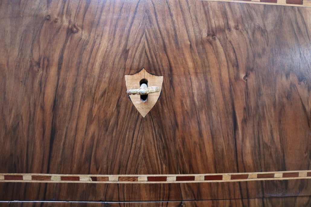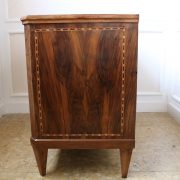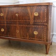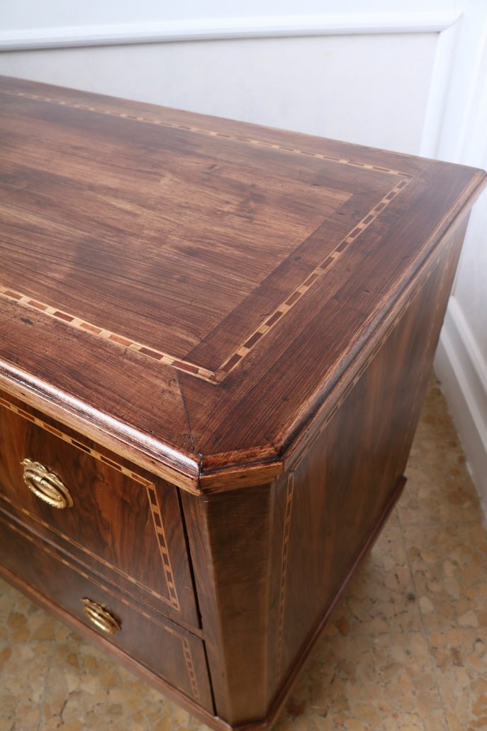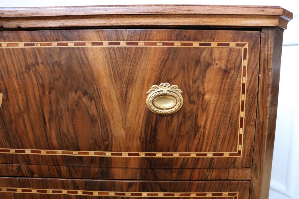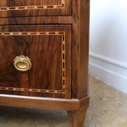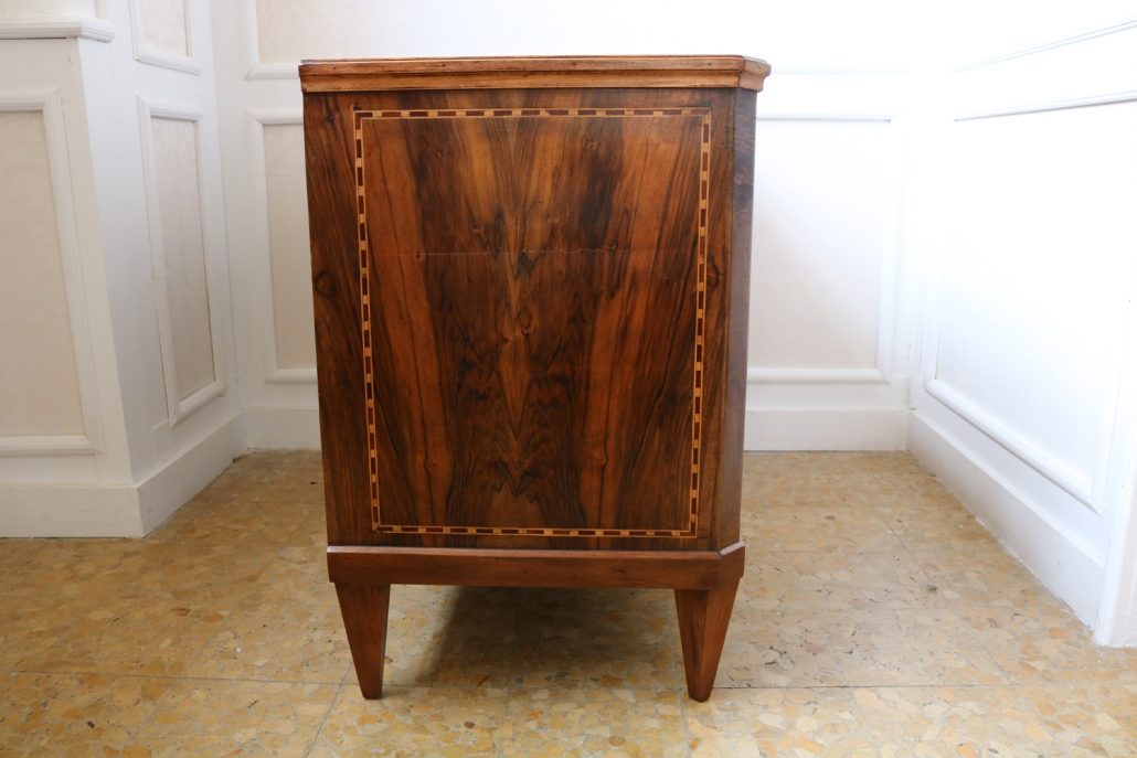 Cassettone Direttorio in noce. Arredo costituito da due grandi cassetti, muniti di serratura, piedi a obelisco rovesciato, montanti sfaccettati e piano leggermente aggettante. Il mobile presenta una linea semplice e pulita, la decorazione è affidata, oltre che alla bella venatura della nobile essenza scelta, ad un intarsio di acero alternato a palissandro in un motivo ripetitivo, a creare delle campiture sulle superfici. La maniglieria, presenta una buona cesellatura e una splendida doratura. Il cassettone presenta tutte le caratteristiche del periodo post Luigi XVI, mentre infatti il disegno architettonico è nel pieno criterio neoclassico, la decorazione è molto più sobria e semplice, spogliata di qualsiasi emblema che possa ricordare l’ancien régime.