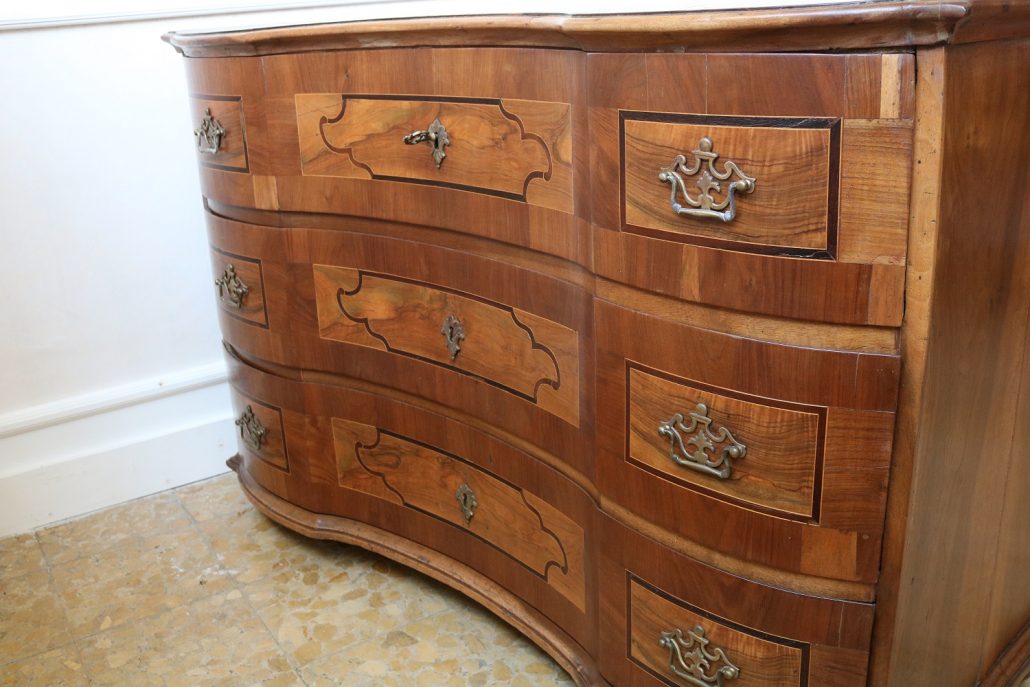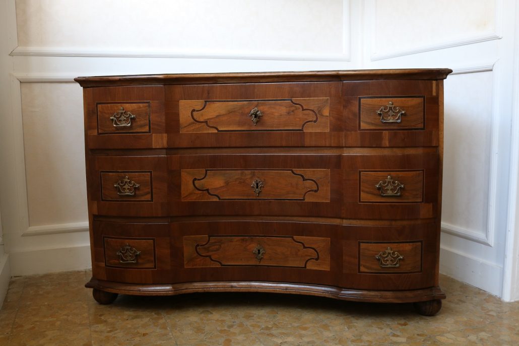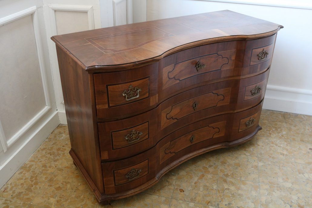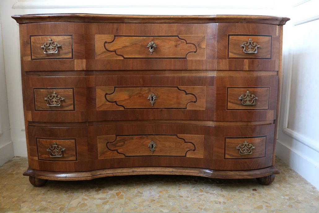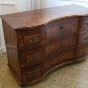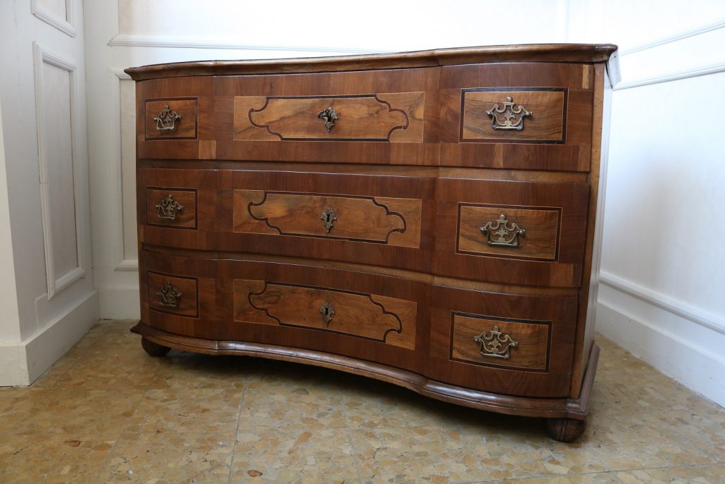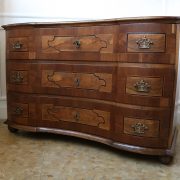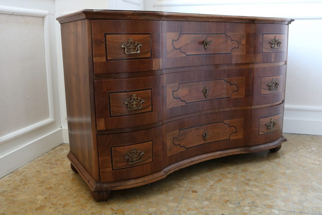 Cassettone intarsiato in noce e legni vari. Comò caratterizzato da un fronte mosso costituito da tre ampi cassetti muniti di maniglie e serrature. Quattro piedi a boccia, con un leggero intaglio geometrico, sostengono la struttura arricchita da uno zoccolo a gola ed un piano leggermente aggettante. La superficie è riccamente intarsiata con forme geometriche completate da filettature, ampie riserve si alternano in tonalità differenti in un susseguirsi di essenze varie. Il piano presenta anch’esso intarsi con riserve che seguono la forma del cassettone.Il frontale, oltre alla pregevole lavorazione mossa, presenta un’ancor più ricchezza d’intarsio. Il disegno eseguito mediante questa antica tecnica si particolarizza nell’asimmetria sulle mostre dei cassetti. Mentre infatti da un lato uno dei riccioli intarsiati nella riserva centrale, piega verso l’alto, il suo pari piega verso il basso. Questo tipo di arredo di grande impatto visivo, testimonia l’abilità e la ricercatezza degli ebanisti del XVIII Secolo. Lo stile Luigi XV, attraverso la linea mossa viene enfatizzato dal ricco intarsio geometrico, mentre la “rottura” della rigorosa simmetria testimonia ancora la forte influenza barocca.