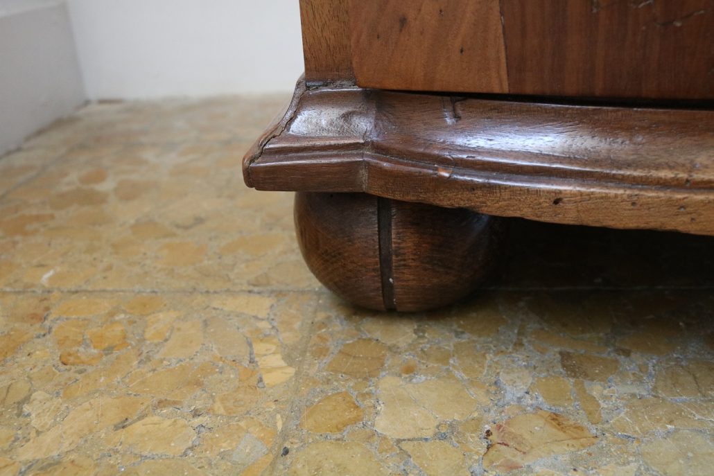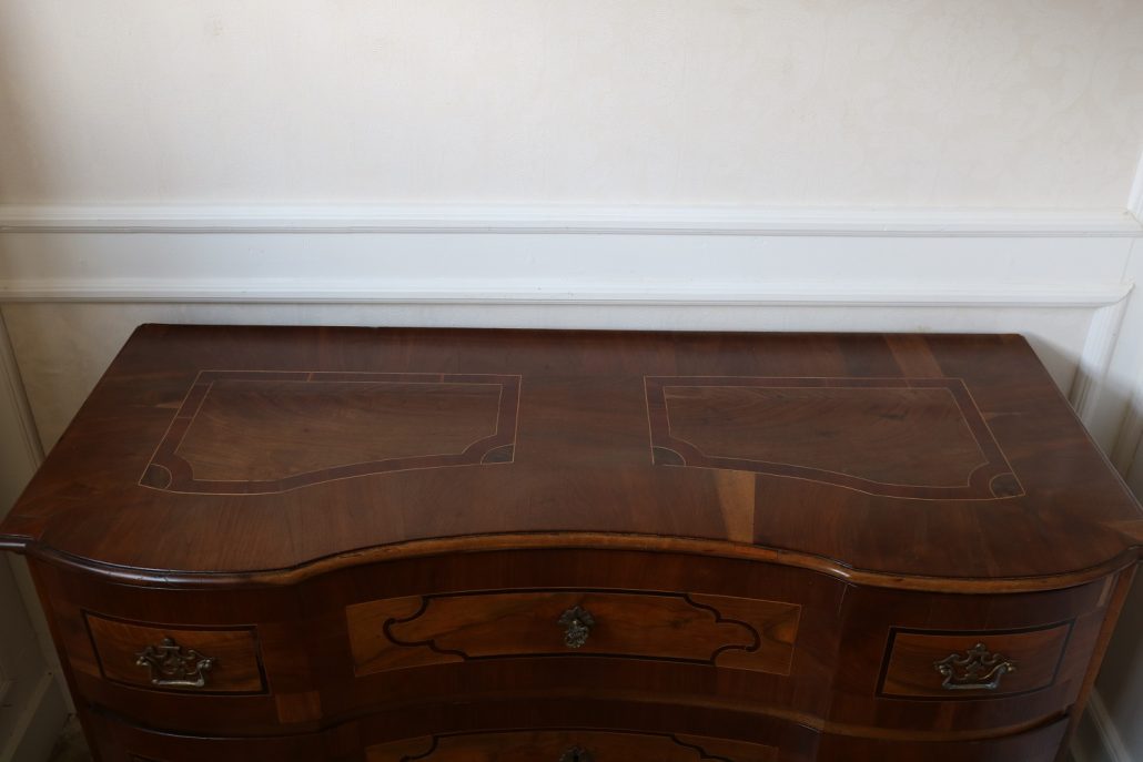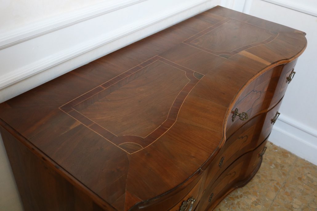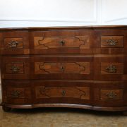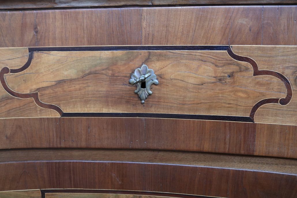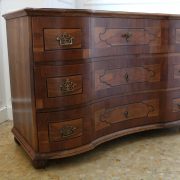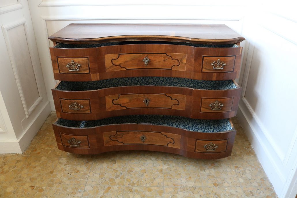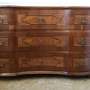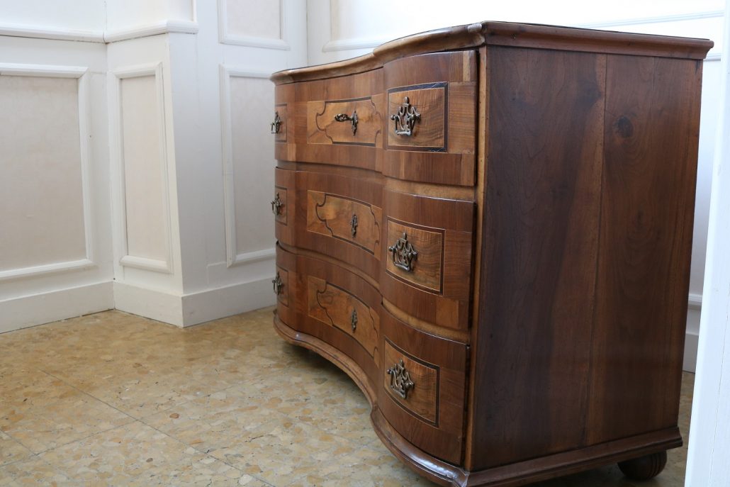 Cassettone intarsiato in noce e legni vari. Comò caratterizzato da un fronte mosso costituito da tre ampi cassetti muniti di maniglie e serrature. Quattro piedi a boccia, con un leggero intaglio geometrico, sostengono la struttura arricchita da uno zoccolo a gola ed un piano leggermente aggettante. La superficie è riccamente intarsiata con forme geometriche completate da filettature, ampie riserve si alternano in tonalità differenti in un susseguirsi di essenze varie. Il piano presenta anch’esso intarsi con riserve che seguono la forma del cassettone.Il frontale, oltre alla pregevole lavorazione mossa, presenta un’ancor più ricchezza d’intarsio. Il disegno eseguito mediante questa antica tecnica si particolarizza nell’asimmetria sulle mostre dei cassetti. Mentre infatti da un lato uno dei riccioli intarsiati nella riserva centrale, piega verso l’alto, il suo pari piega verso il basso. Questo tipo di arredo di grande impatto visivo, testimonia l’abilità e la ricercatezza degli ebanisti del XVIII Secolo. Lo stile Luigi XV, attraverso la linea mossa viene enfatizzato dal ricco intarsio geometrico, mentre la “rottura” della rigorosa simmetria testimonia ancora la forte influenza barocca.