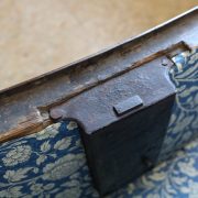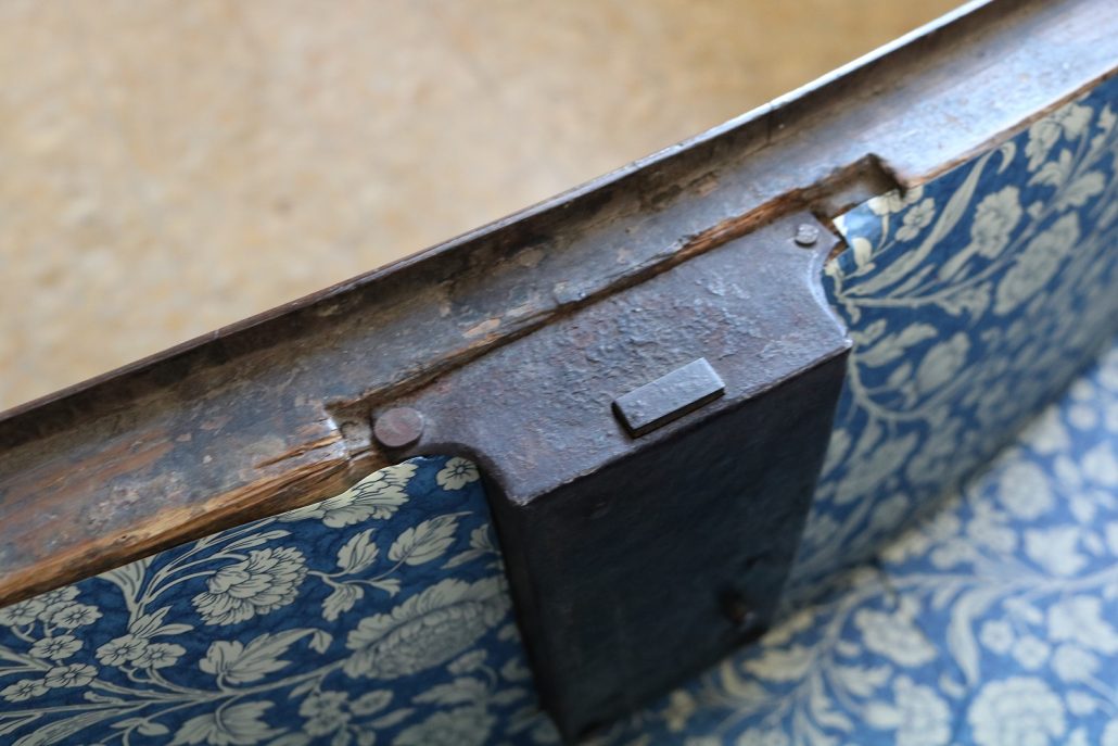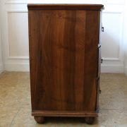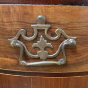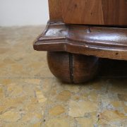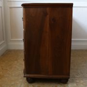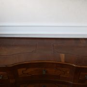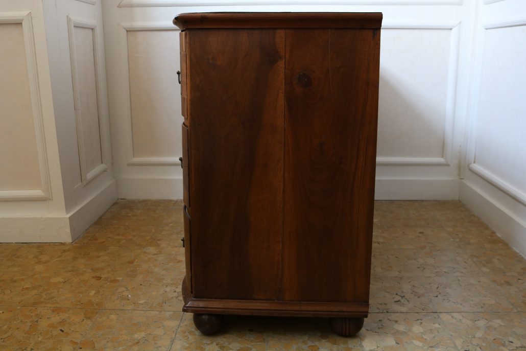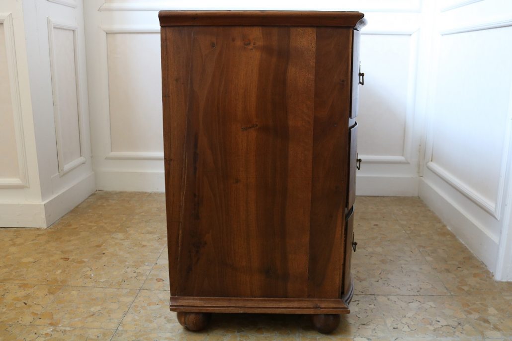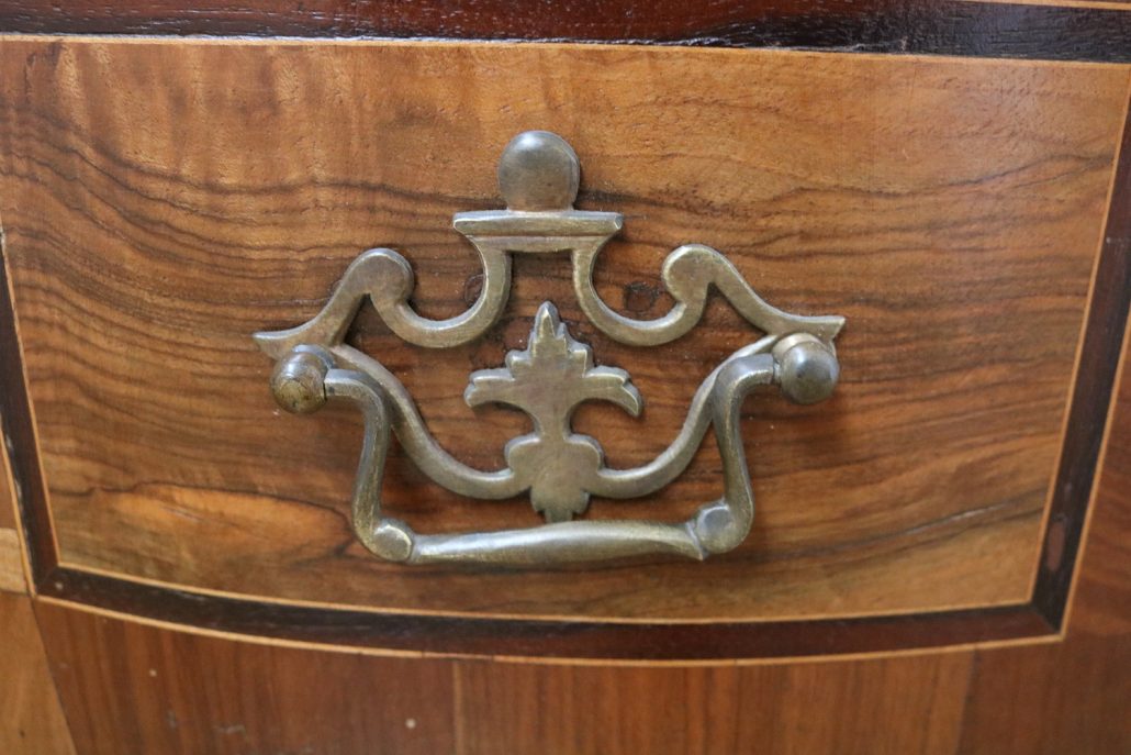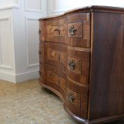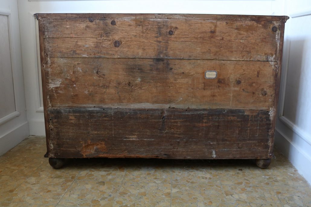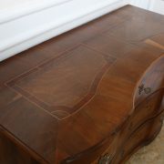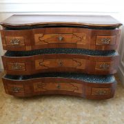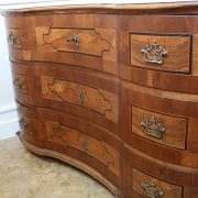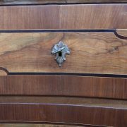 Cassettone intarsiato in noce e legni vari. Comò caratterizzato da un fronte mosso costituito da tre ampi cassetti muniti di maniglie e serrature. Quattro piedi a boccia, con un leggero intaglio geometrico, sostengono la struttura arricchita da uno zoccolo a gola ed un piano leggermente aggettante. La superficie è riccamente intarsiata con forme geometriche completate da filettature, ampie riserve si alternano in tonalità differenti in un susseguirsi di essenze varie. Il piano presenta anch’esso intarsi con riserve che seguono la forma del cassettone.Il frontale, oltre alla pregevole lavorazione mossa, presenta un’ancor più ricchezza d’intarsio. Il disegno eseguito mediante questa antica tecnica si particolarizza nell’asimmetria sulle mostre dei cassetti. Mentre infatti da un lato uno dei riccioli intarsiati nella riserva centrale, piega verso l’alto, il suo pari piega verso il basso. Questo tipo di arredo di grande impatto visivo, testimonia l’abilità e la ricercatezza degli ebanisti del XVIII Secolo. Lo stile Luigi XV, attraverso la linea mossa viene enfatizzato dal ricco intarsio geometrico, mentre la “rottura” della rigorosa simmetria testimonia ancora la forte influenza barocca.