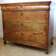 Cassettone Luigi Filippo in noce. Quattro cassetti, muniti di serratura, di cui uno più piccolo, sotto piano, con la tipica sagoma a tulipano che corre anche lungo i fianchi. Piedi a bulbo e fascia liscia nella parte inferiore. Il mobile si caratterizza per linee morbide e delicate, la mancanza di spigoli pone in risalto una ricercata armonia di disegno, mentre la decorazione minima enfatizza la bella essenza di noce dal colore mielato. Di pregiata fattura, con sezioni piuttosto importanti, questo arredo risulta massiccio e solido, ma leggero e delicato al tempo stesso.