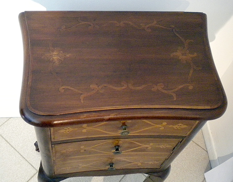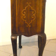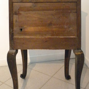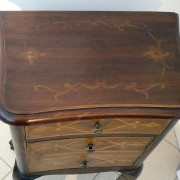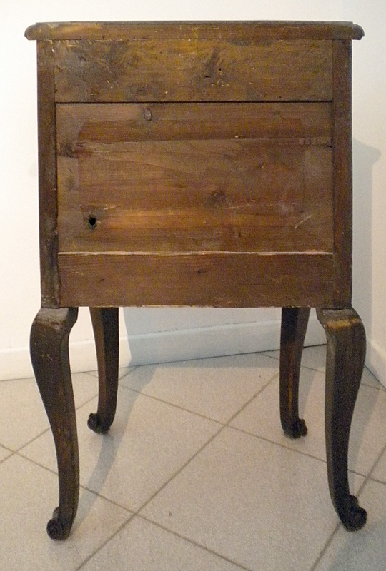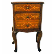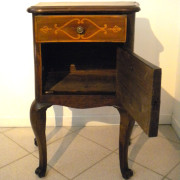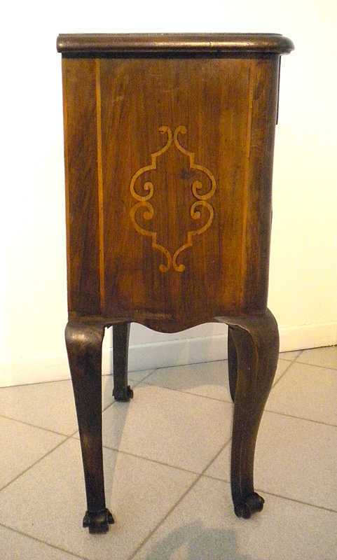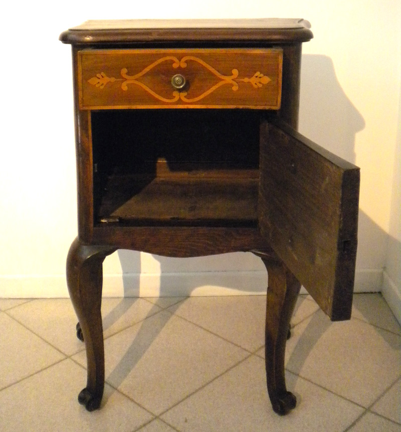 Comodino in noce massello e lastronato. Di linea mossa il mobile presenta piano sagomato, un cassettino e una antina (falsi cassettini), gambe a capriolo terminanti a voluta. Mostra cassetti, antina e fianchi intarsiati e filettati.