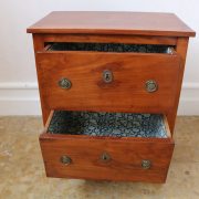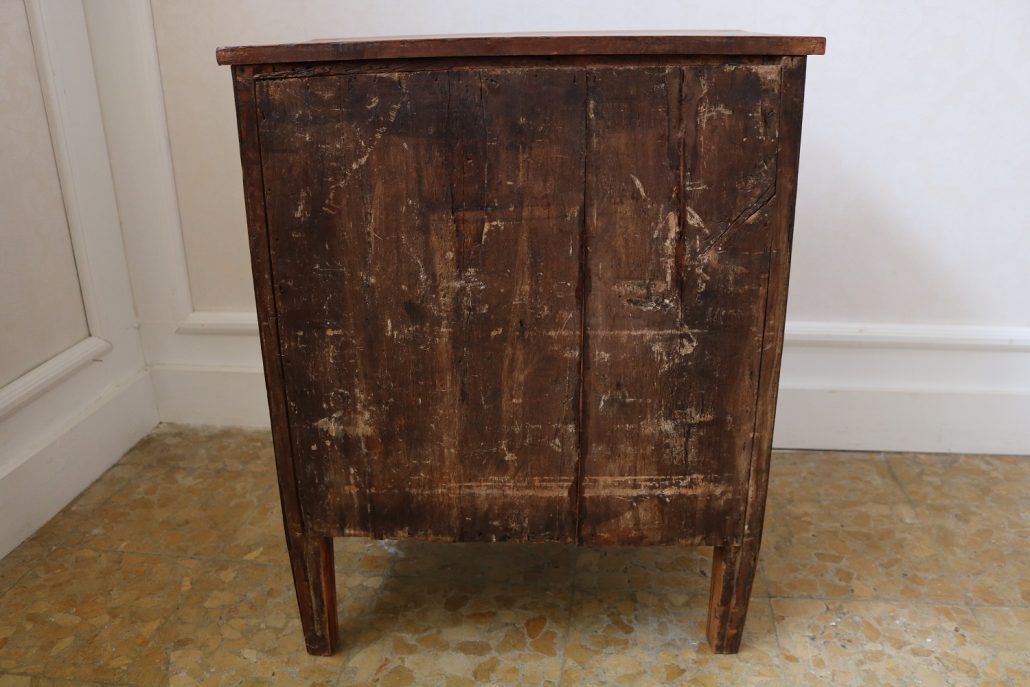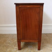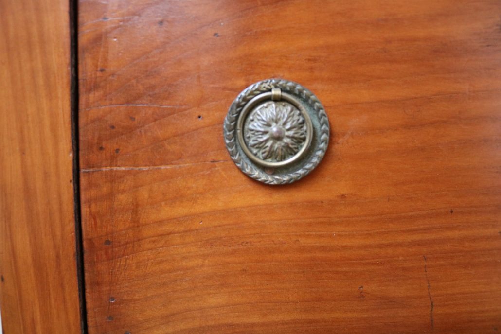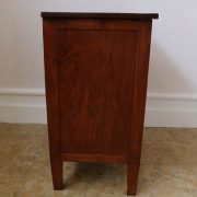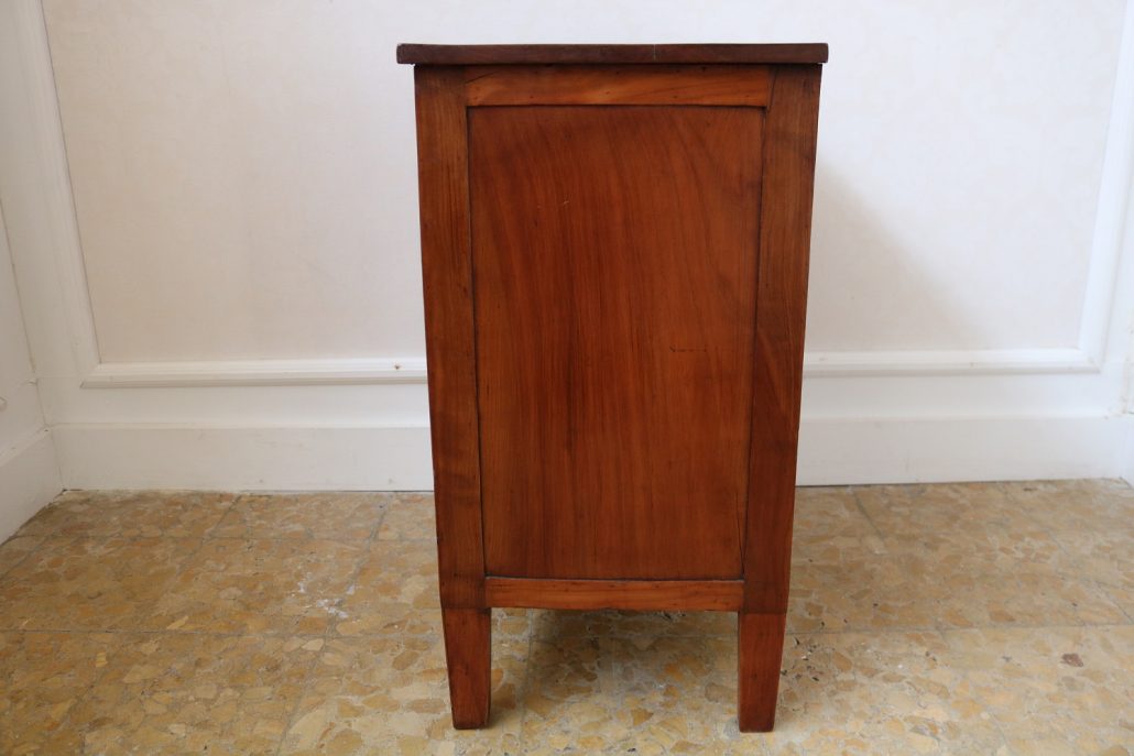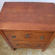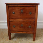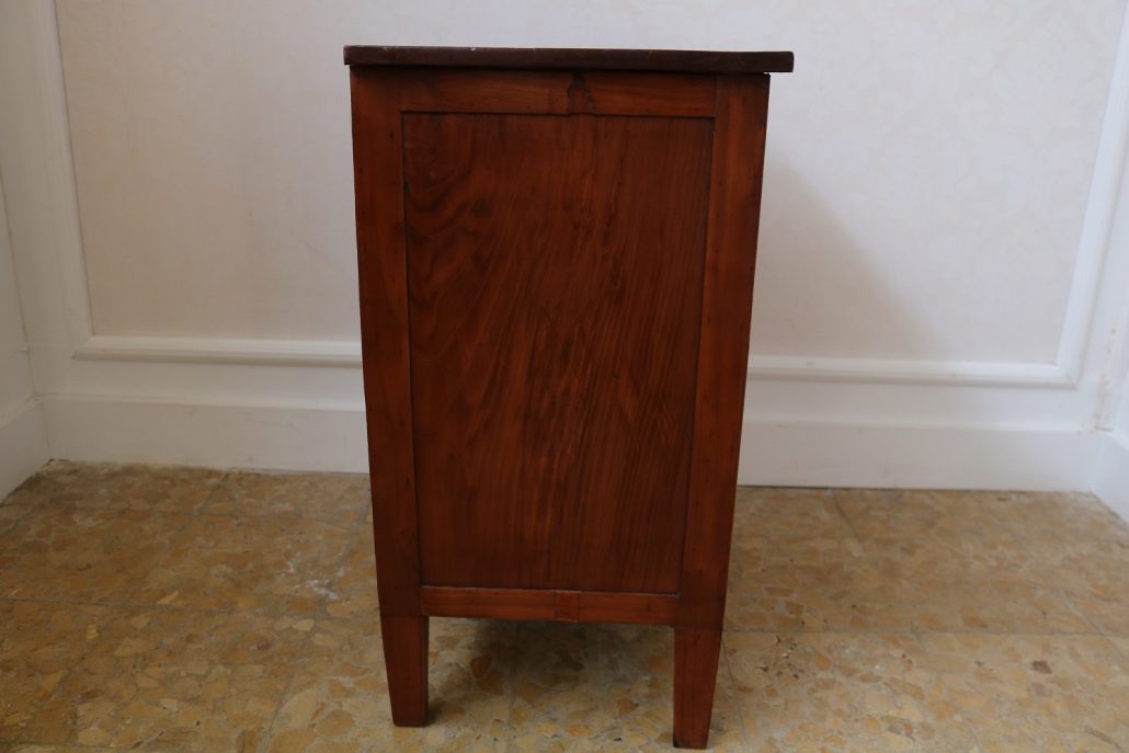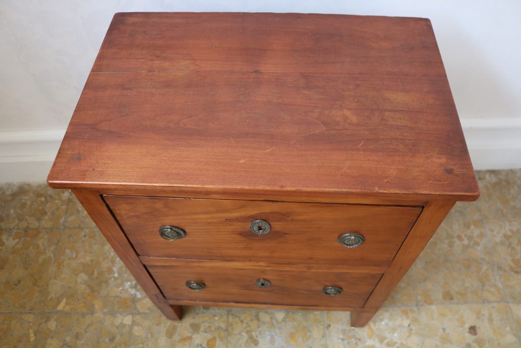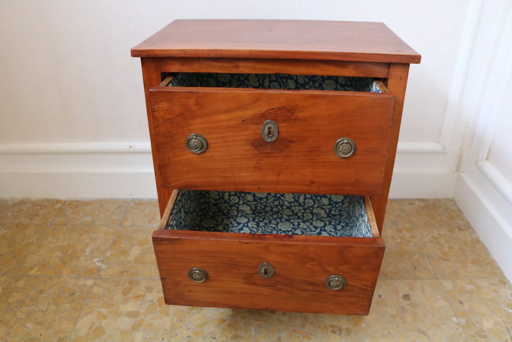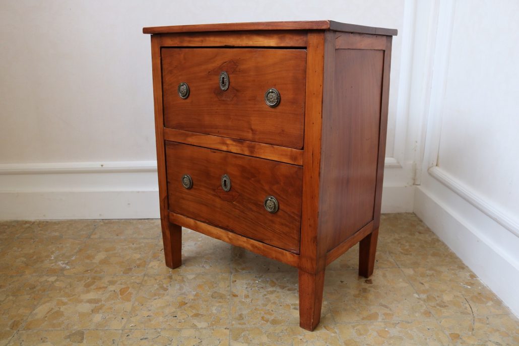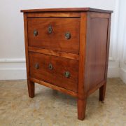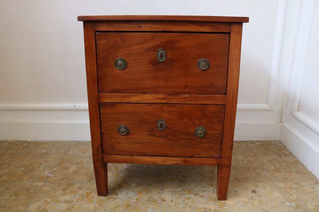 Comodino Luigi XVI in ciliegio. Arredo di contenute dimensioni costituito da due ampi cassetti, un tempo muniti di serratura, racchiusi entro una semplice struttura sostenuta da quattro piedi a obelisco rovesciato e arricchita da semplici cornici che racchiudono le superfici. Il comodino, nella sua semplicità, valorizza, la nobile essenza di ciliegio, esprimendo una sobria eleganza.