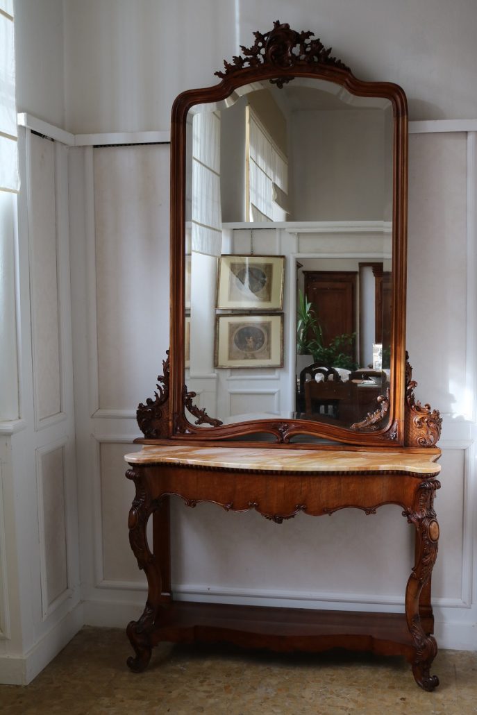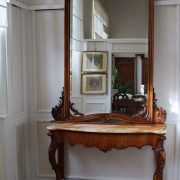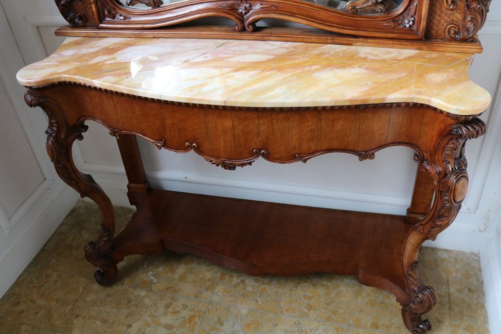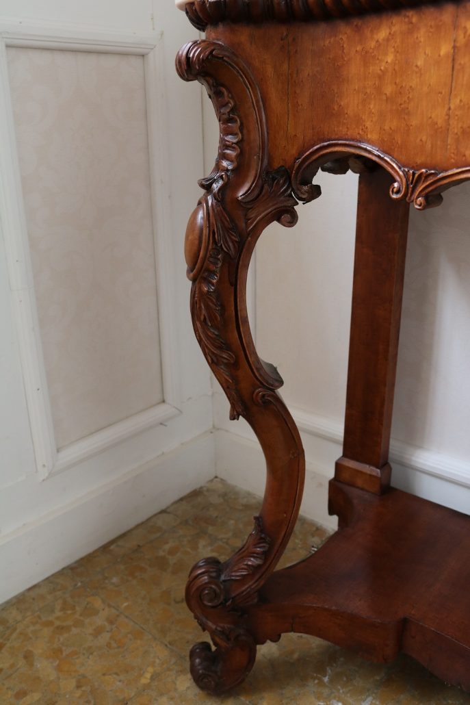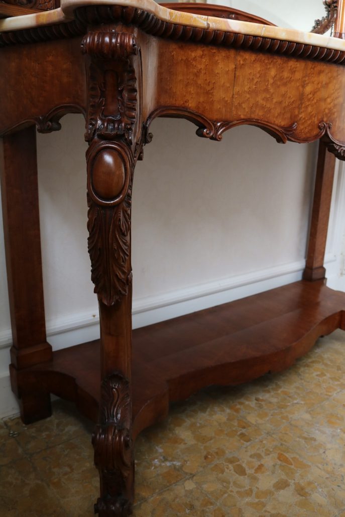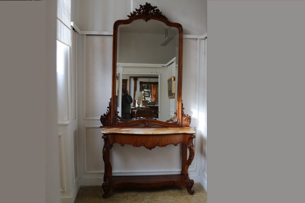 Consolle con specchiera in noce. Tavolo parietale costituito da due gambe mosse riccamente intagliate con volute fogliacee e ghirlande fiorite. Un’alta fascia sottopiano si contrappone alla ricca decorazione delle gambe con un’ampia riserva liscia decorata da un lieve motivo intagliato nella parte inferiore, mentre sotto il piano, in marmo color pesca, si presenta un motivo ricorrente a ovuli. Nella parte inferiore, un ulteriore piano alquanto mosso raccorda le gambe. Sul piano superiore poggia un’alta specchiera ingentilita da una cornice sagomata e arricchita nella parte centrale inferiore da un sinuoso movimento e decorata da una sorta di mensole laterali riccamente intagliate a motivi floreali. Nella parte alta un’elaborata decorazione ad intaglio troneggia con al centro un conchiglione. Di grande eleganza con una figura leggera e sinuosa, il mobile, pur essendo di grandi dimensioni, risulta sobrio anche se importante. La ricca decorazione, ottenuta con la tecnica dell’intaglio, rivela grande maestria e ricercatezza, come anche l’elegante proporzione e la raffinata composizione.