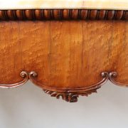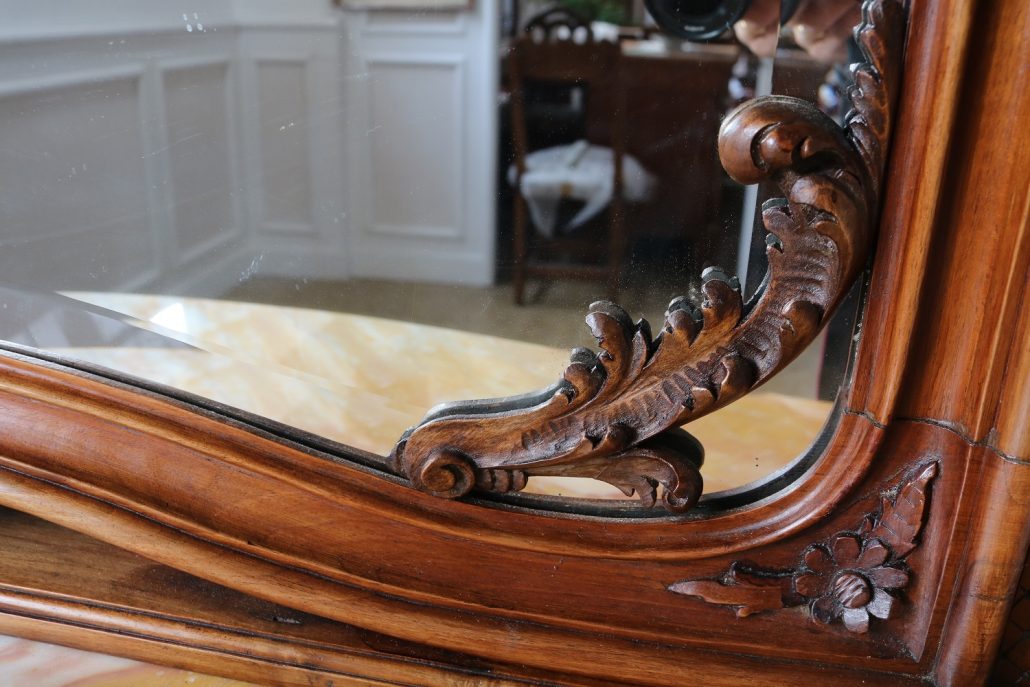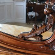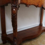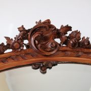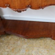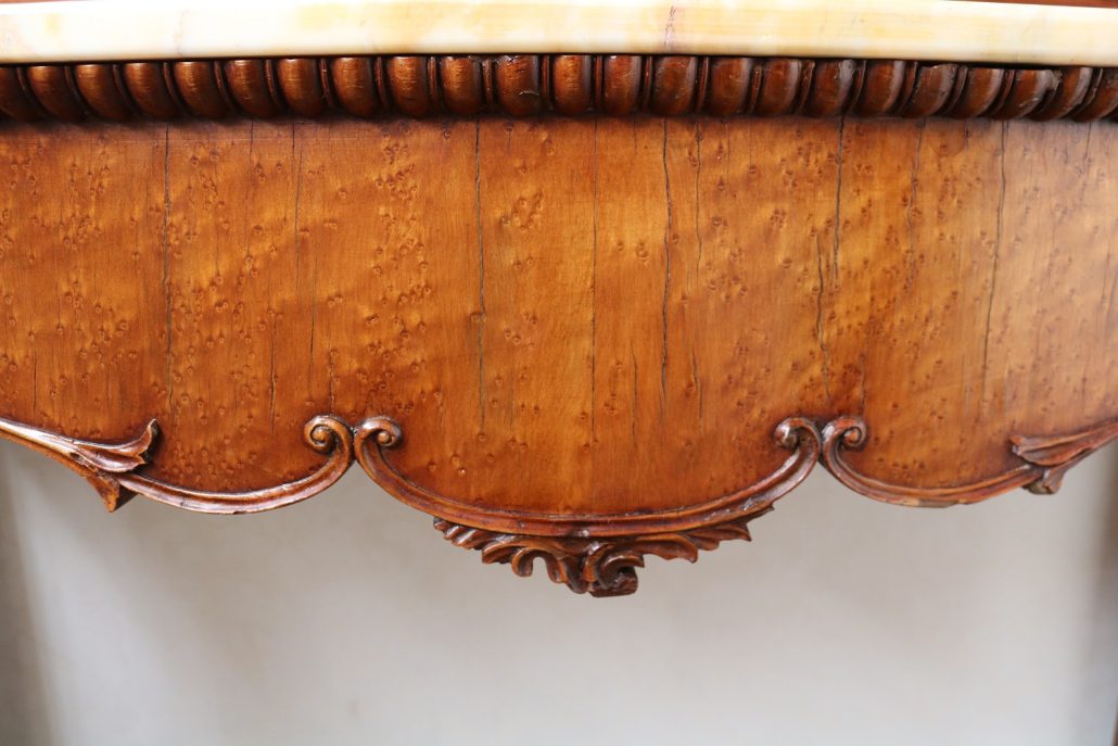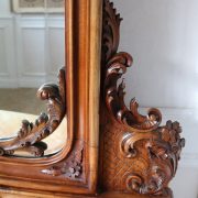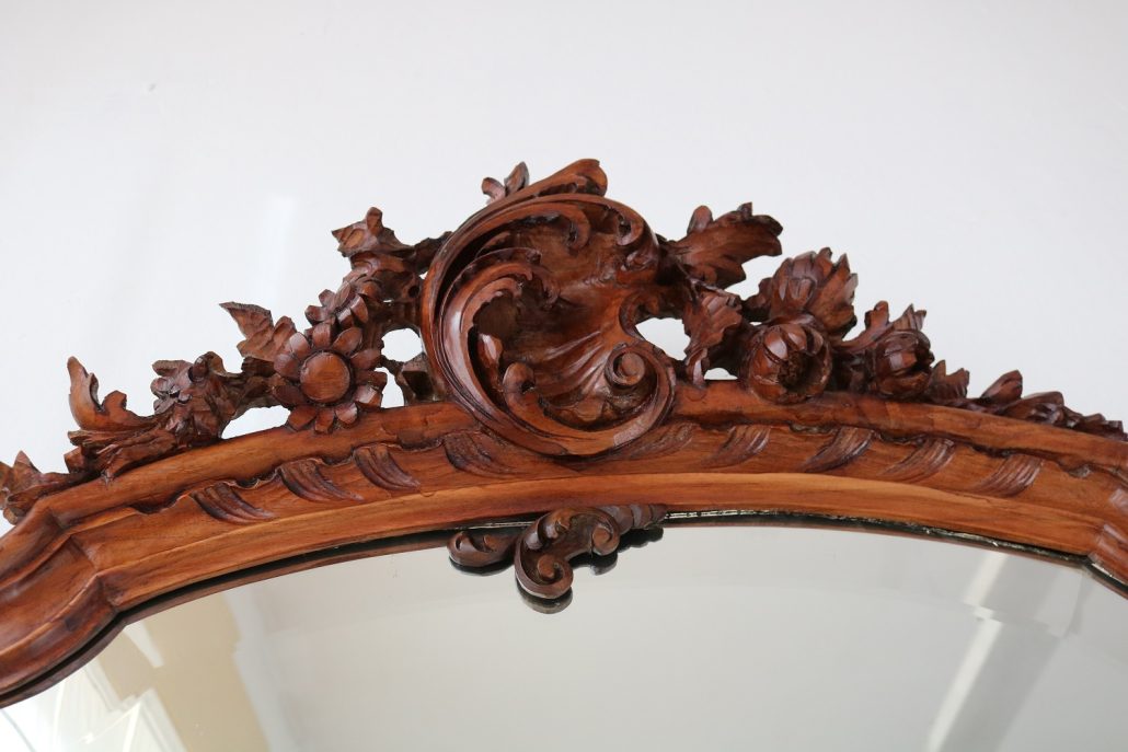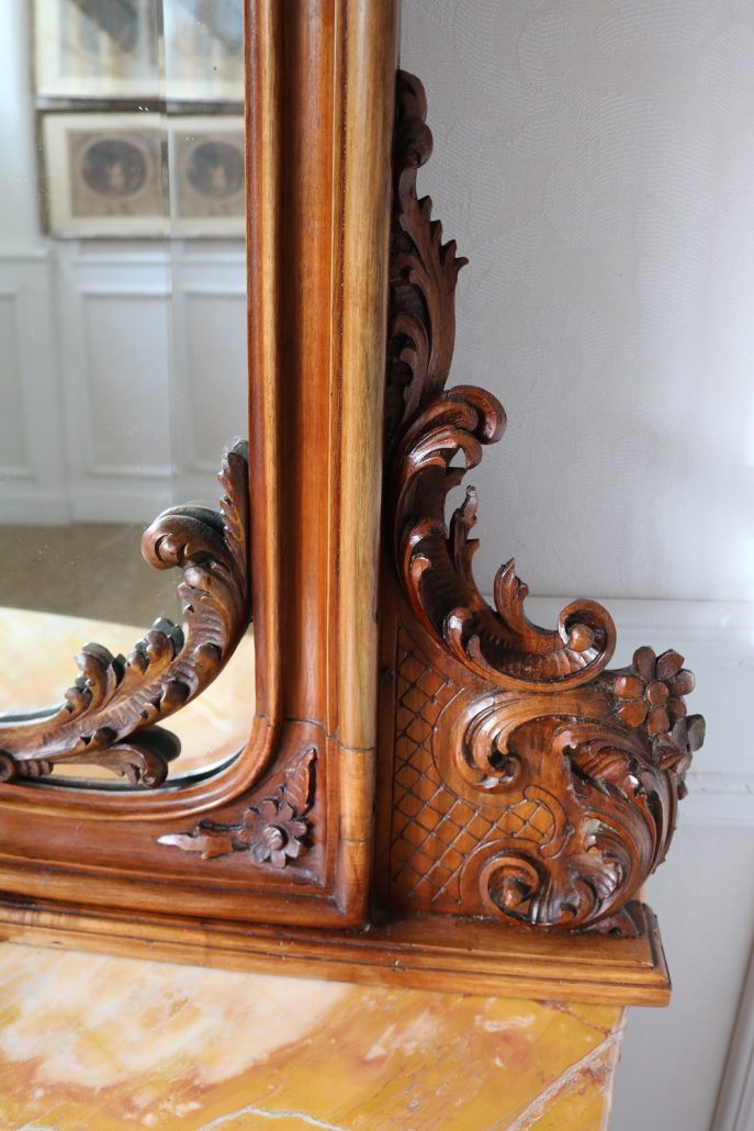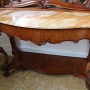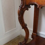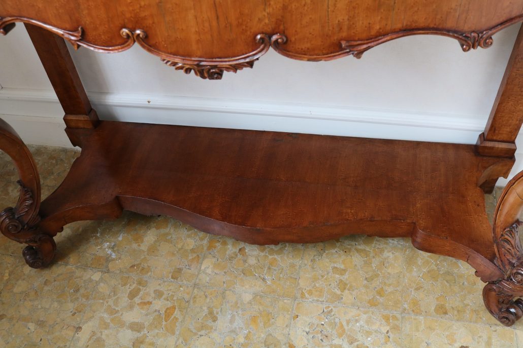 Consolle con specchiera in noce. Tavolo parietale costituito da due gambe mosse riccamente intagliate con volute fogliacee e ghirlande fiorite. Un’alta fascia sottopiano si contrappone alla ricca decorazione delle gambe con un’ampia riserva liscia decorata da un lieve motivo intagliato nella parte inferiore, mentre sotto il piano, in marmo color pesca, si presenta un motivo ricorrente a ovuli. Nella parte inferiore, un ulteriore piano alquanto mosso raccorda le gambe. Sul piano superiore poggia un’alta specchiera ingentilita da una cornice sagomata e arricchita nella parte centrale inferiore da un sinuoso movimento e decorata da una sorta di mensole laterali riccamente intagliate a motivi floreali. Nella parte alta un’elaborata decorazione ad intaglio troneggia con al centro un conchiglione. Di grande eleganza con una figura leggera e sinuosa, il mobile, pur essendo di grandi dimensioni, risulta sobrio anche se importante. La ricca decorazione, ottenuta con la tecnica dell’intaglio, rivela grande maestria e ricercatezza, come anche l’elegante proporzione e la raffinata composizione.