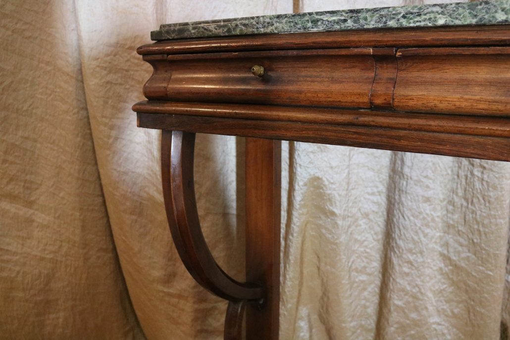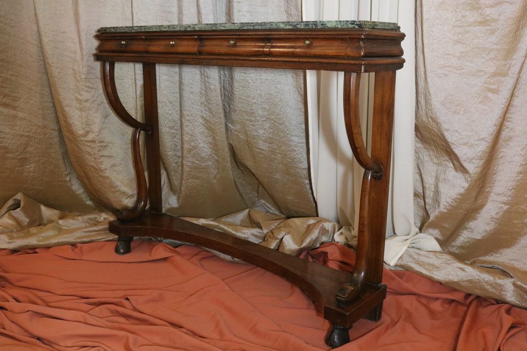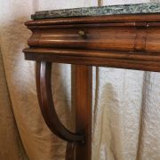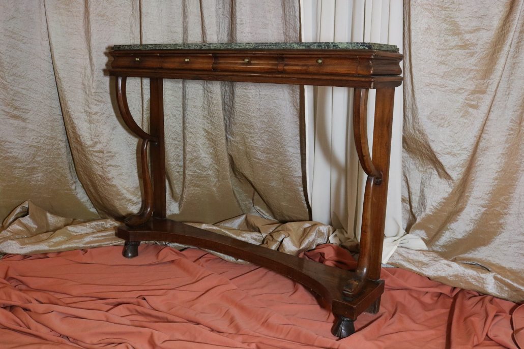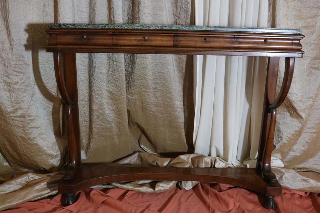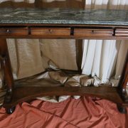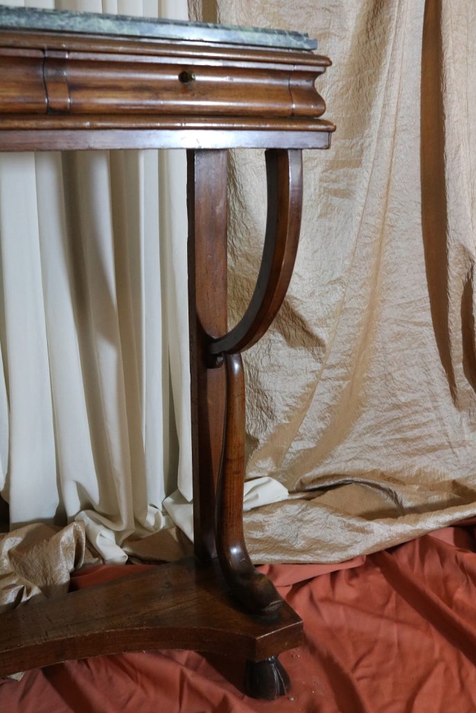 Consolle in noce. Arredo costituito da una fascia modanata contenente quattro piccoli cassetti muniti di piccoli pomoli in ottone. Piano in marmo grigio/verde semi incassato all’interno di una cornice. Il tutto retto da due gambe posteriormente e due elementi arcati sostenuti a loro volta da due elementi a foggia di animali fantastici appena abbozzati. Tutta la composizione poggia su un piano dalla forma concava e caratterizzato da un’alta fascia staccata da terra da quattro piedi caprini. Il mobile di piacevole composizione si ispira a modelli di gusto impero-restaurazione non raggiungendo però sia in proporzioni che in qualità di intaglio i modelli. Pregevole comunque nel risultato compositivo, il mobile rappresenta in se il desiderio stilistico del suo tempo.