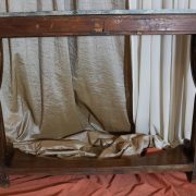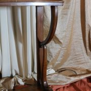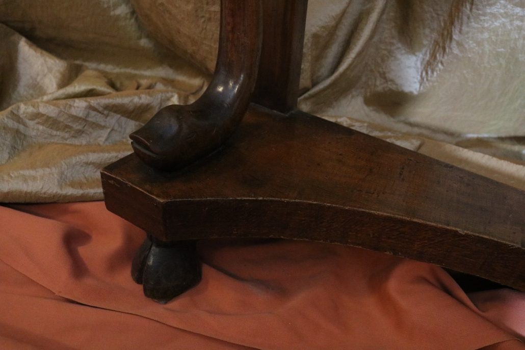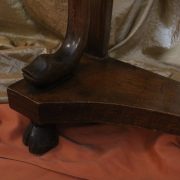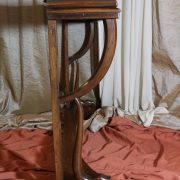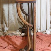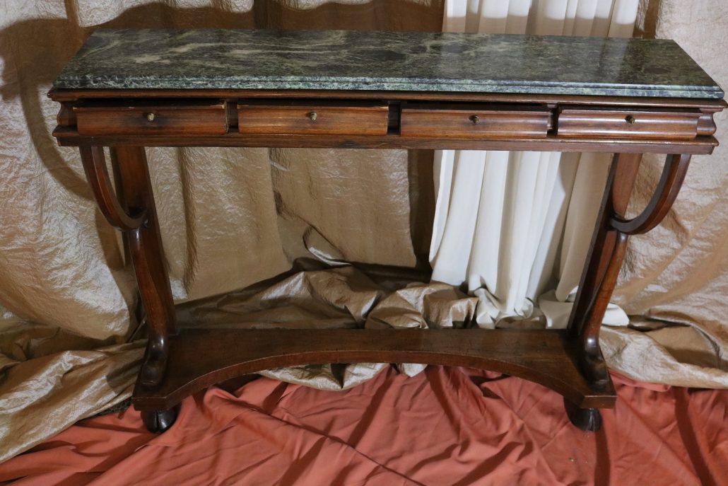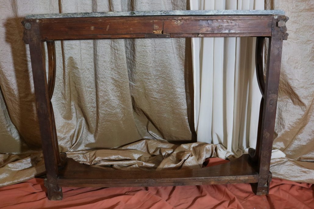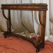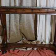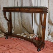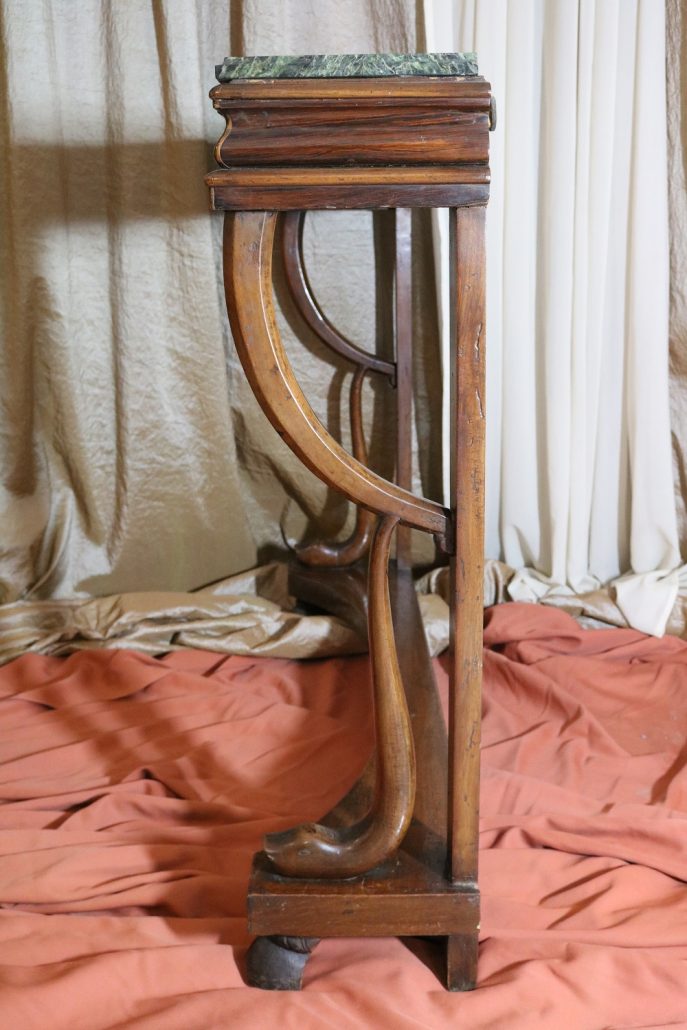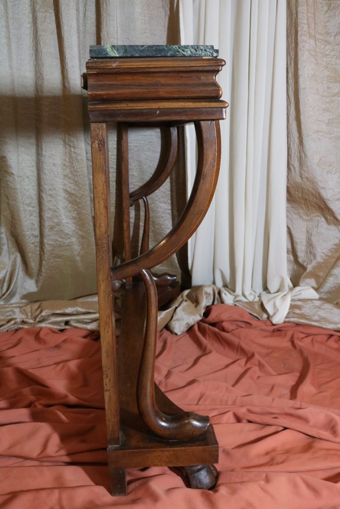 Consolle in noce. Arredo costituito da una fascia modanata contenente quattro piccoli cassetti muniti di piccoli pomoli in ottone. Piano in marmo grigio/verde semi incassato all’interno di una cornice. Il tutto retto da due gambe posteriormente e due elementi arcati sostenuti a loro volta da due elementi a foggia di animali fantastici appena abbozzati. Tutta la composizione poggia su un piano dalla forma concava e caratterizzato da un’alta fascia staccata da terra da quattro piedi caprini. Il mobile di piacevole composizione si ispira a modelli di gusto impero-restaurazione non raggiungendo però sia in proporzioni che in qualità di intaglio i modelli. Pregevole comunque nel risultato compositivo, il mobile rappresenta in se il desiderio stilistico del suo tempo.