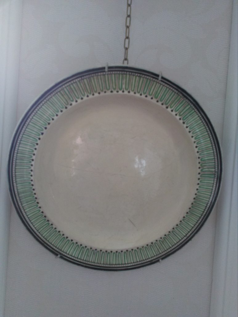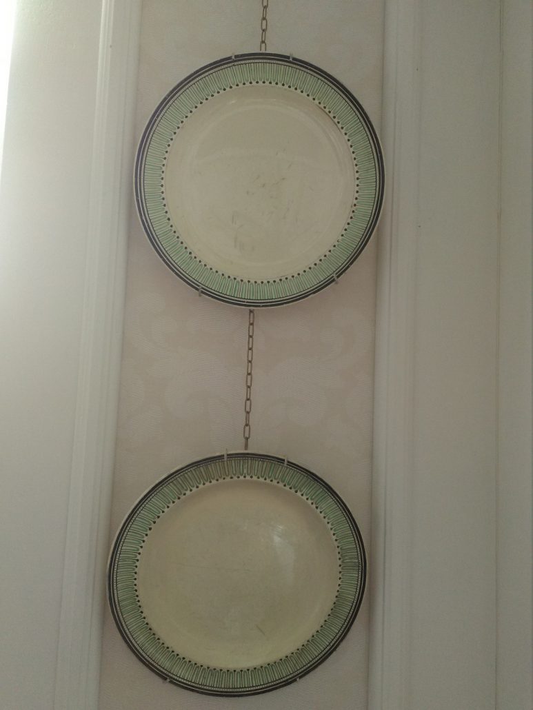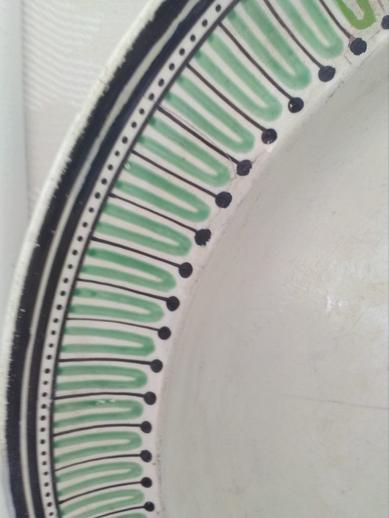 Coppia di piatti in ceramica della manifattura di Wedgwood. Appartenenti ad un servizio da tavola, questi piatti, recano una decorazione geometrica in colore verde con rifiniture nere.