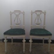 Coppia di sedie laccate . Schienale a giorno decorato da una cartella centrale a foggia di lira . Sedile imbottito e rivestito in velluto di lino verde. Gambe tronco-coniche rovesciate,rastremate desinenti in puntale con collare scanalato inprossimità al dado di accordo con il sedile. L’ elegante decorazione dello schienale , la medesima lavorazione presente in tutte e quattro le gambe ripropone i più classici modelli neoclassici del Luigi XVI, ancor più alleggeriti dalla laccatura bianca. Questi arredi quindi presentano una leggerezza e raffinatezza di grande gusto.