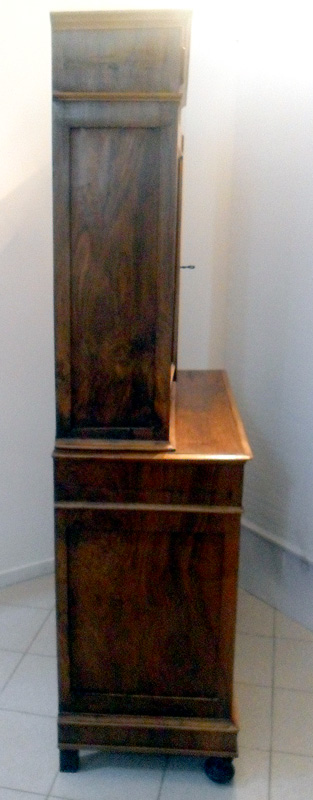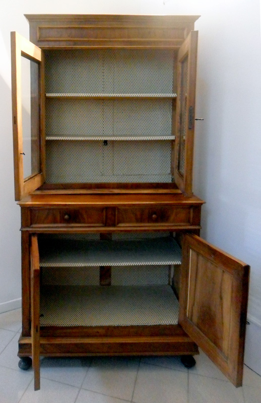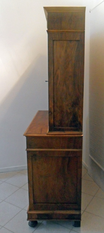 Credenza umbertina a due corpi impiallacciata in noce. Costituita da due ante e due cassetti nella parte bassa e due ante a vetri nella parte alta. Piedi anteriori a cipolla, decorazioni con cornici. Interno in pioppo foderato con carta a giglio.