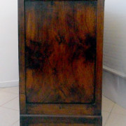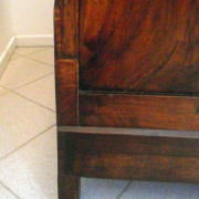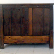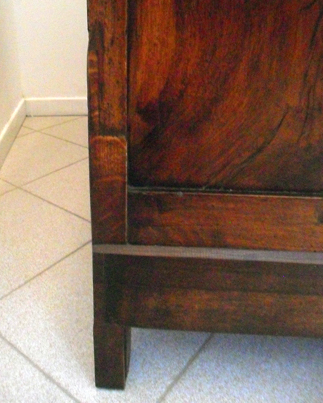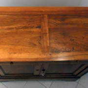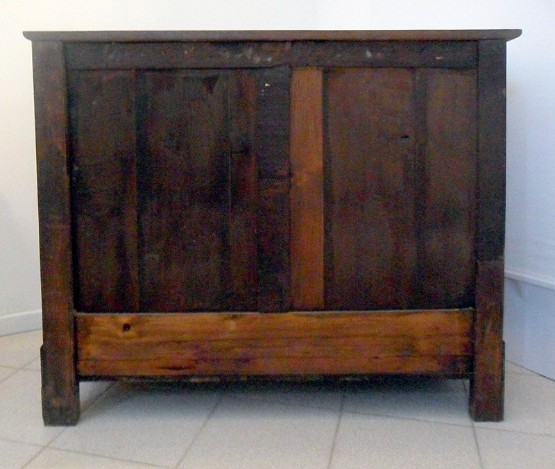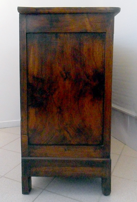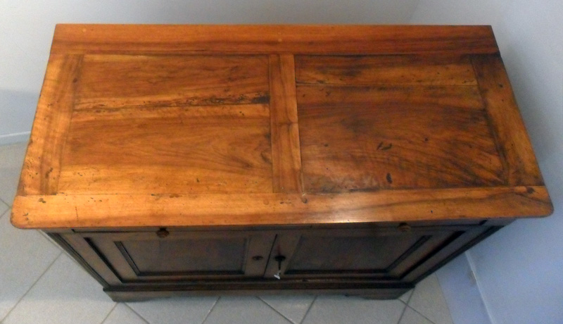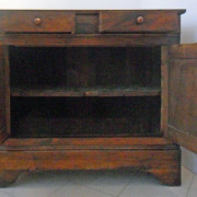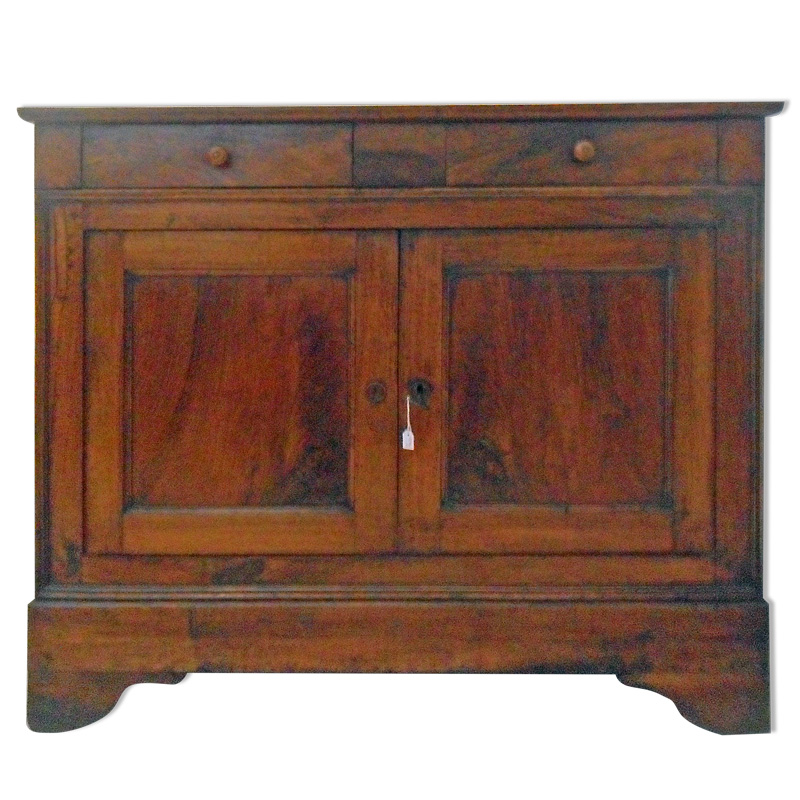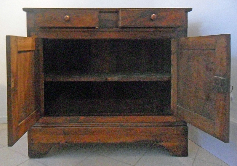 Credenza in noce massello. Costituita da due ante a fodrina e due cassetti, piano a riquadri e piedi a mensola.