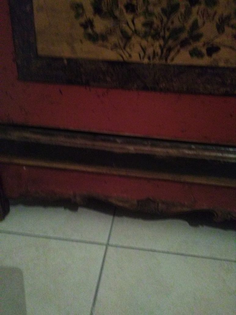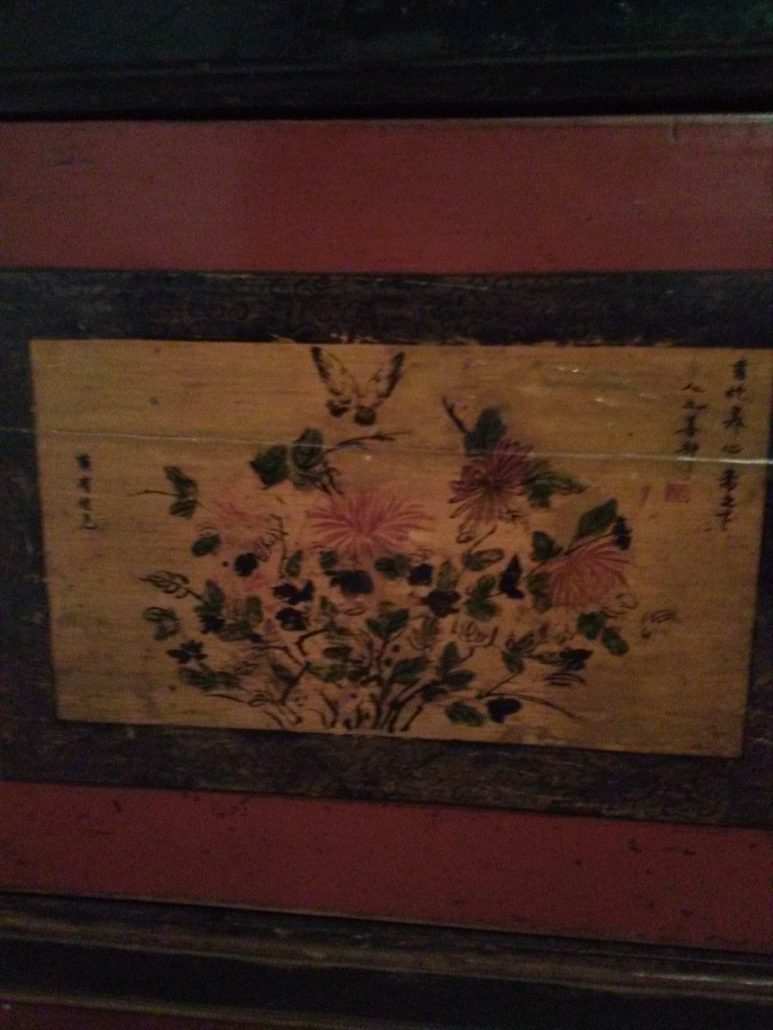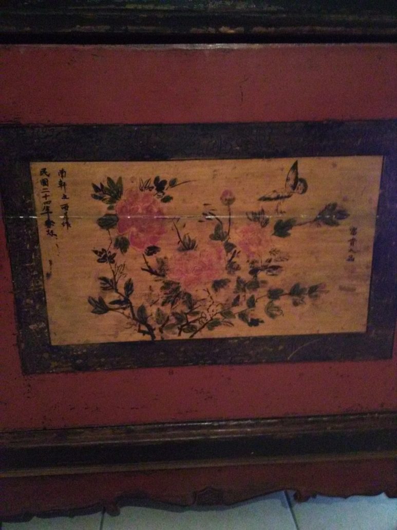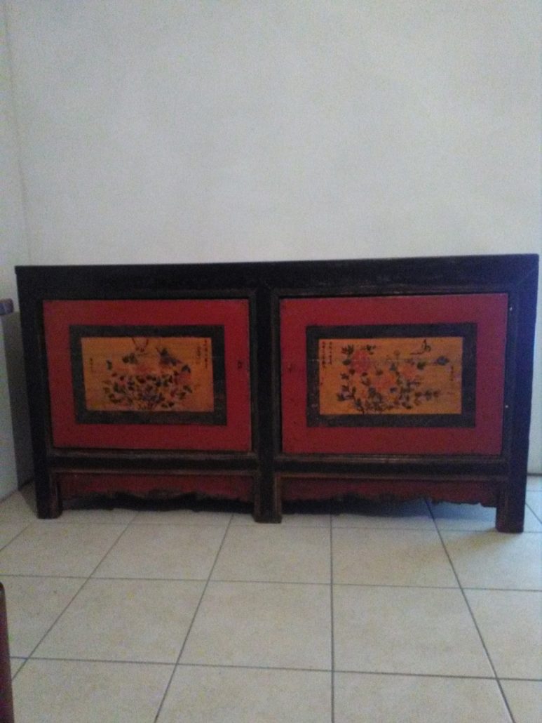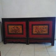 Credenza cinese in legno laccato , composta da due ante sulle quali campeggiano due riserve gialle con motivi floreali dipini incorniciati da una laccatura rossa. Il resto del mobile è laccato in nero.
